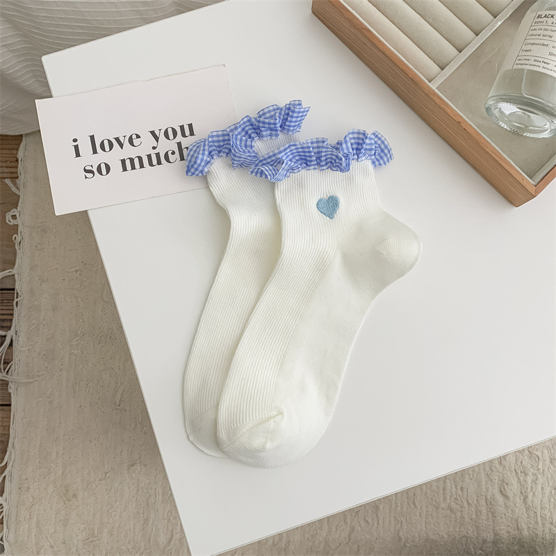 블루 격자 무늬 레이스 양말 여성 짧은 튜브 봄과 여름 소녀 양말 회색 파란색 사랑 자수 양말 여성 JK 스타일스토어 가기