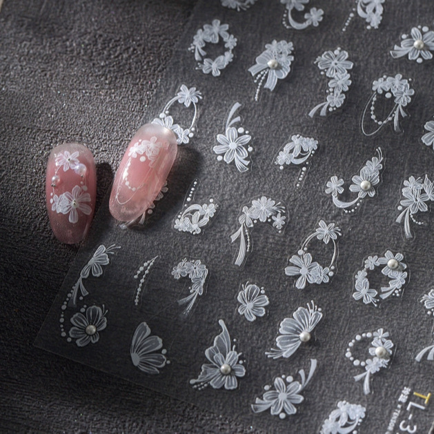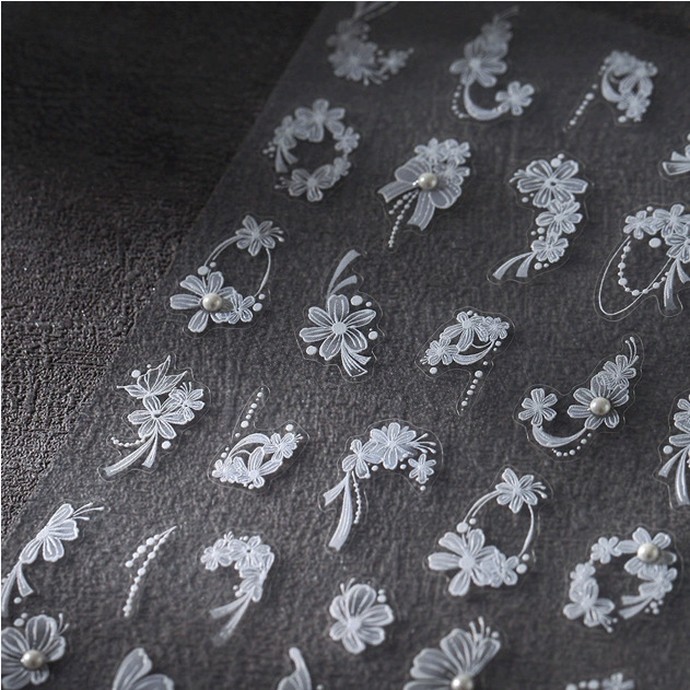 진주 화이트 거즈 꽃 네일 아트 스티커 슈퍼 요정과 우아한 화이트 의류 백 접착제 네일 데칼 달콤한 장식 도매