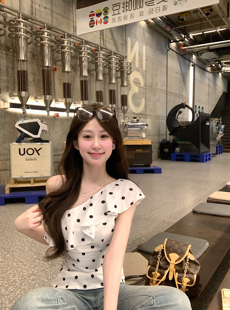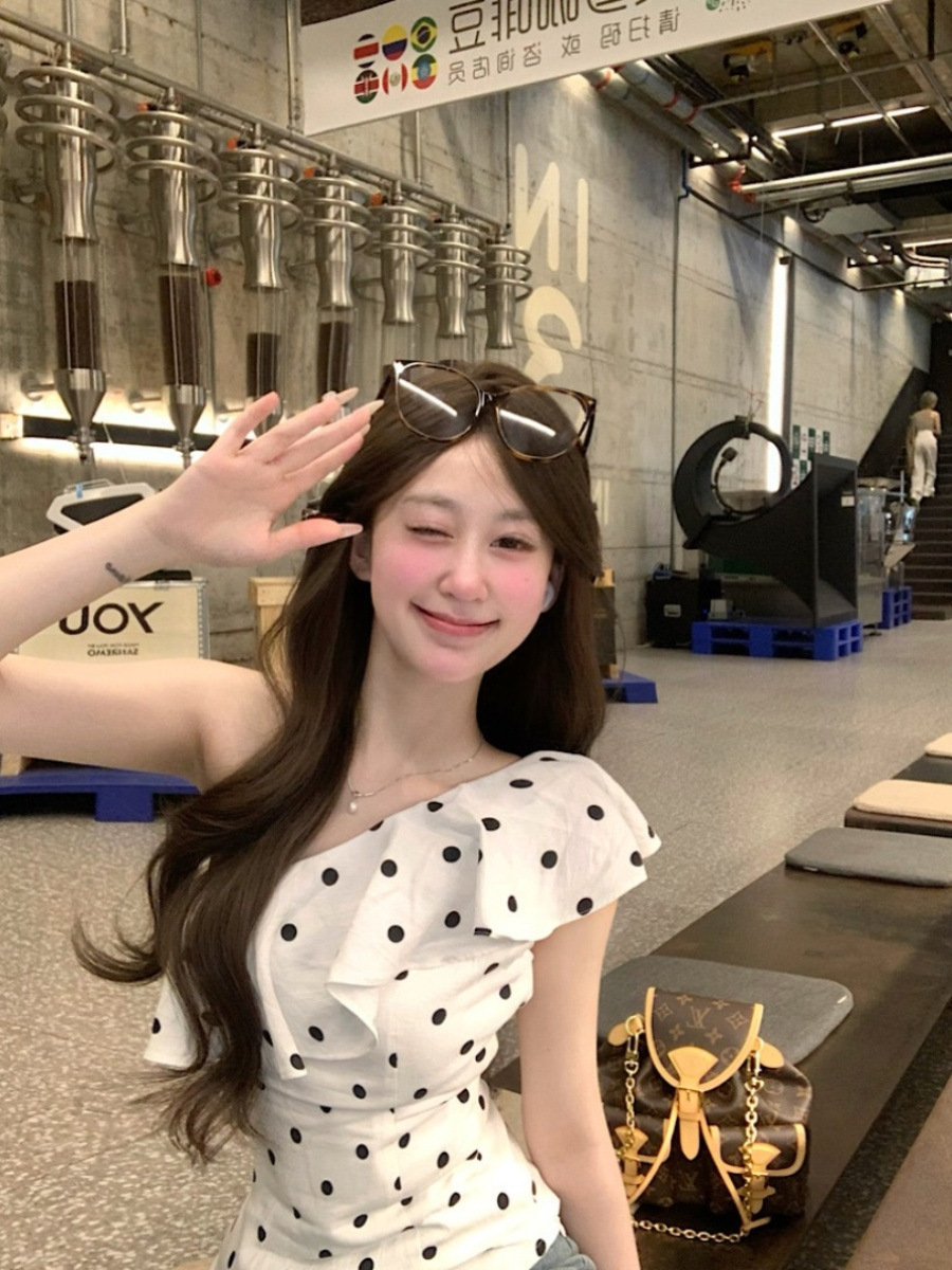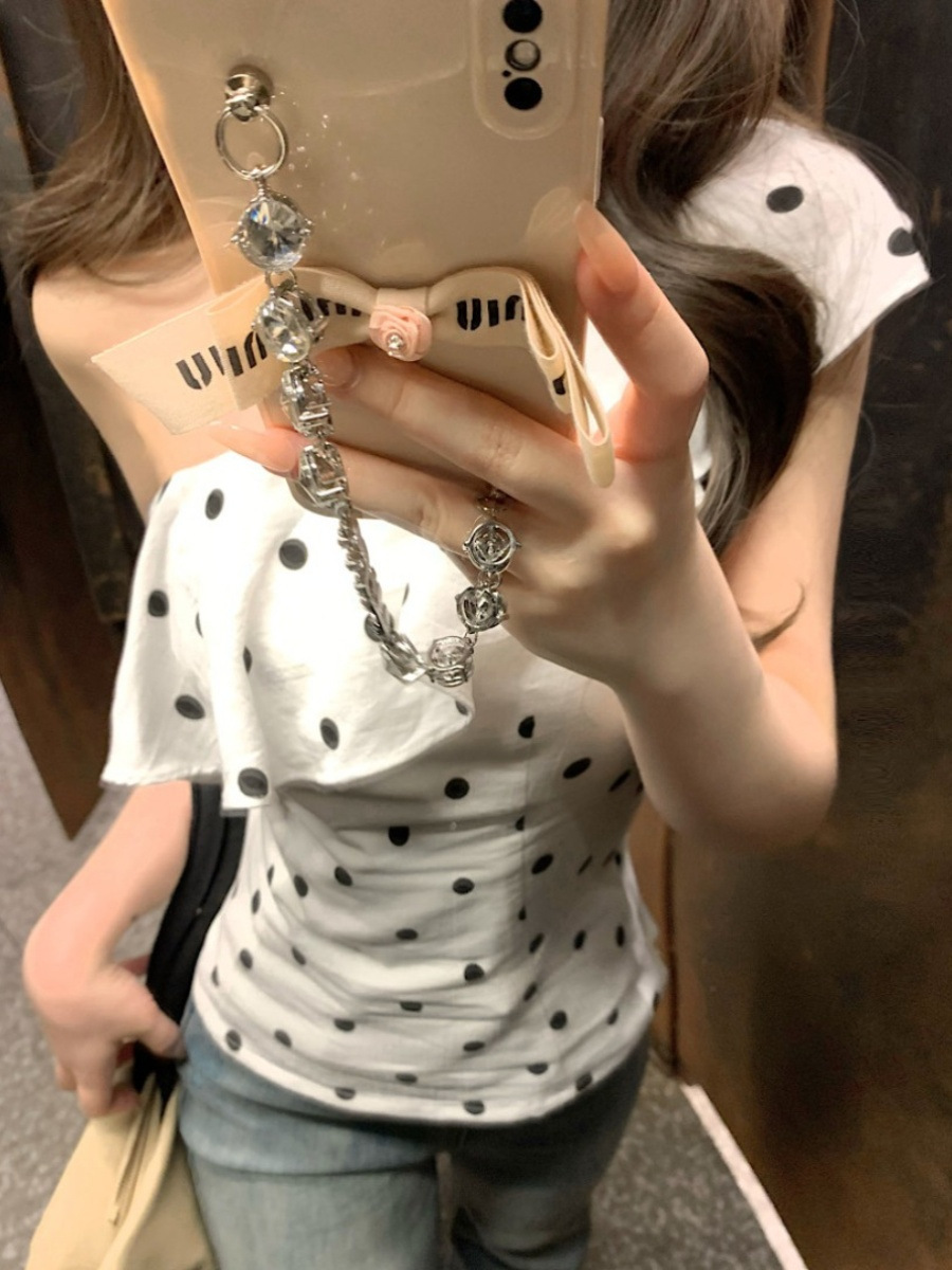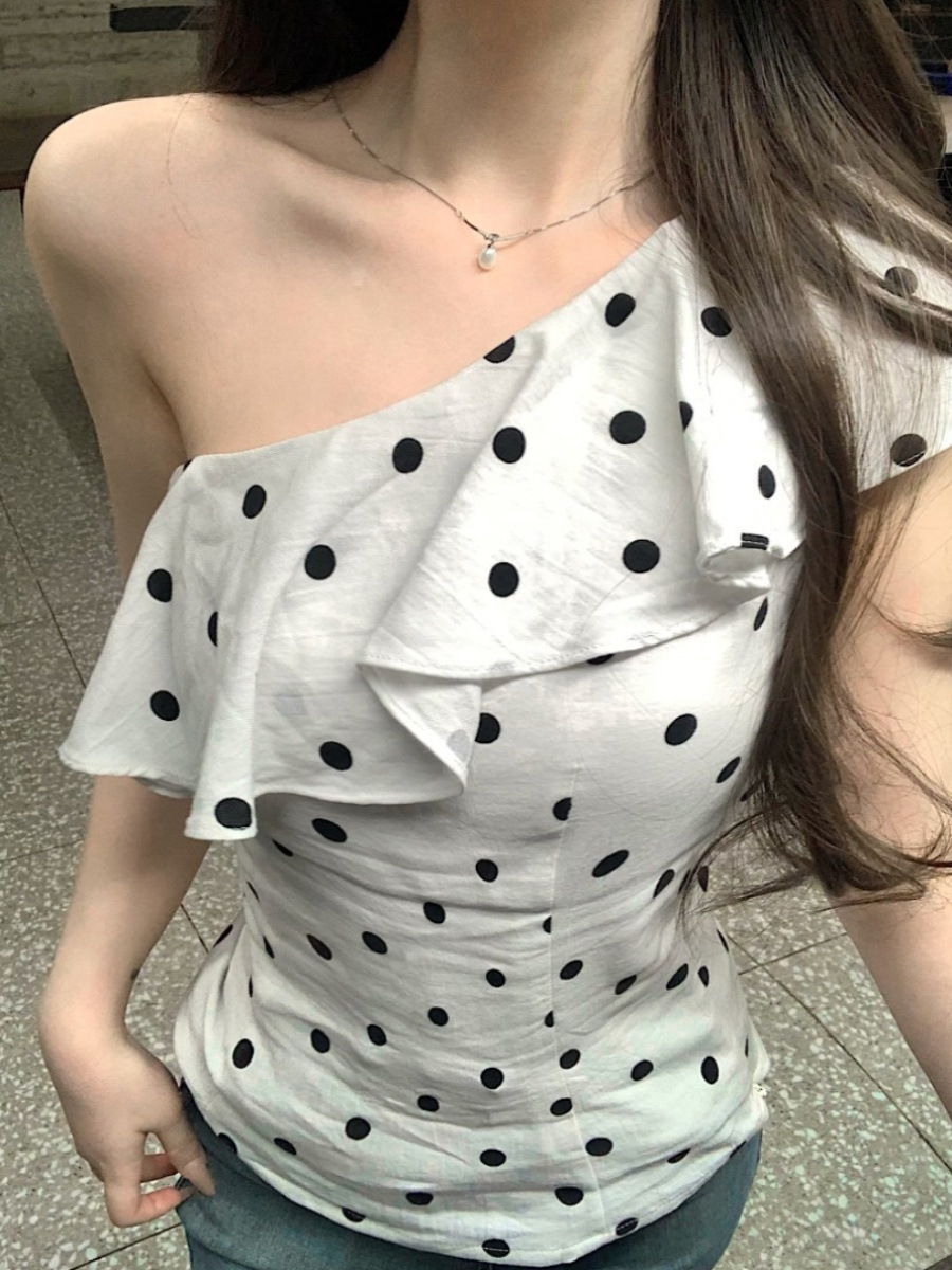여름 슬림 디자인의 여성용 프렌치 러플 폴카 도트 오프 숄더 반팔 조끼, 달콤하고 매력적인 시크 아우터 탑스토어 가기