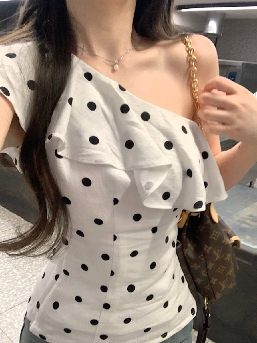여름 슬림 디자인의 여성용 프렌치 러플 폴카 도트 오프 숄더 반팔 조끼, 달콤하고 매력적인 시크 아우터 탑