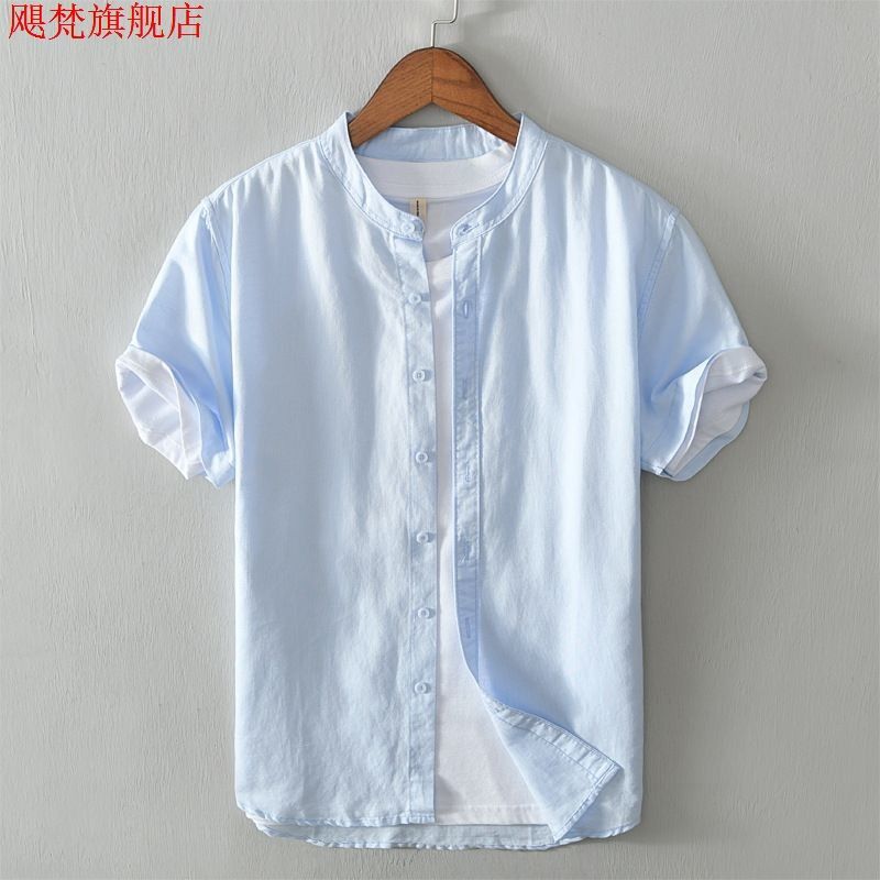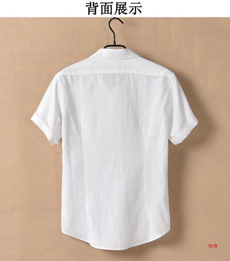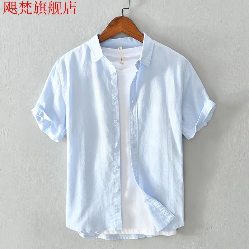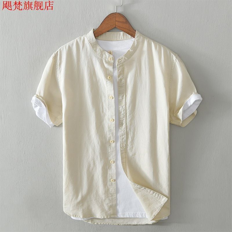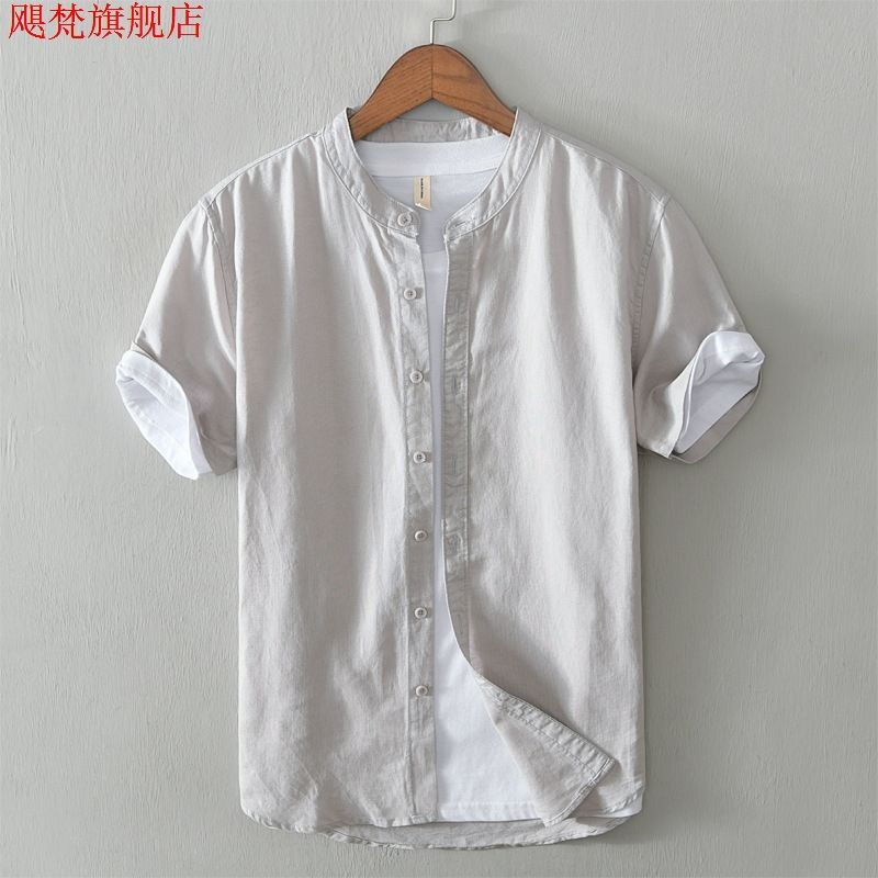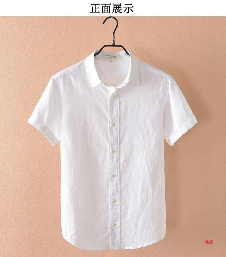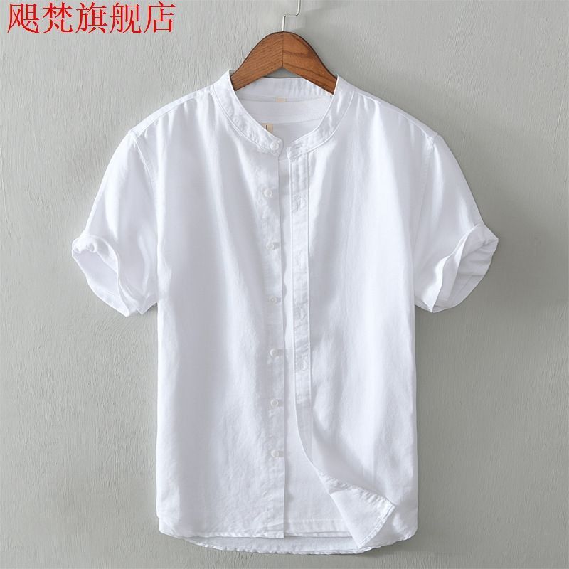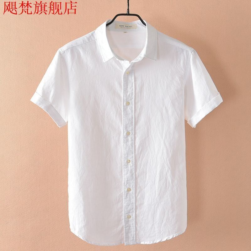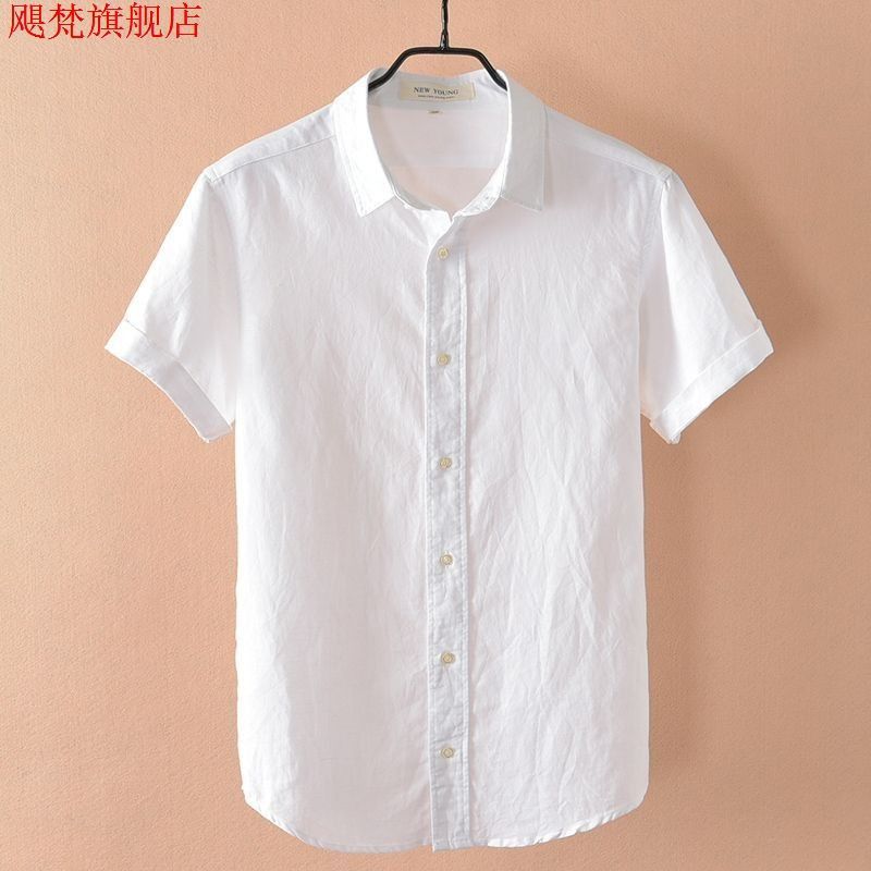 통기성 린넨 셔츠 남성용 반팔 슬림 탑 여름 얇은 옷깃 청소년 코튼 린넨 캐주얼 화이트 셔츠스토어 가기