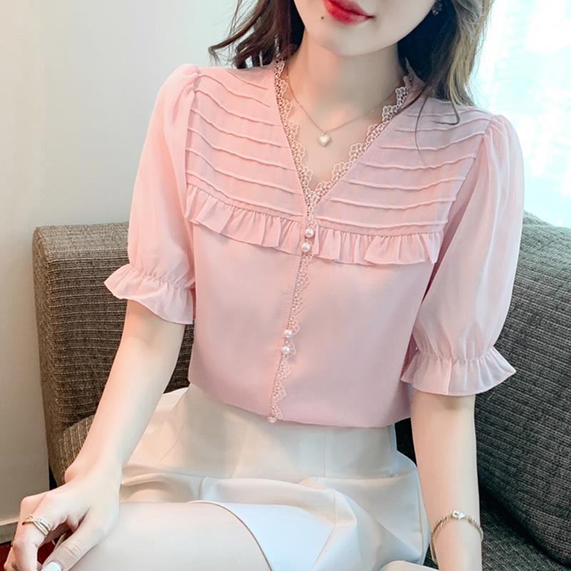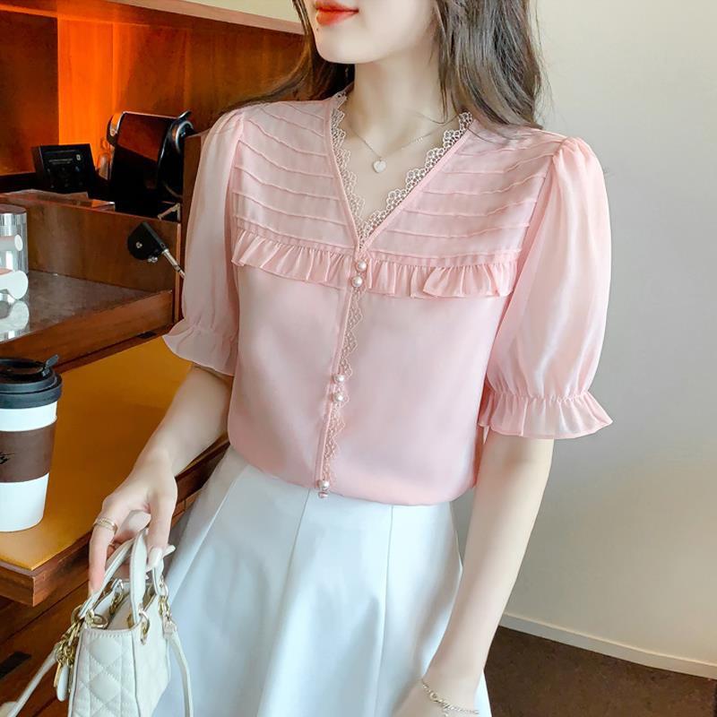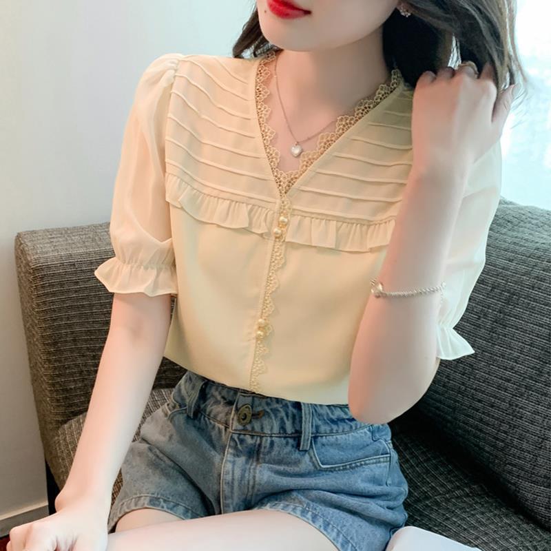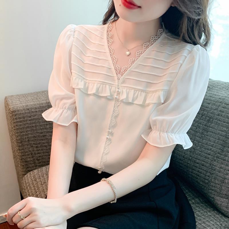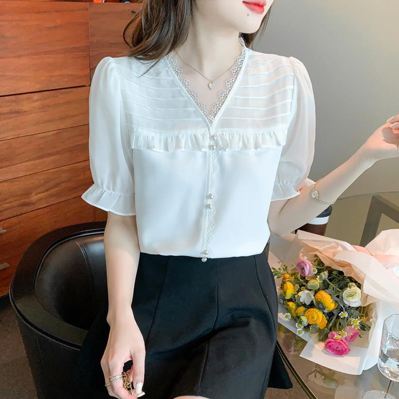 2023년 여름 신상 여성 프렌치 브이넥 화이트 탑, 패셔너블한 5부소매 쉬폰 셔츠, 패셔너블하고 트렌디한 스타일스토어 가기