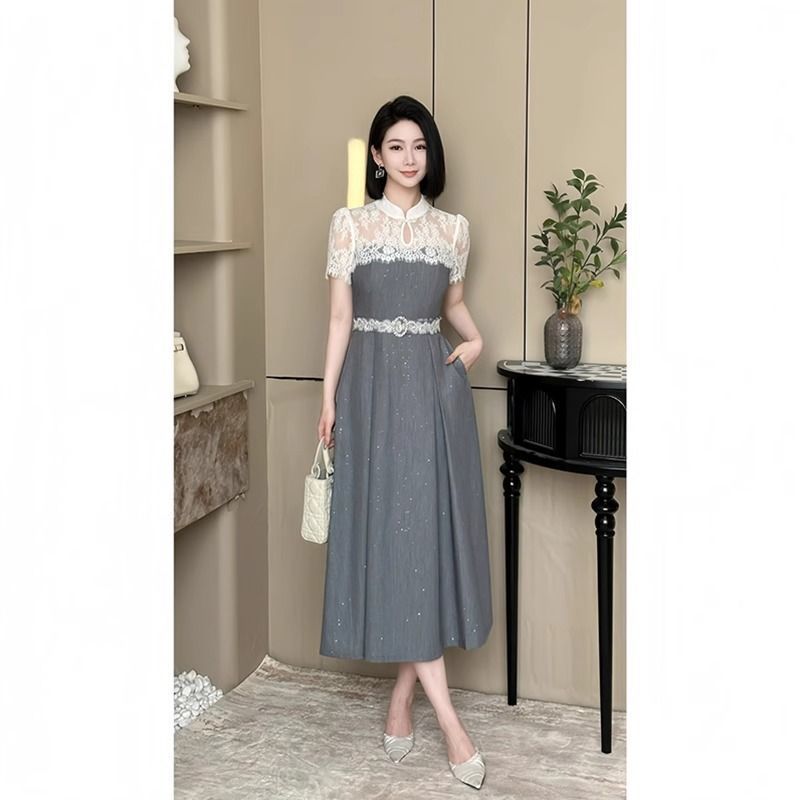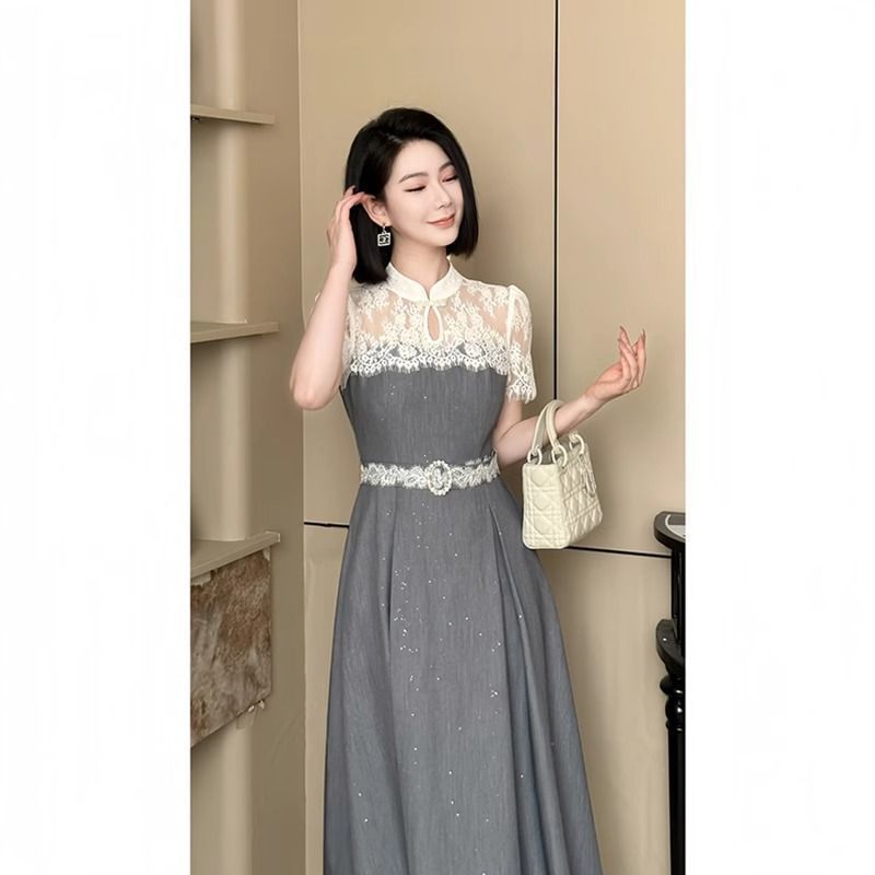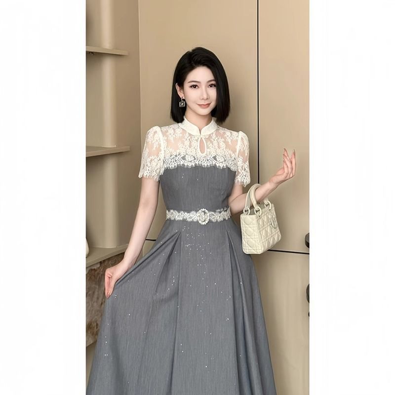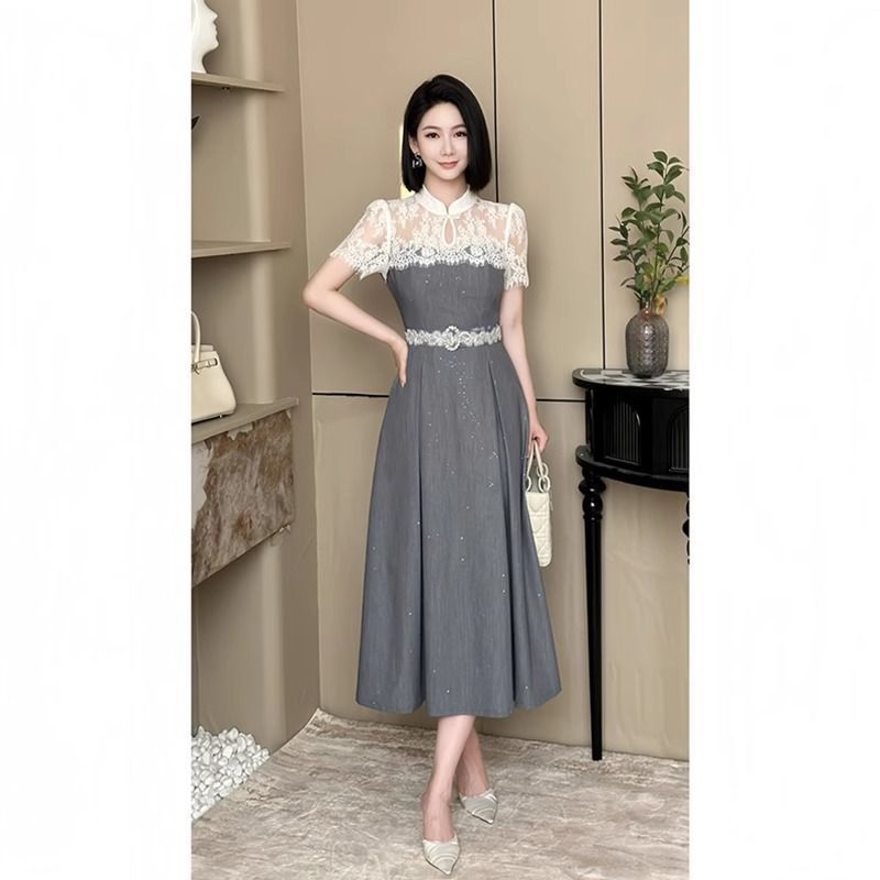 새로운 중국 스타일 간단한 레이스 헵번 스티칭 2025 원피스 허리 새 슬리밍 우아한 무릎 원피스스토어 가기