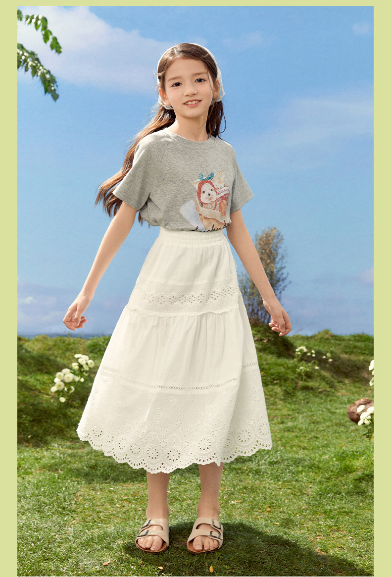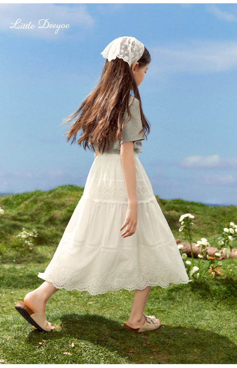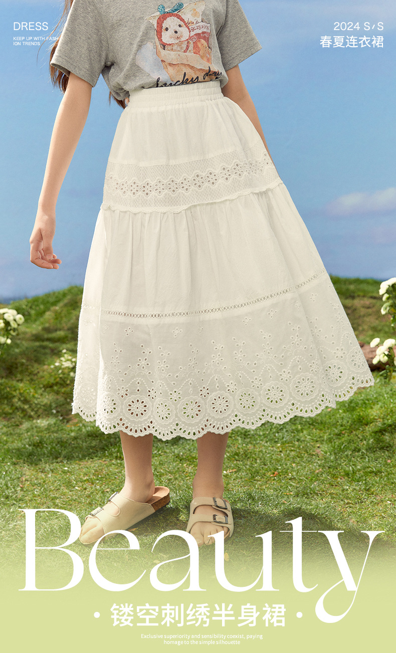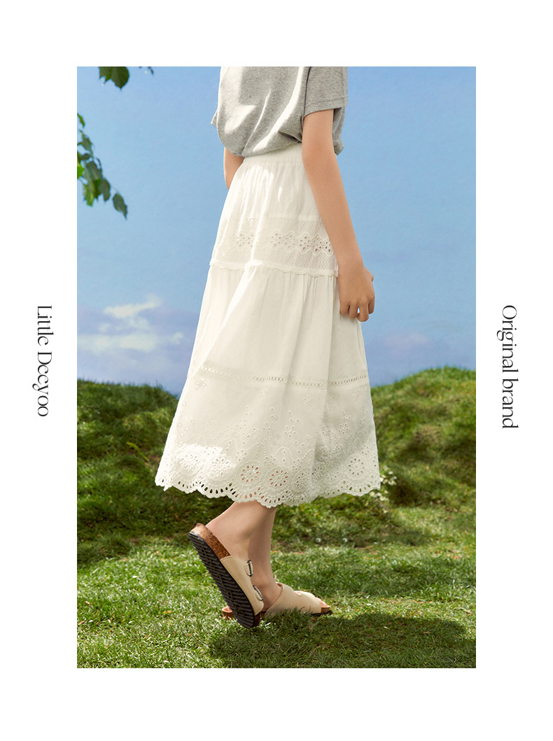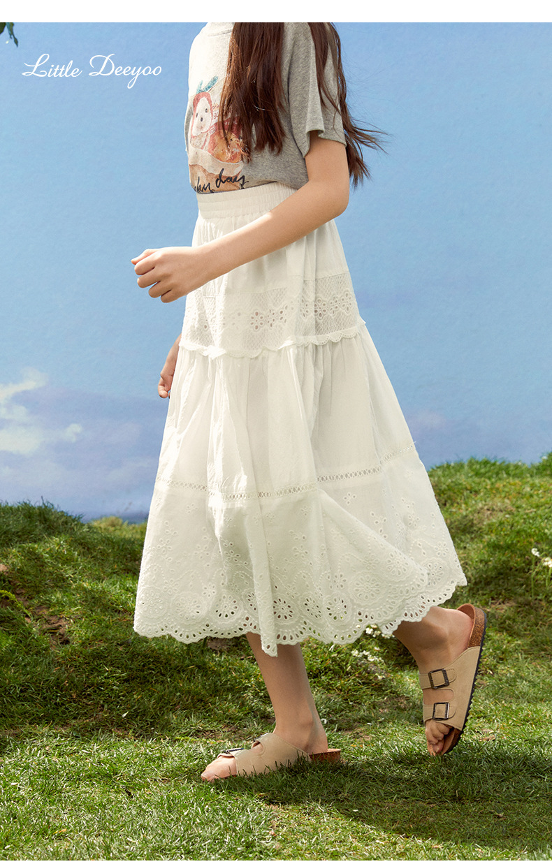 여자 속이 빈 자수 꽃 스커트 2025 봄 여름 새로운 스타일 어린 소녀 순수 코튼 피부 친화적인 다용도 A 라인 스커트