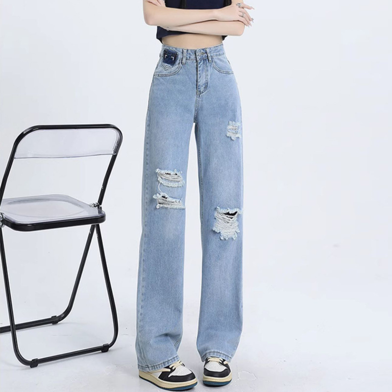 스트레이트 레그 청바지 여성 콘트라스트 컬러 여름 하이 웨이스트 캐주얼 루즈 하이 스트리트 페타이트 거지 리핑 와이드 레그 바지