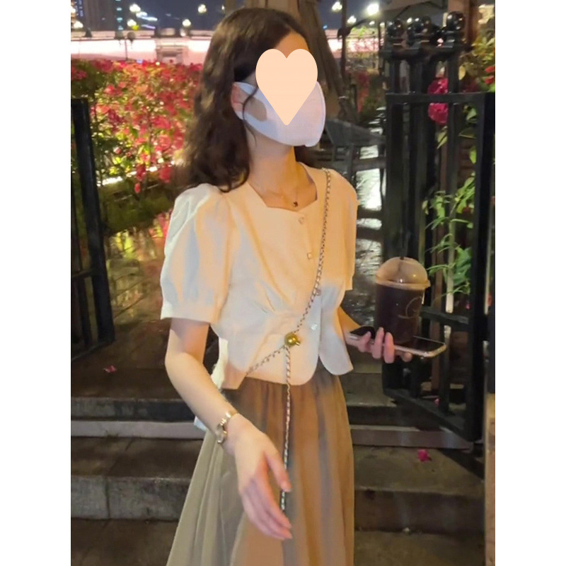 프랑스 셔츠 반팔 여성용 쉬폰 셔츠 2025 새로운 캐주얼 느슨한 슬리밍 퍼프 소매 짧은 치마 세트스토어 가기
