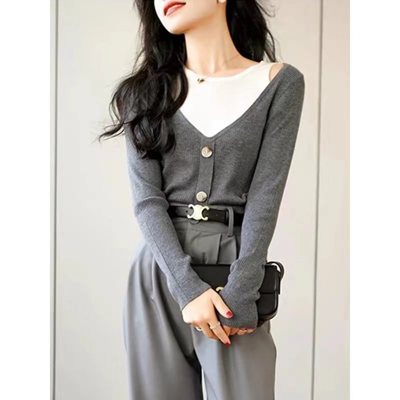 틈새 디자인 유행 가짜 투피스 레이어드 슬림 핏 슬리밍 스웨터 여성의 2023 년 초가을 새로운 스타일스토어 가기