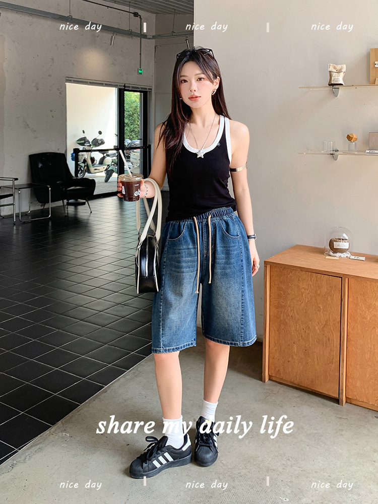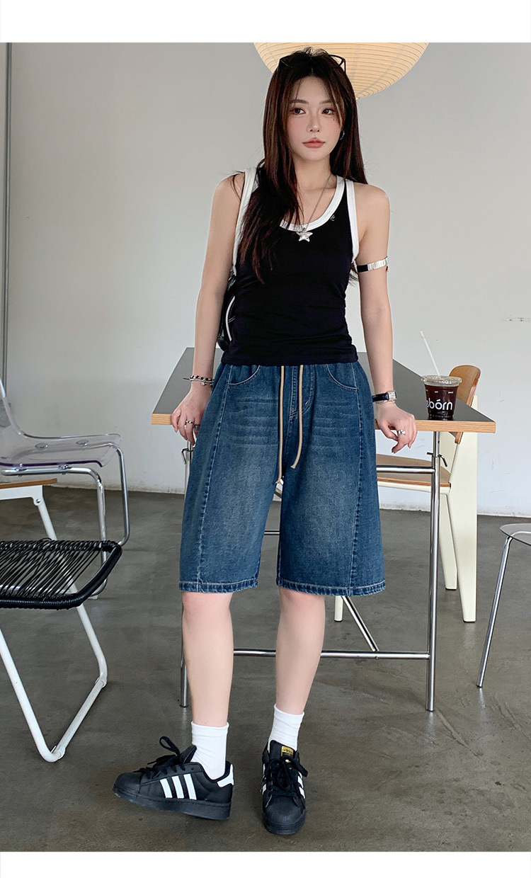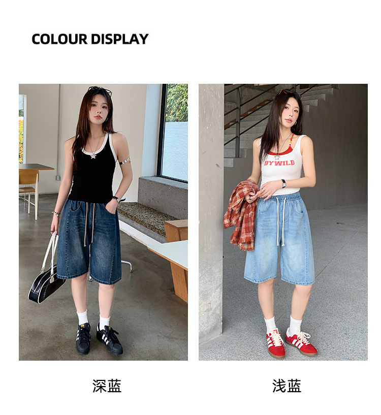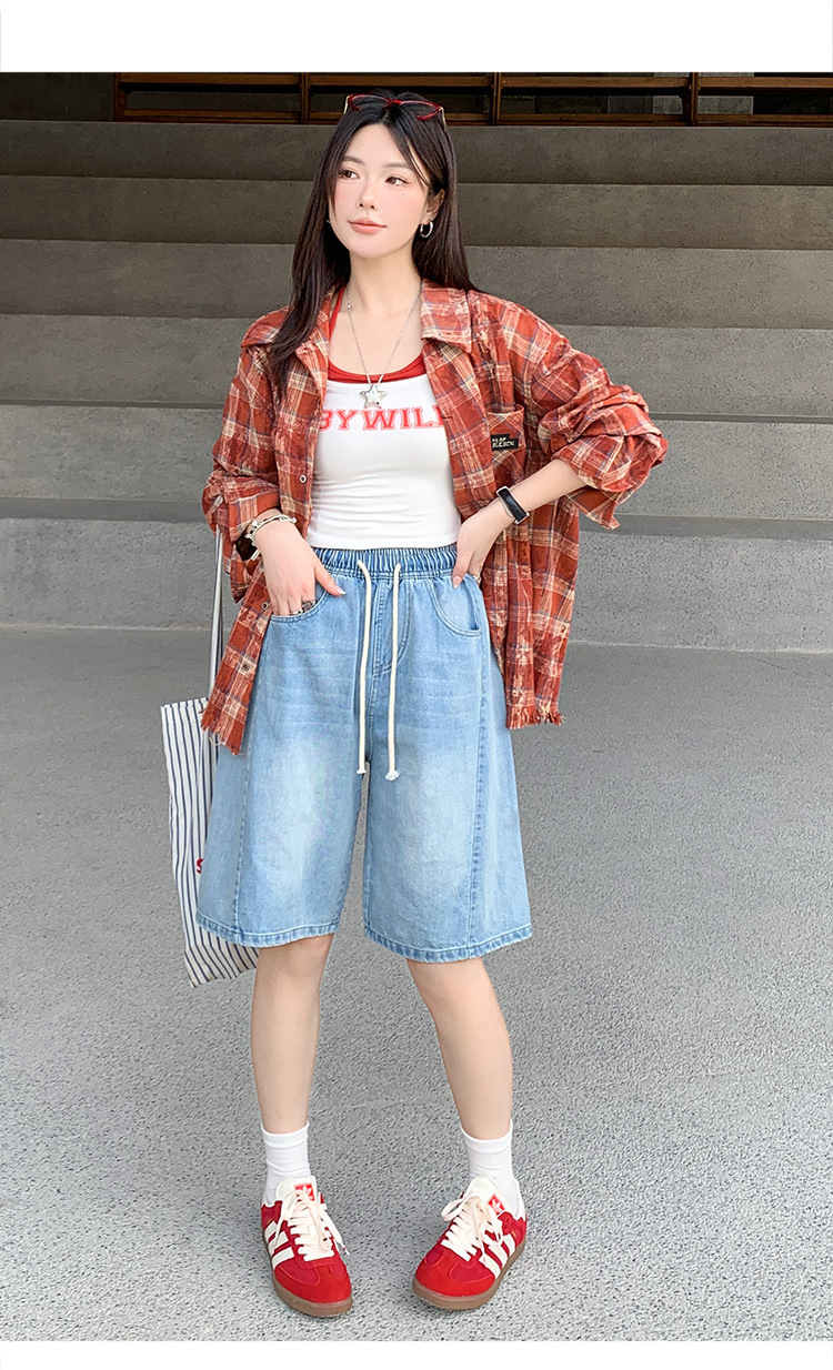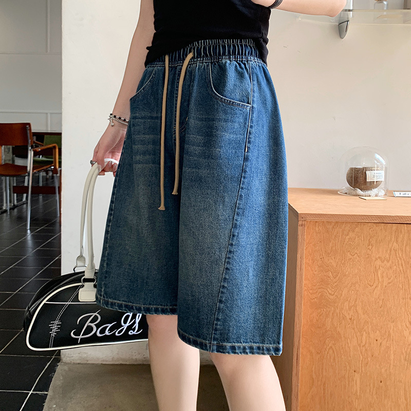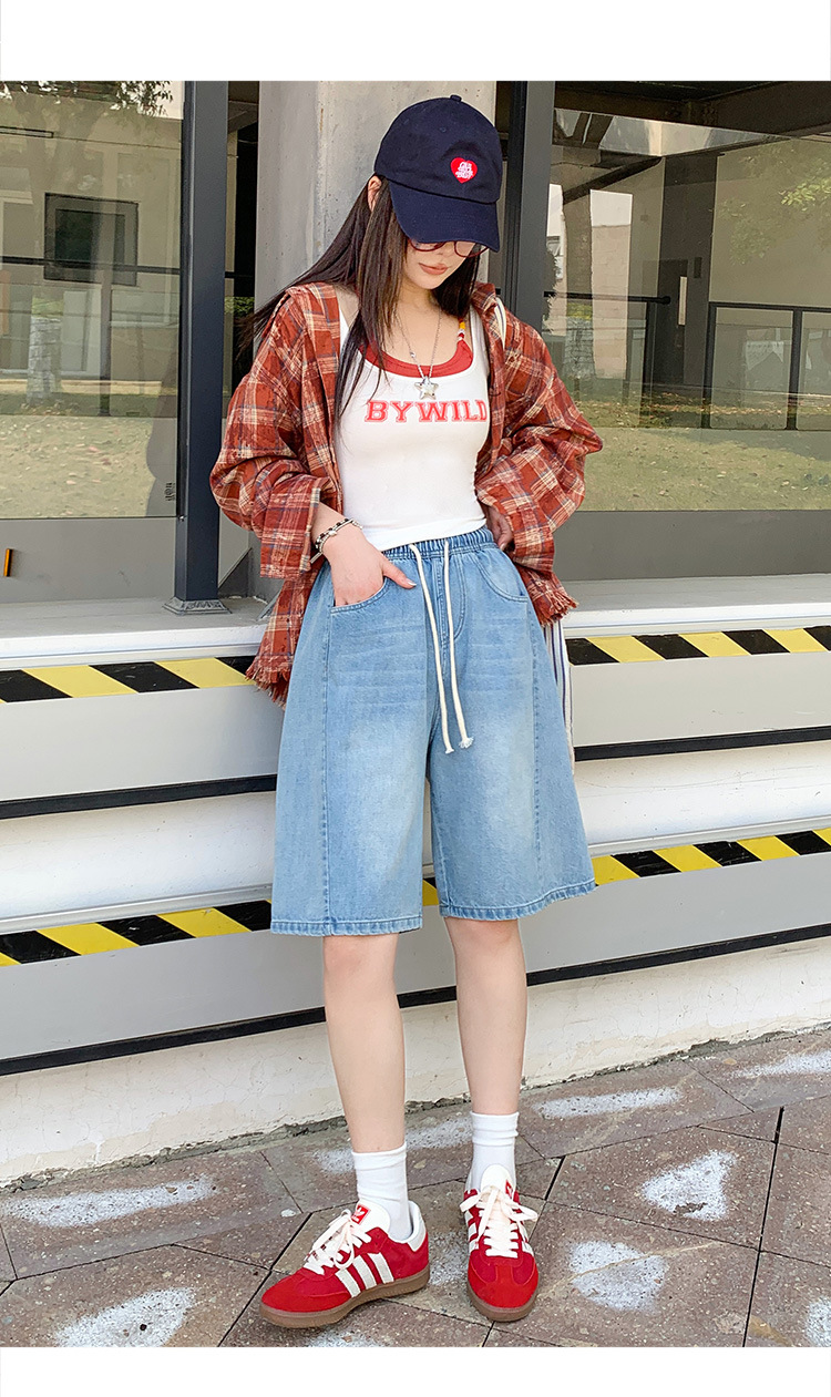 2025 년 여름 아메리칸 스타일 클래식 구식 레트로 데님 반바지 여성용 스트레이트 튜브 엘라 스토 릭 로우 웨이스트 파이브 포인트 바지스토어 가기