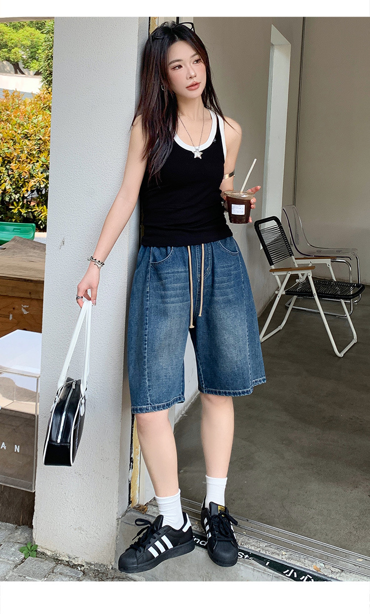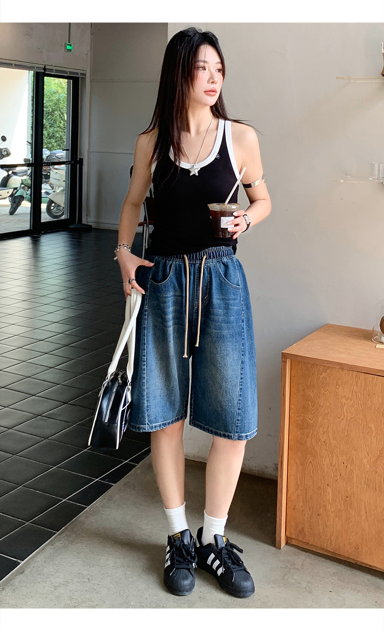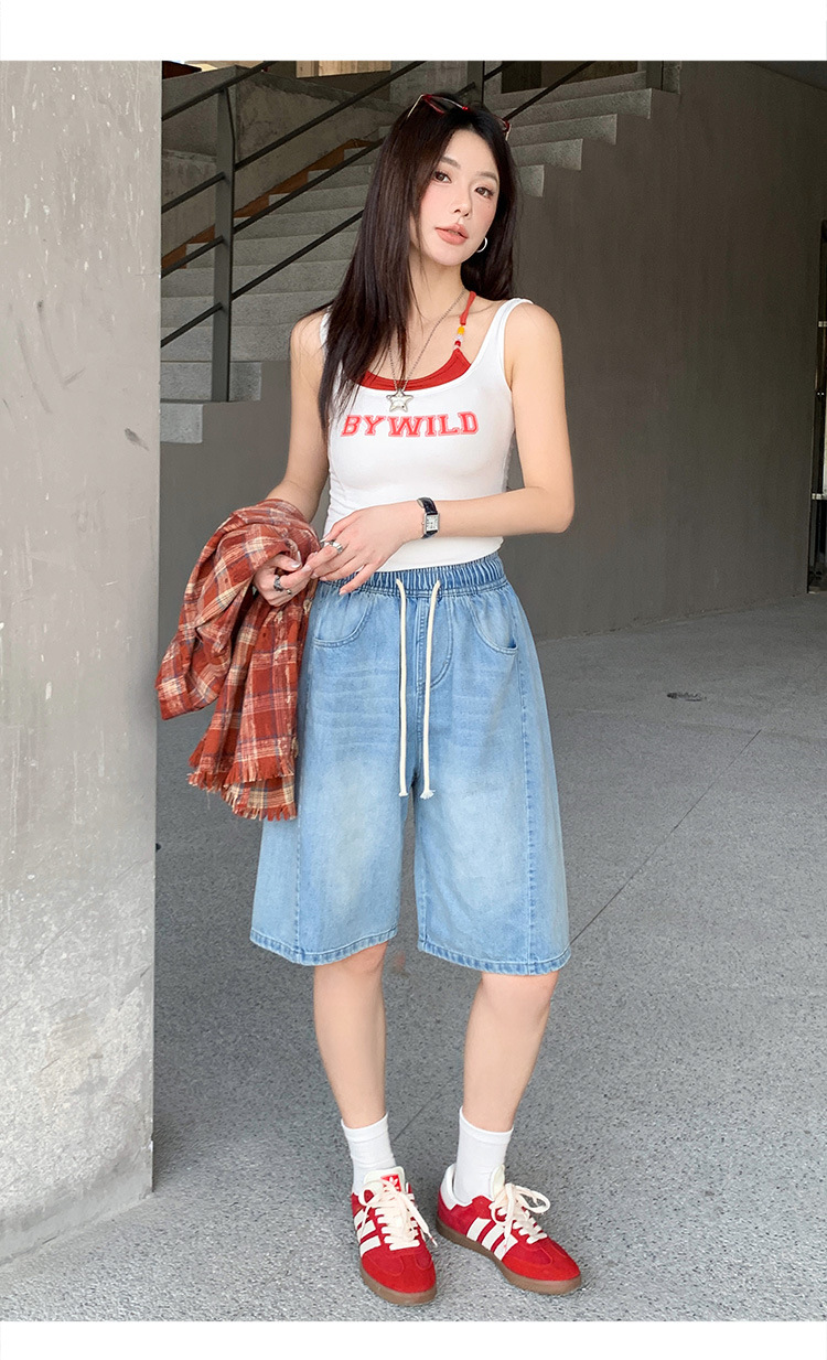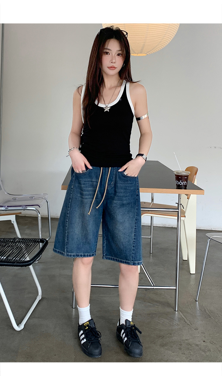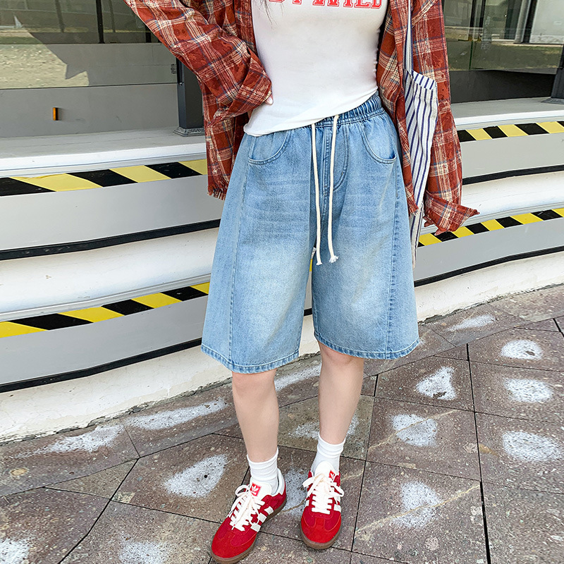 2025 년 여름 아메리칸 스타일 클래식 구식 레트로 데님 반바지 여성용 스트레이트 튜브 엘라 스토 릭 로우 웨이스트 파이브 포인트 바지스토어 가기