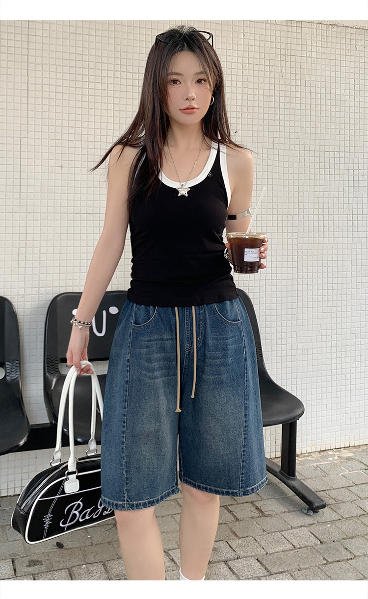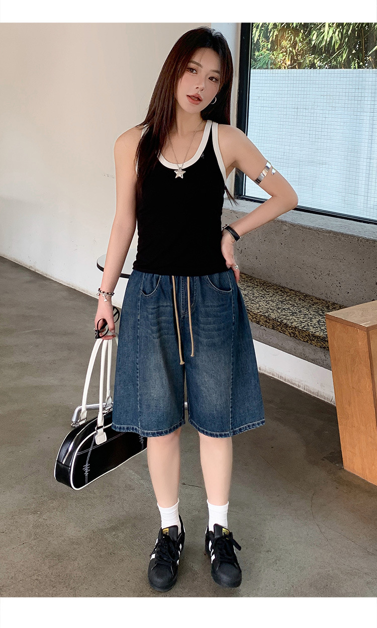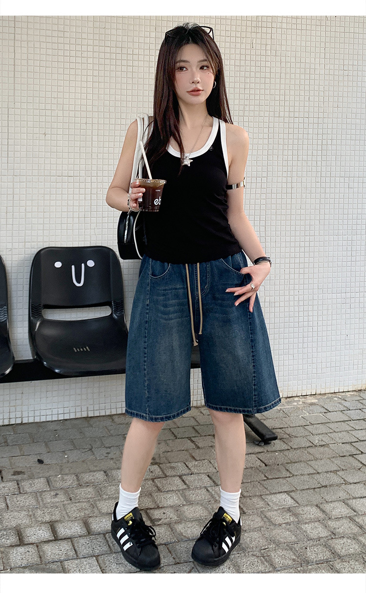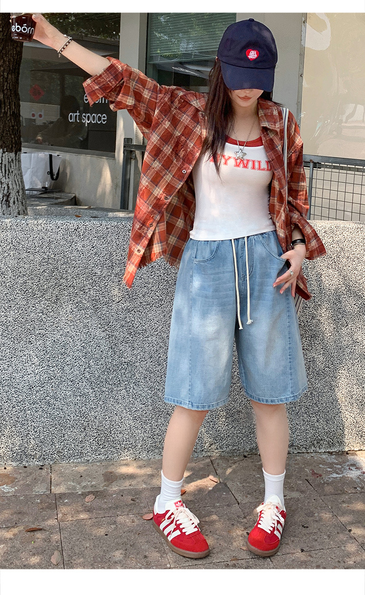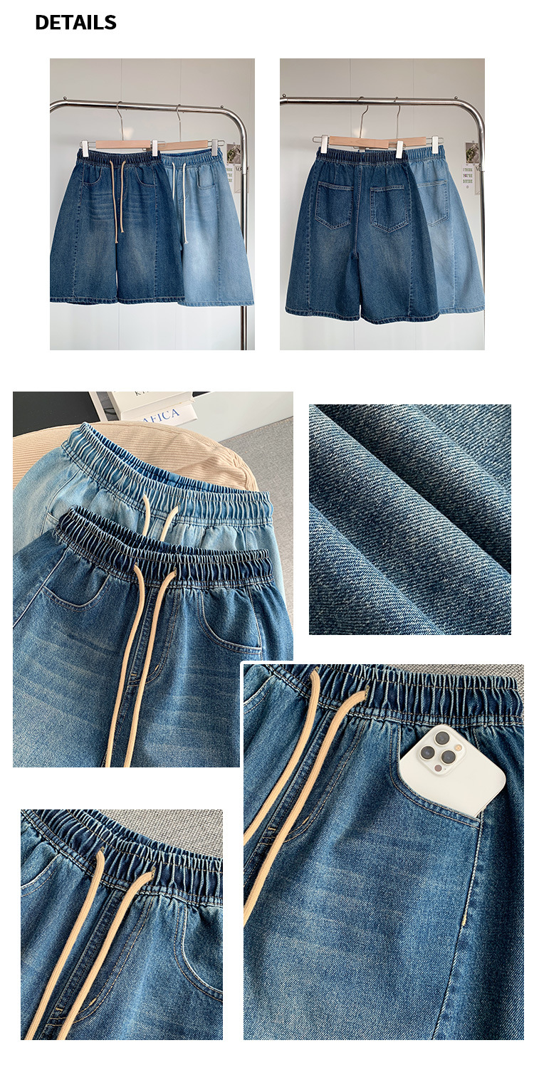 2025 년 여름 아메리칸 스타일 클래식 구식 레트로 데님 반바지 여성용 스트레이트 튜브 엘라 스토 릭 로우 웨이스트 파이브 포인트 바지스토어 가기