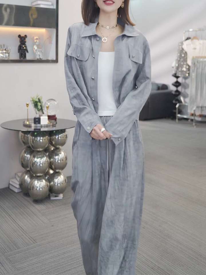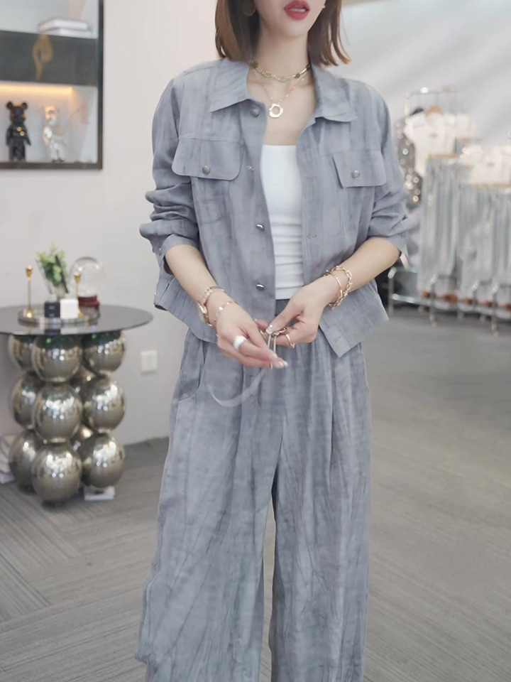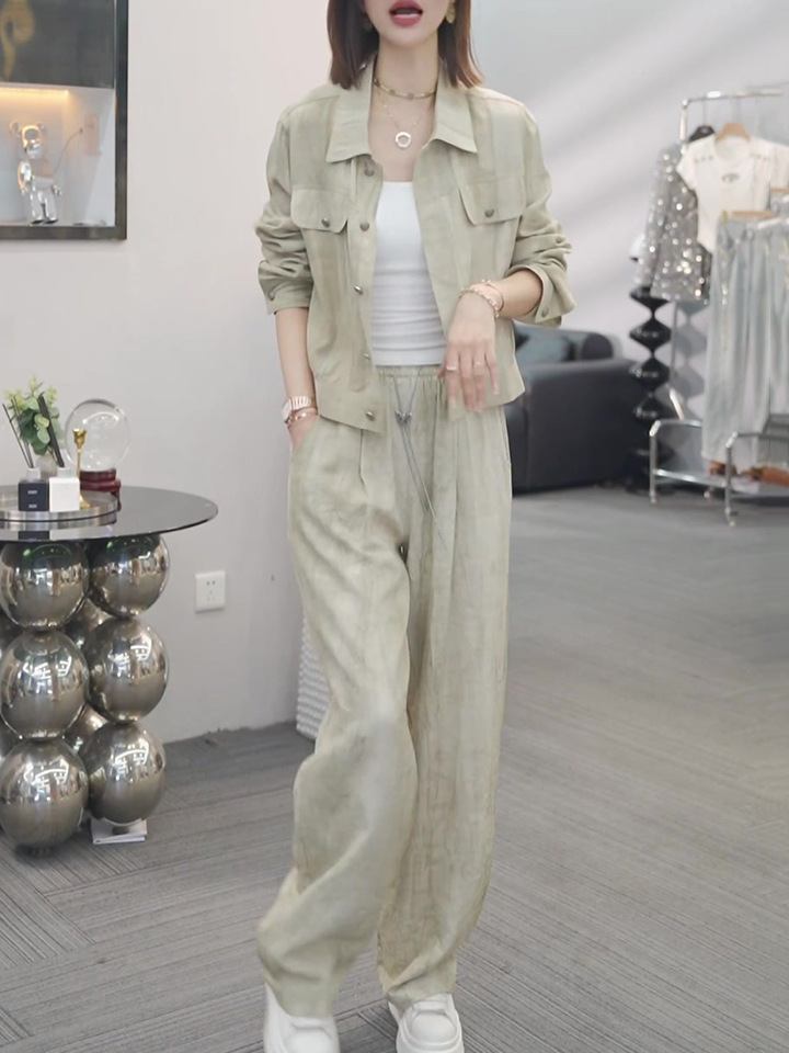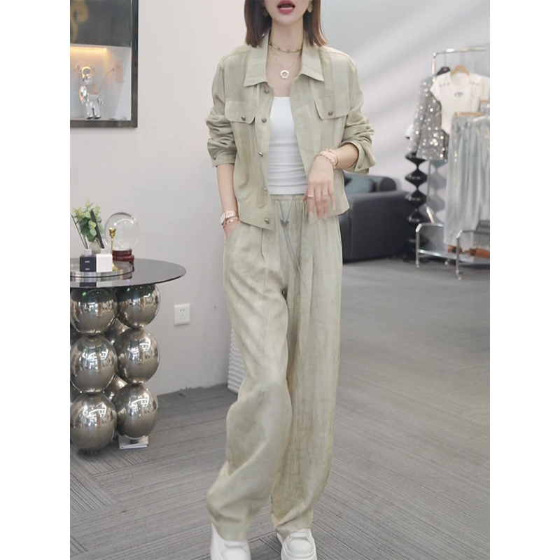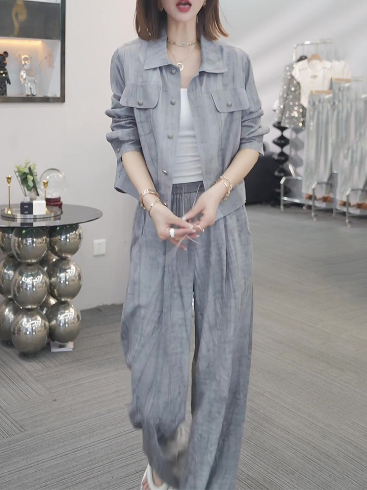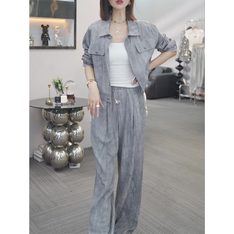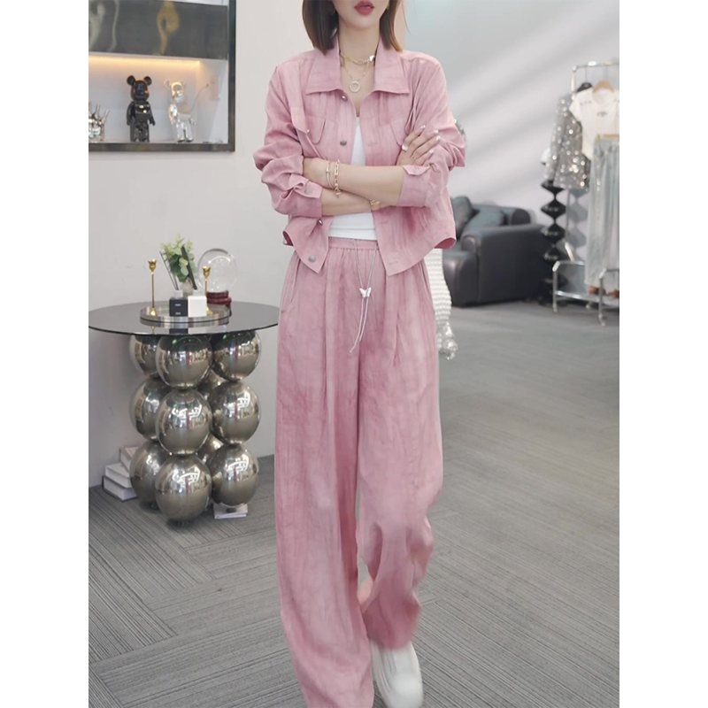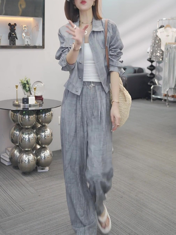 2025 여름 새로운 유럽 느슨한 캐주얼 안티 주름 선 스크린 셔츠 여성용 재킷 하이 허리 스트레이트 바지 투피스 세트