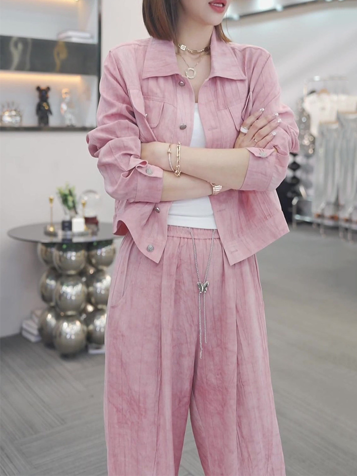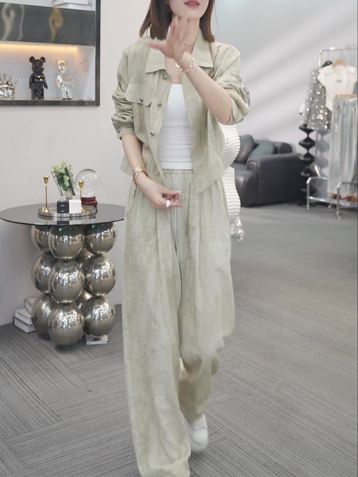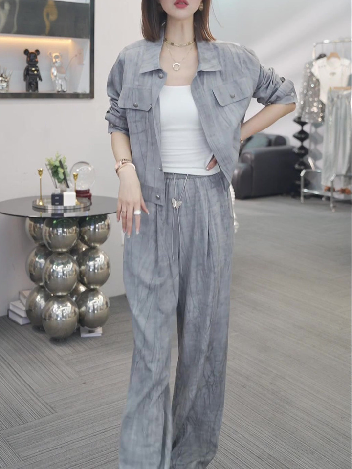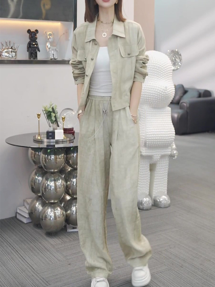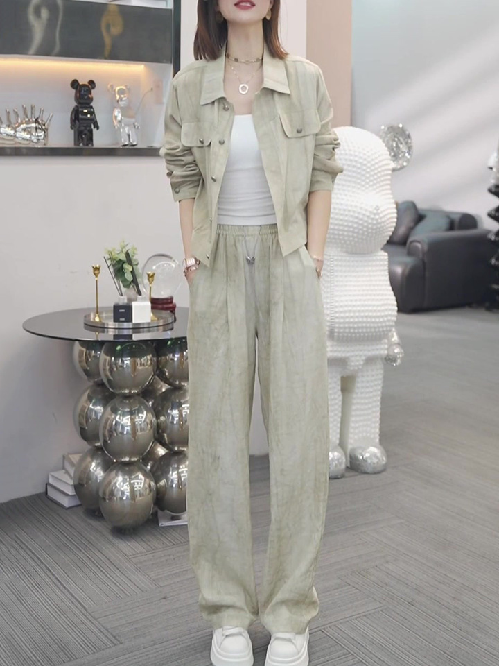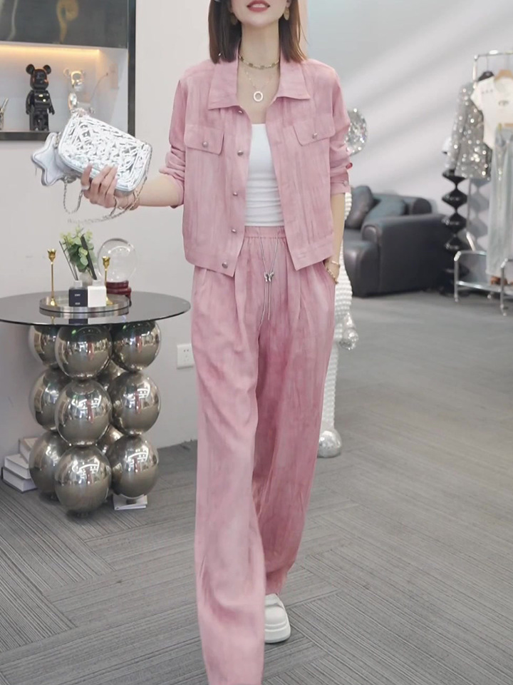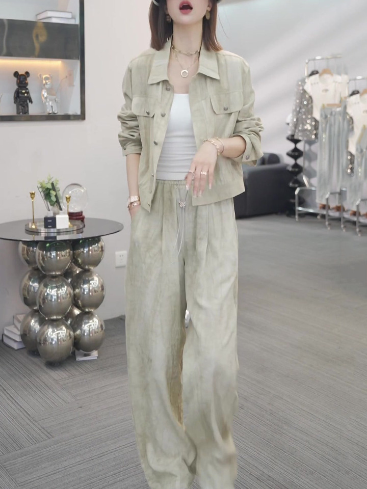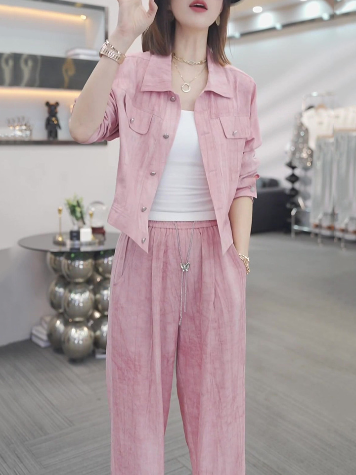 2025 여름 새로운 유럽 느슨한 캐주얼 안티 주름 선 스크린 셔츠 여성용 재킷 하이 허리 스트레이트 바지 투피스 세트