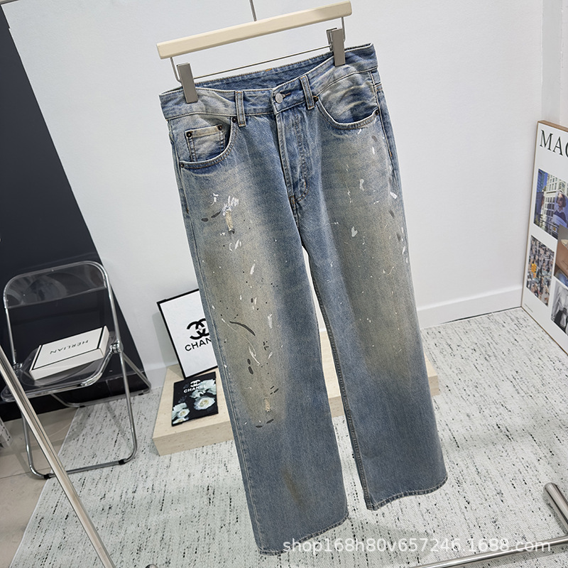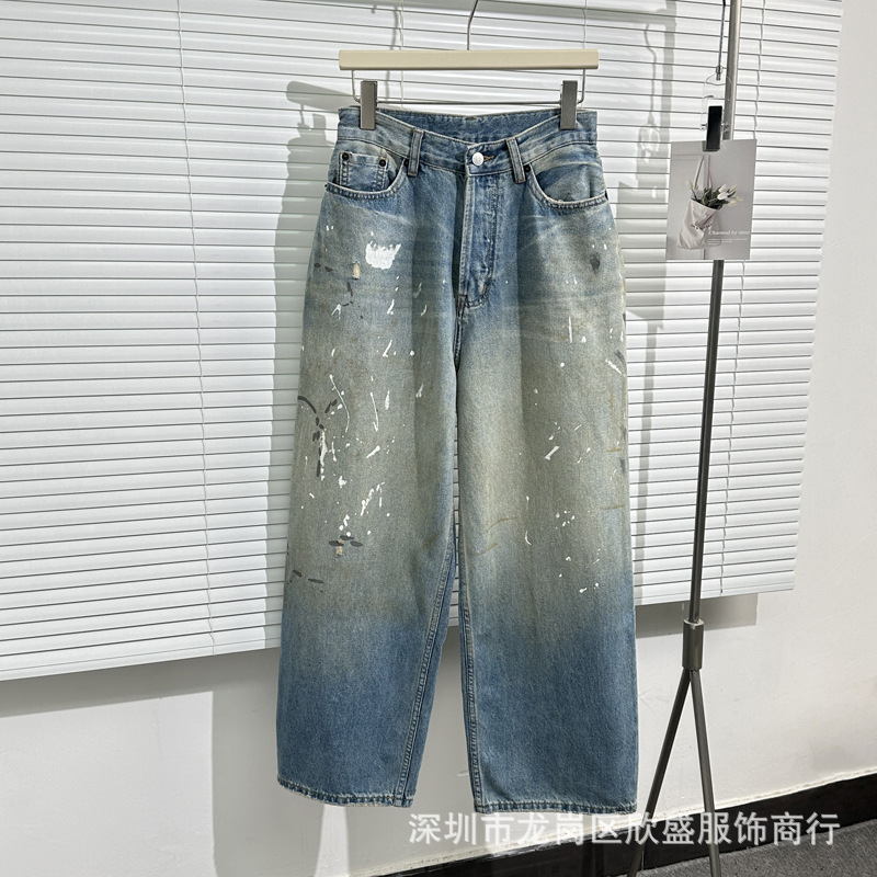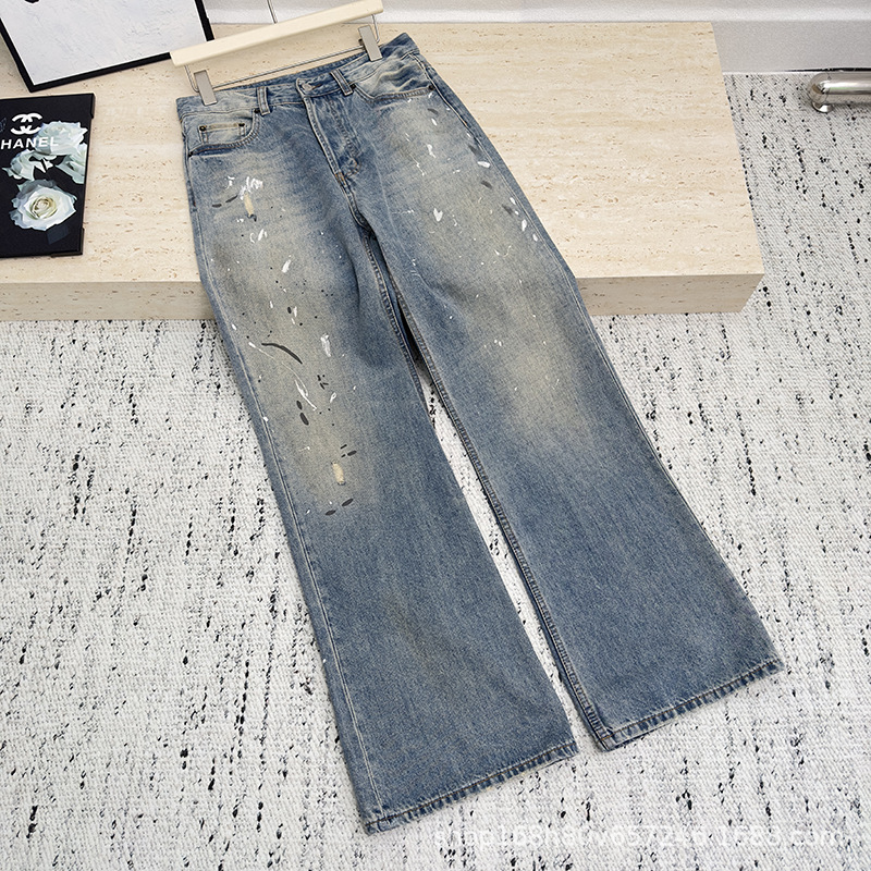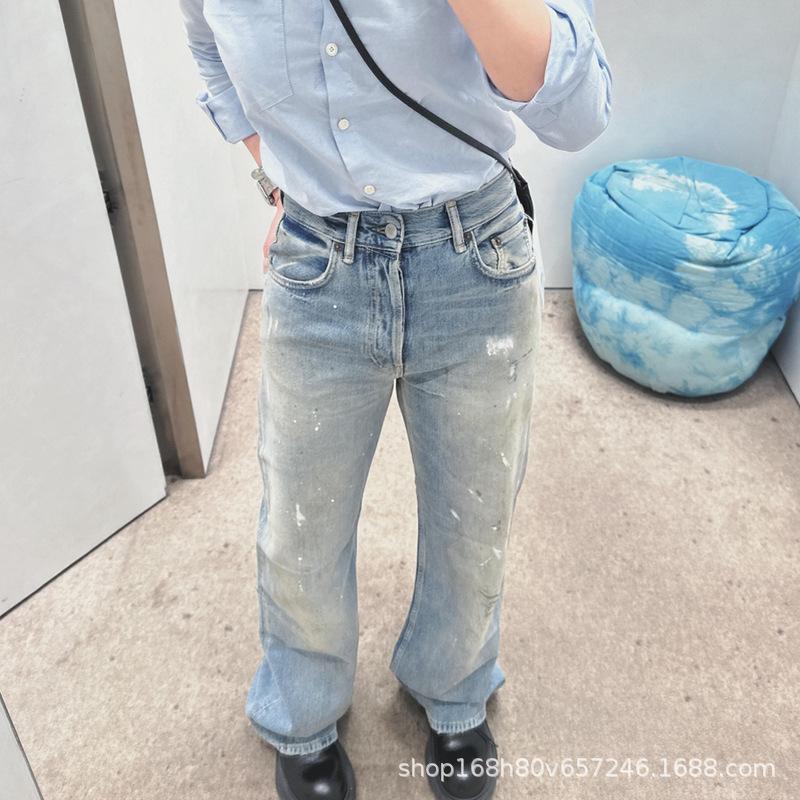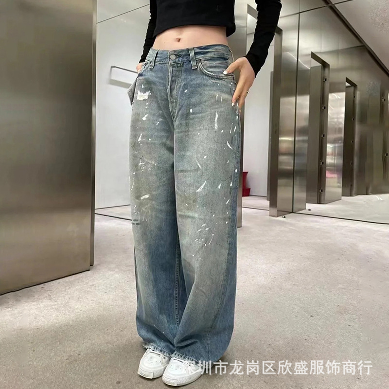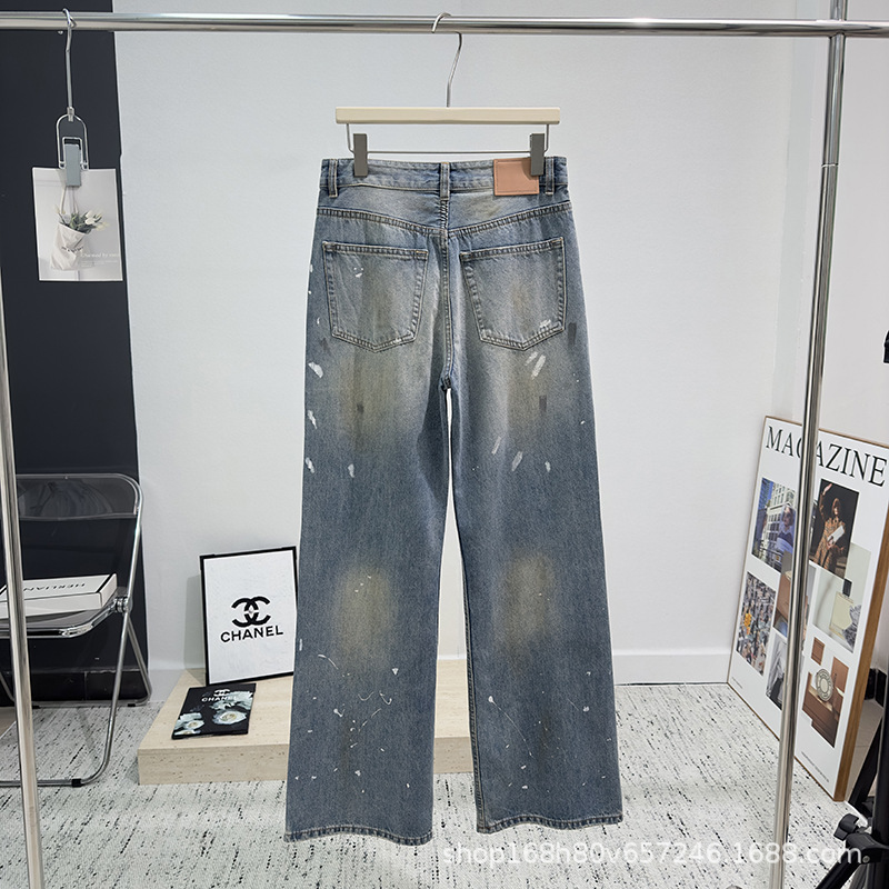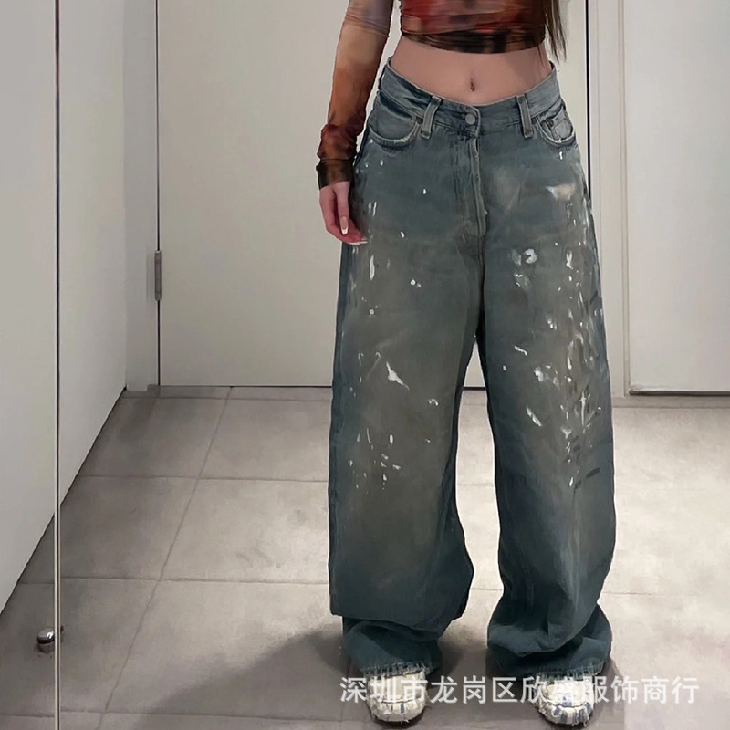Bai Jingting의 틈새 디자인 세탁 및 최악의 드레스 스플래시 잉크 및 머드 염색 느슨한 청바지 커플을위한 스트레이트 다리 바지스토어 가기
