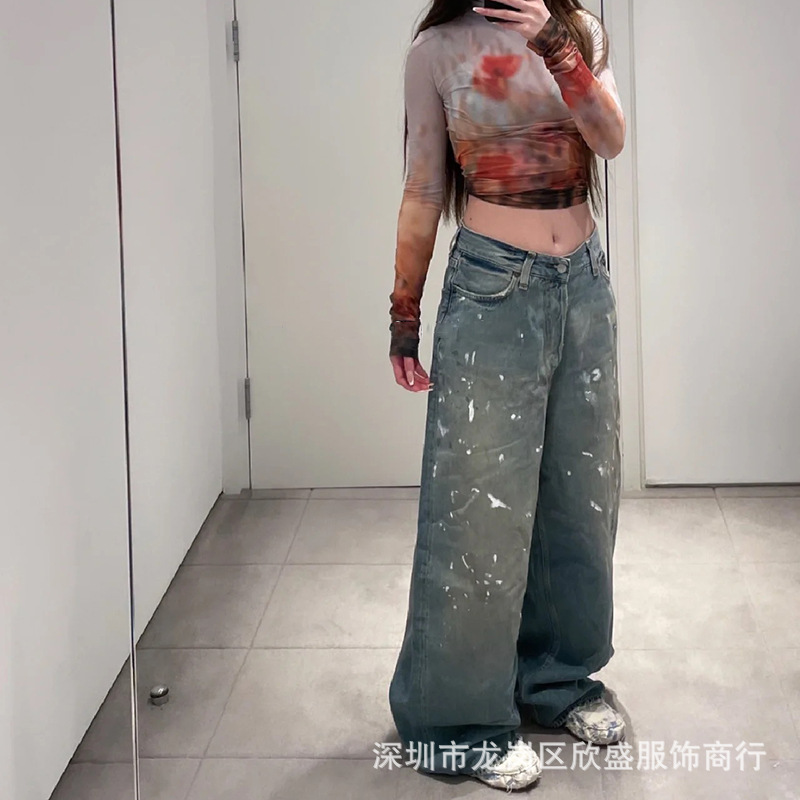 Bai Jingting의 틈새 디자인 세탁 및 최악의 드레스 스플래시 잉크 및 머드 염색 느슨한 청바지 커플을위한 스트레이트 다리 바지
