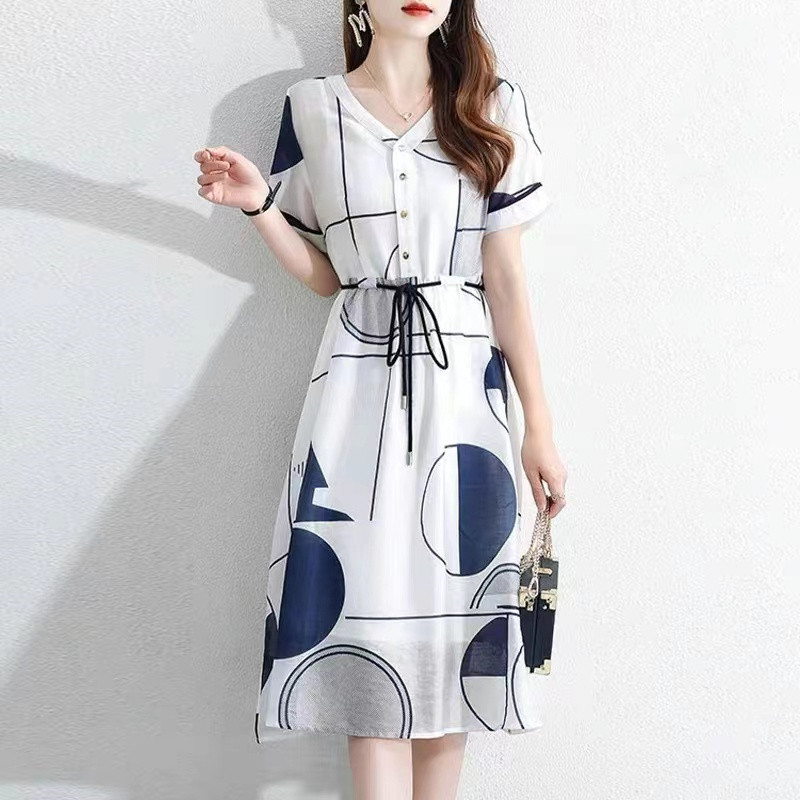 2024夏季高档轻奢连衣裙女装短袖几何图案v领显瘦宽松俏皮衬衫裙