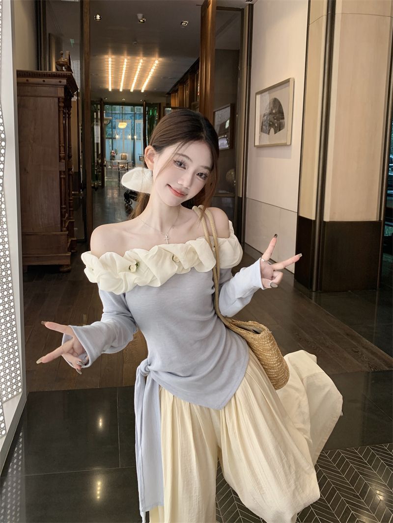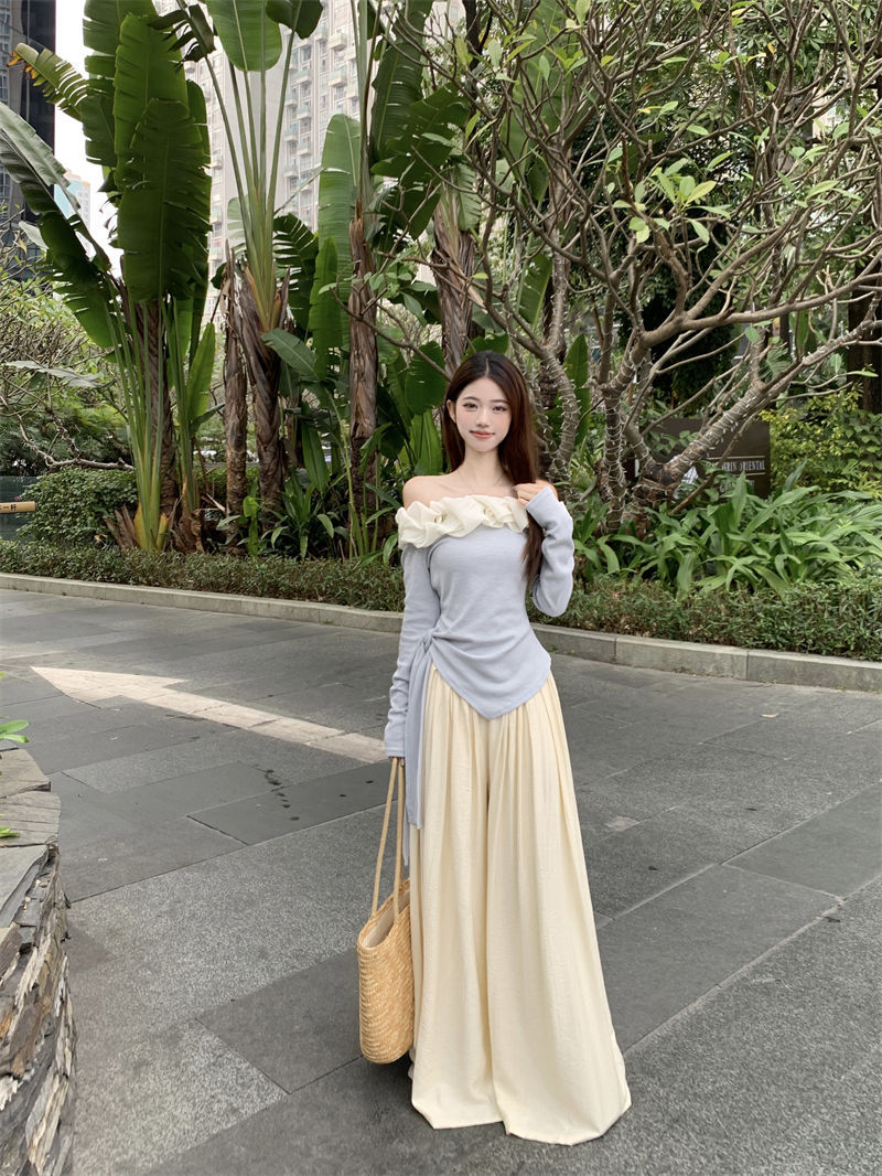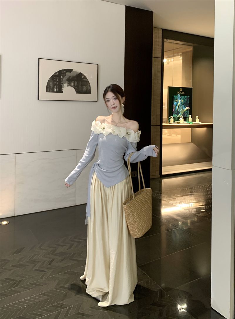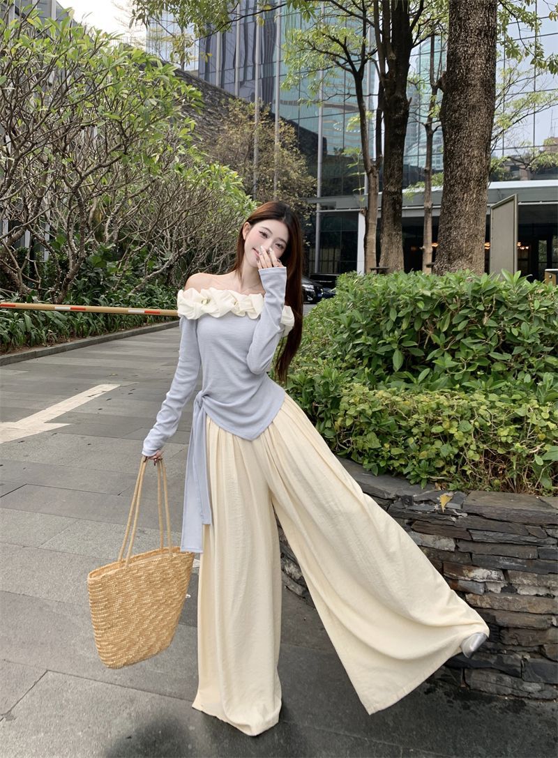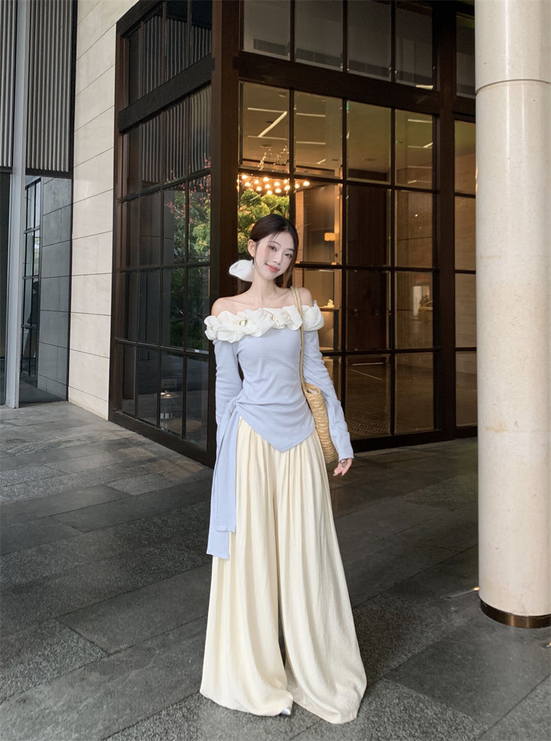 순수한 욕망 스타일 꽃 원라인 칼라 불규칙한 스트랩 티셔츠 여성용 와이드 레그 바닥 길이 바지 2025 이른 봄 새로운 투피스 세트