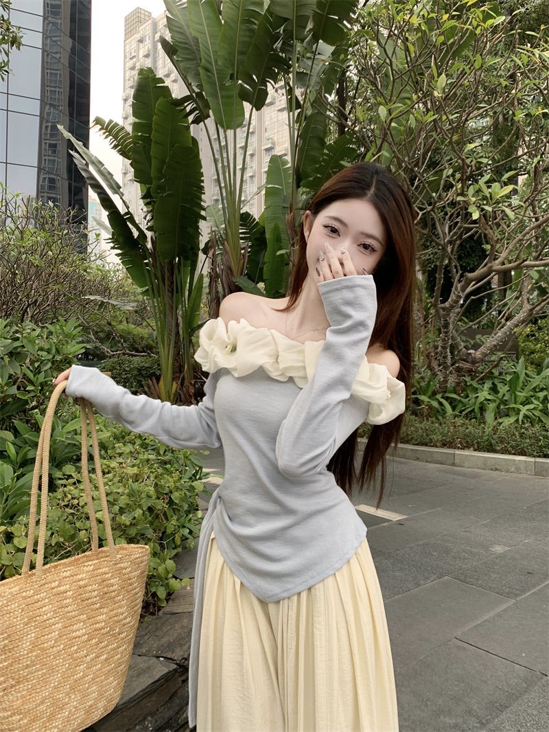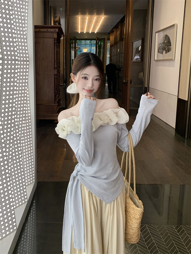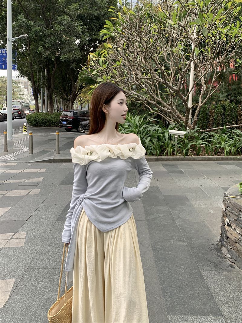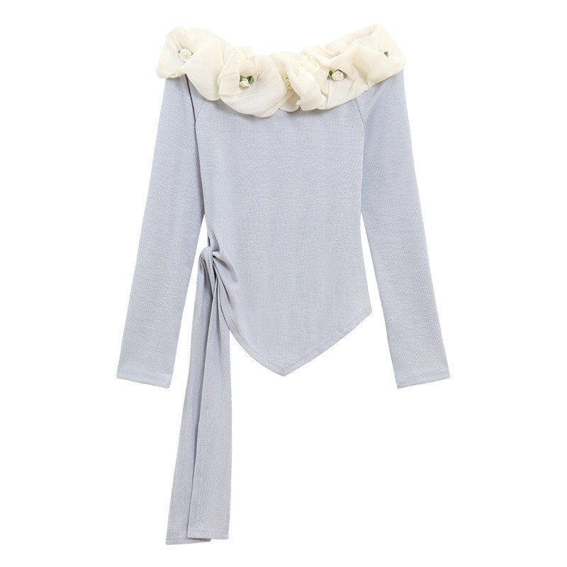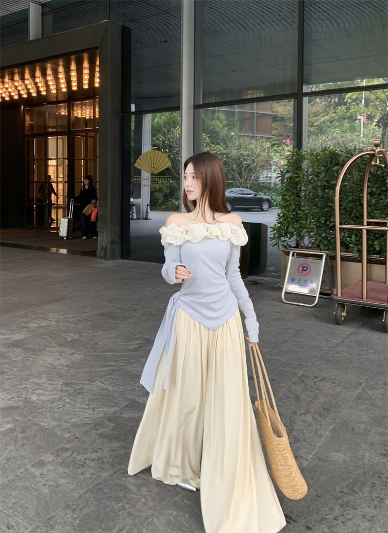 순수한 욕망 스타일 꽃 원라인 칼라 불규칙한 스트랩 티셔츠 여성용 와이드 레그 바닥 길이 바지 2025 이른 봄 새로운 투피스 세트
