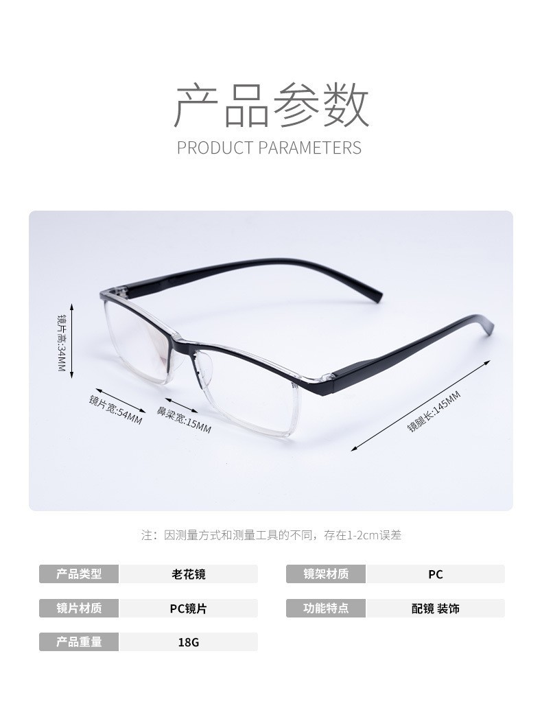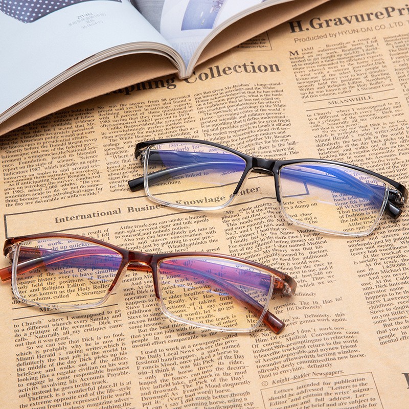 남성과 여성을 위한 독서용 안경 스프링 다리, 중년 및 노년층을 위한 세련되고 편안한 하프 프레임 안경, 투명한 블루 필름 눈 보호