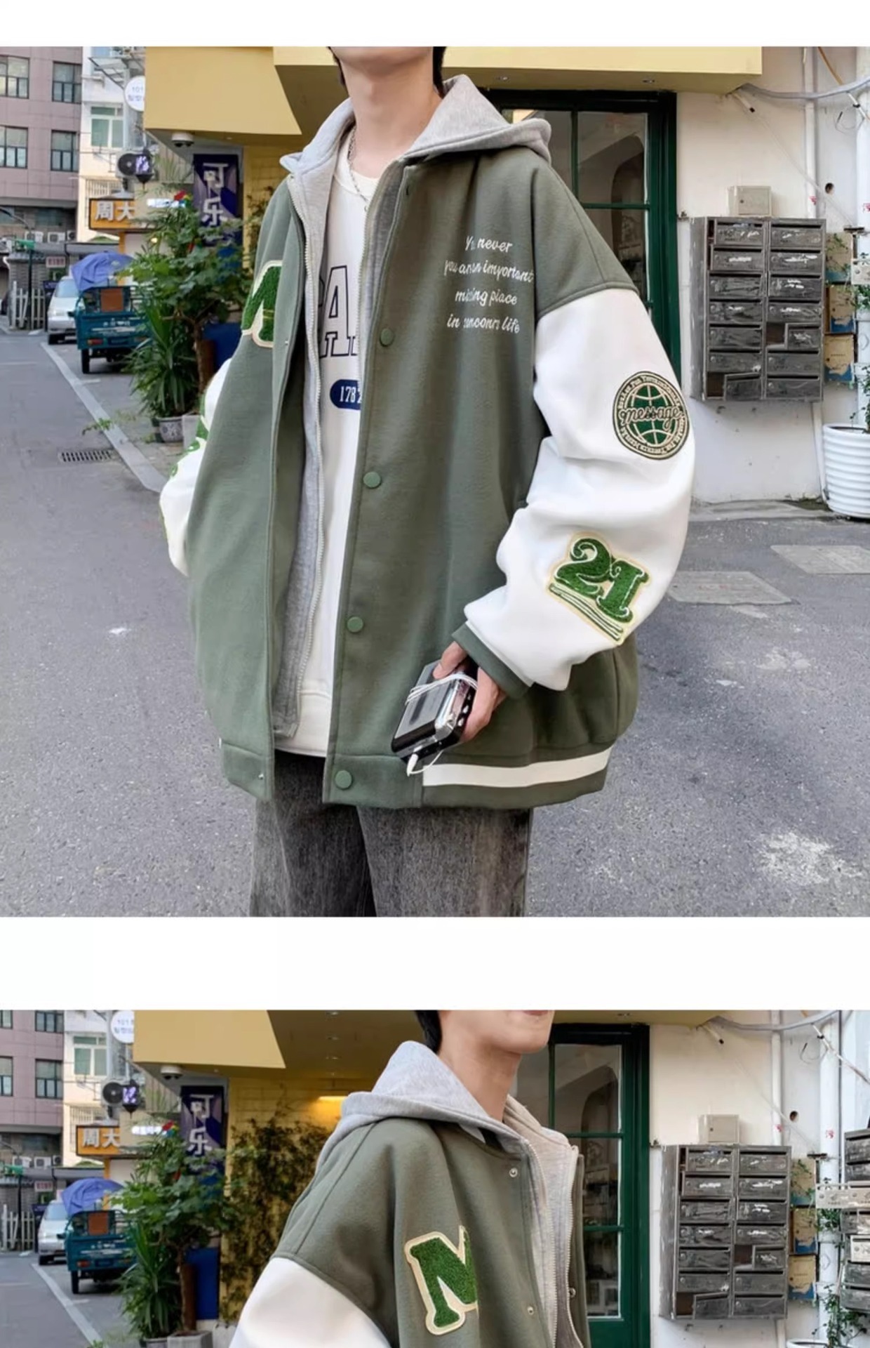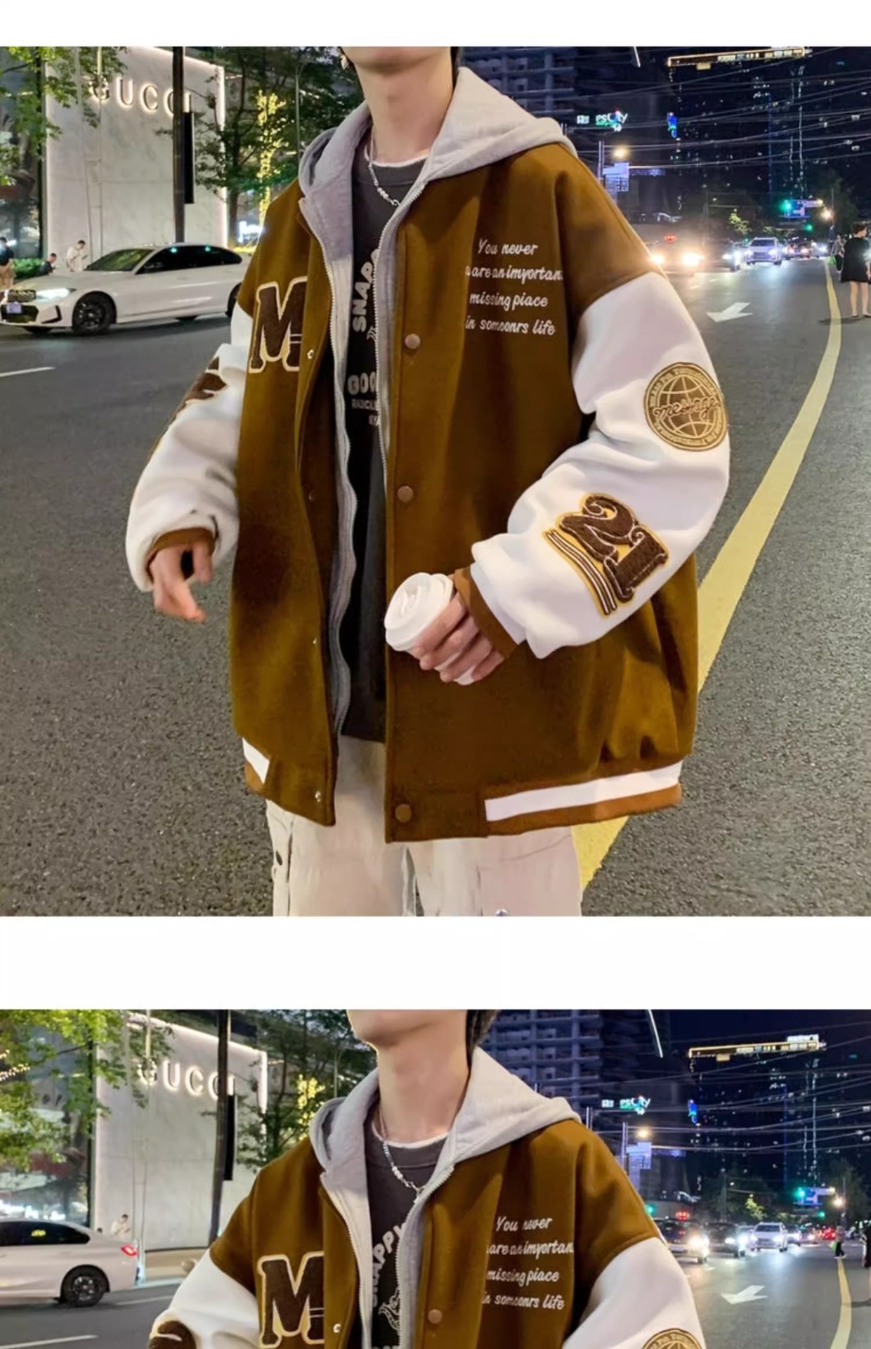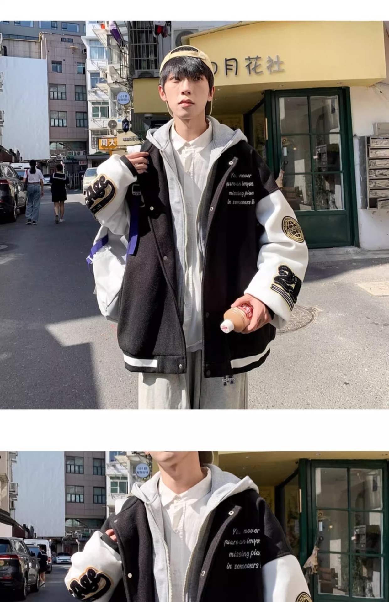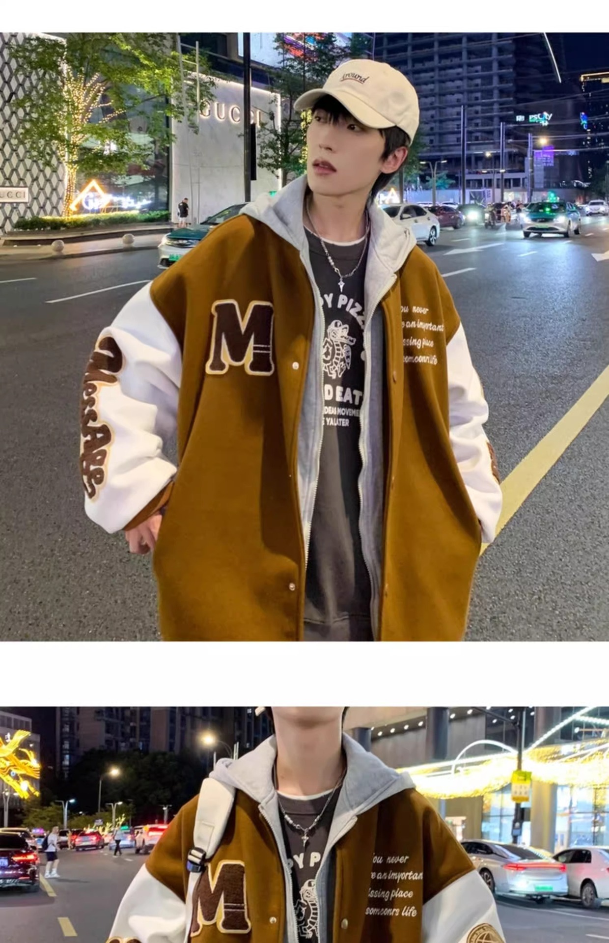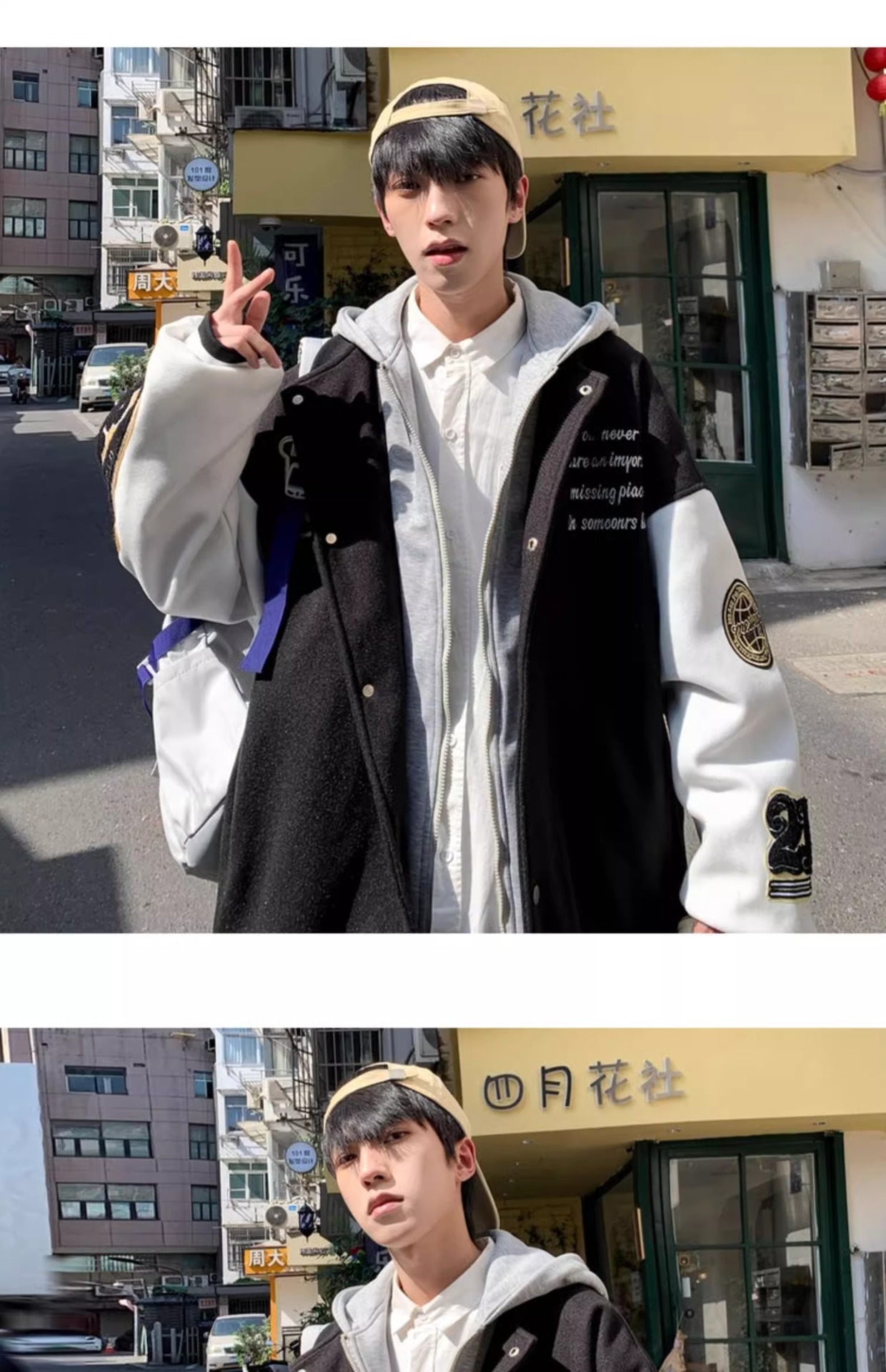 가짜 투피스 야구 유니폼 남자 코트 봄과 가을 2024 새로운 후드 자켓 미국 스타일 유행 브랜드 소년 커플 옷스토어 가기