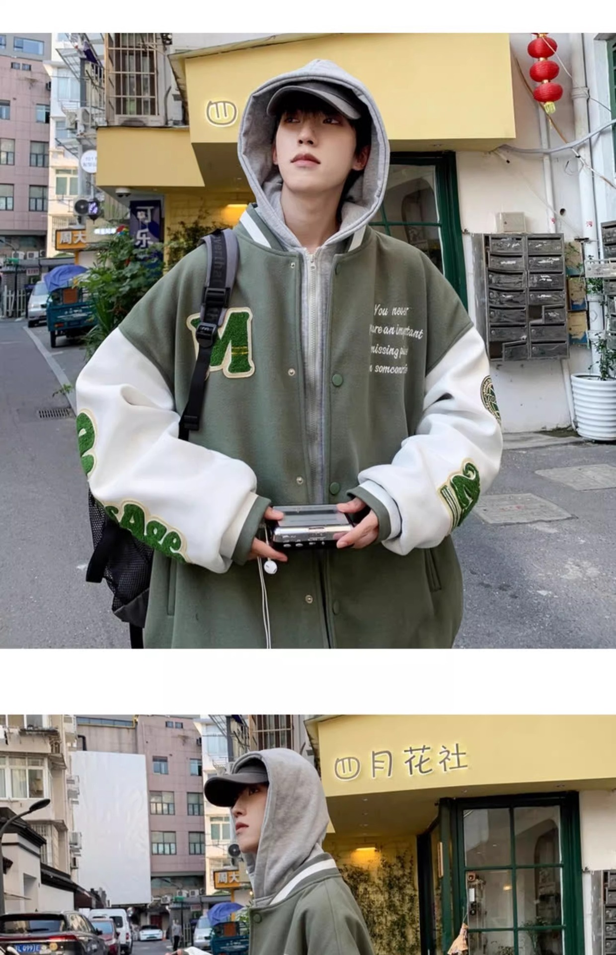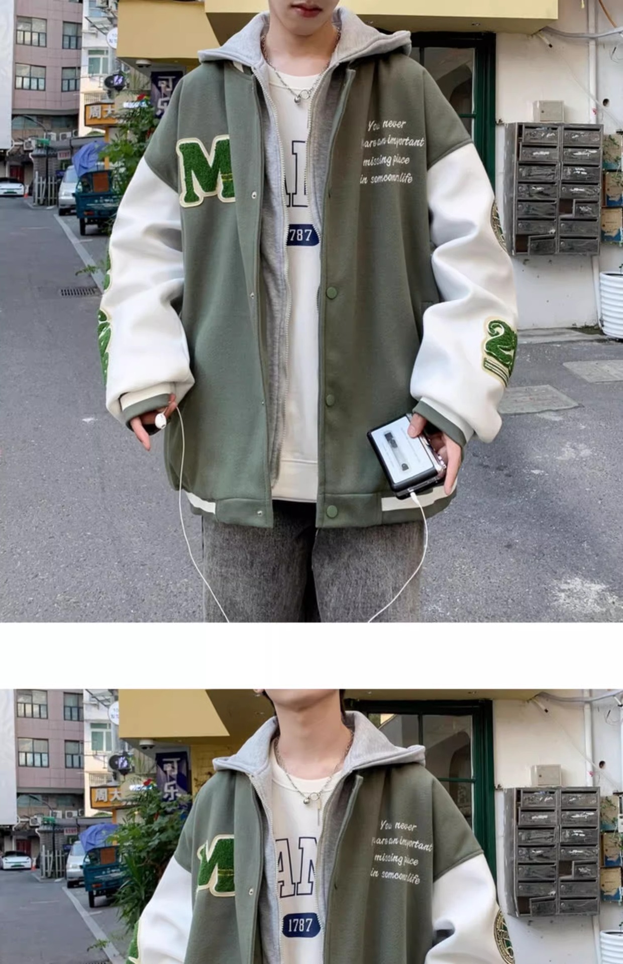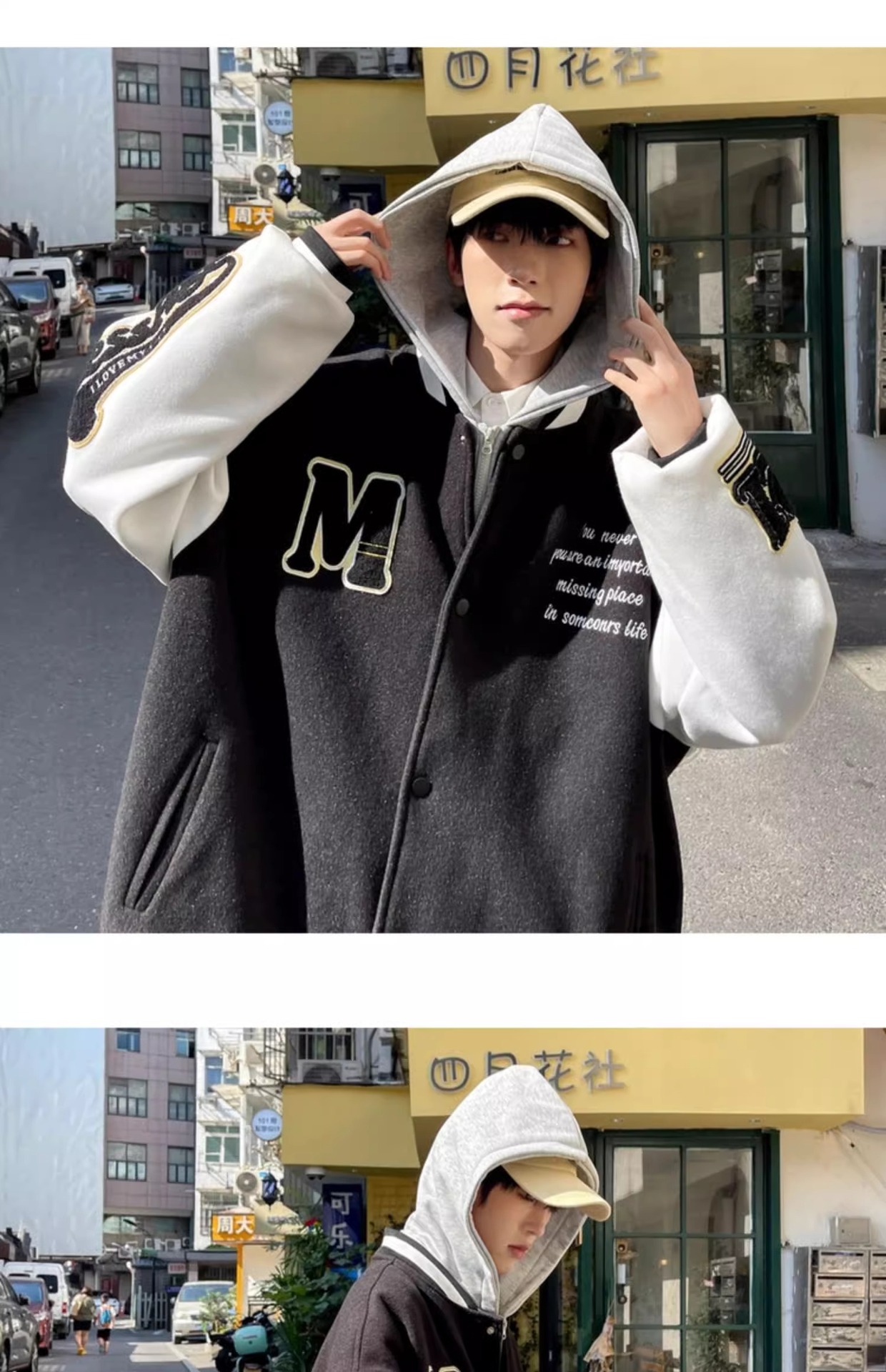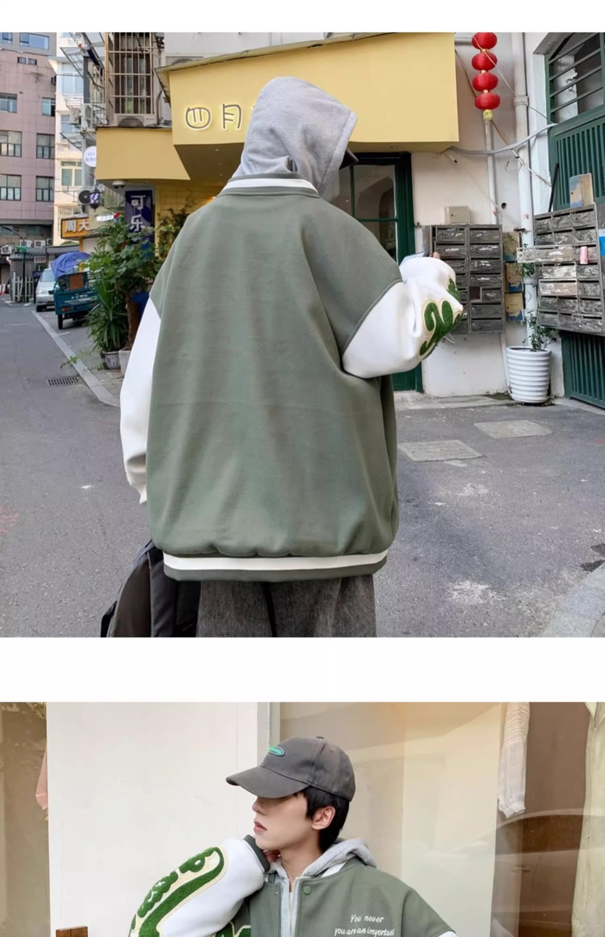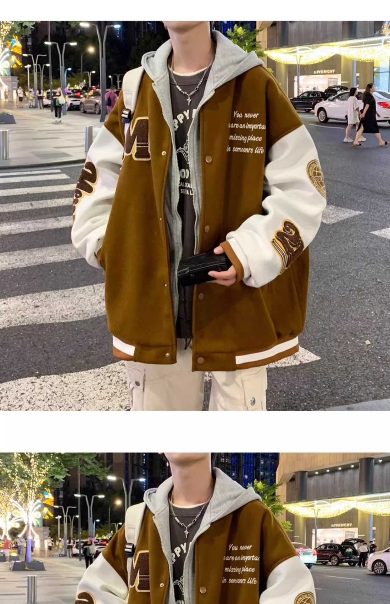 가짜 투피스 야구 유니폼 남자 코트 봄과 가을 2024 새로운 후드 자켓 미국 스타일 유행 브랜드 소년 커플 옷스토어 가기