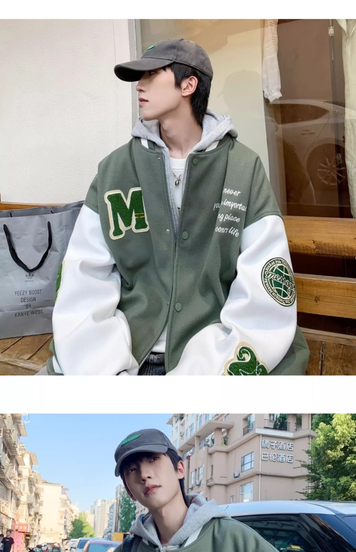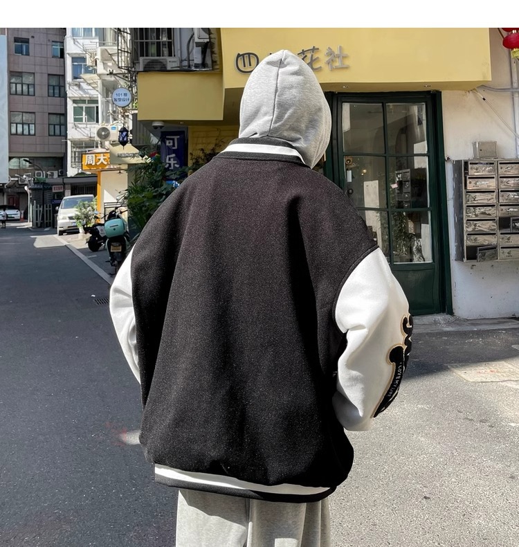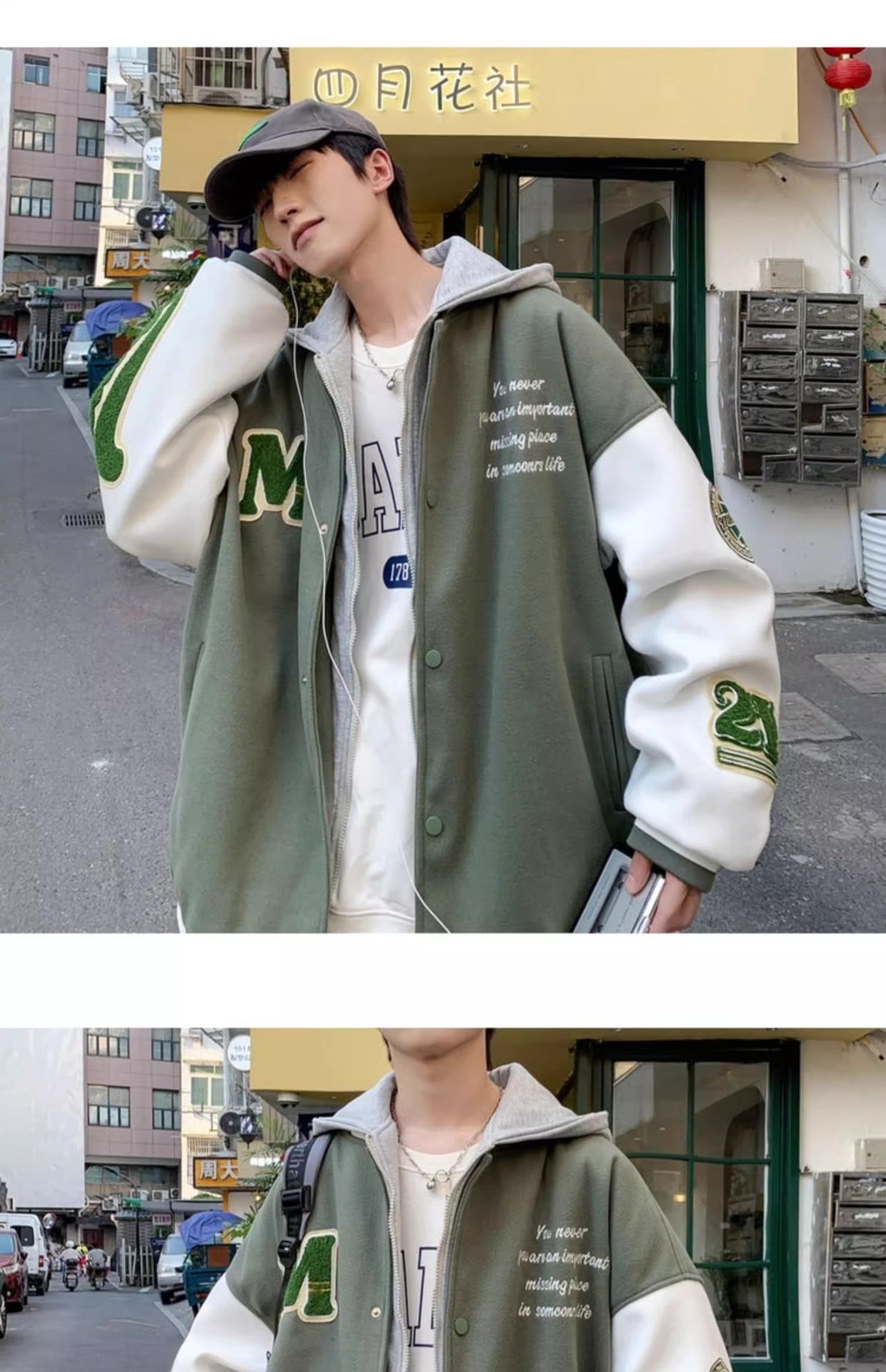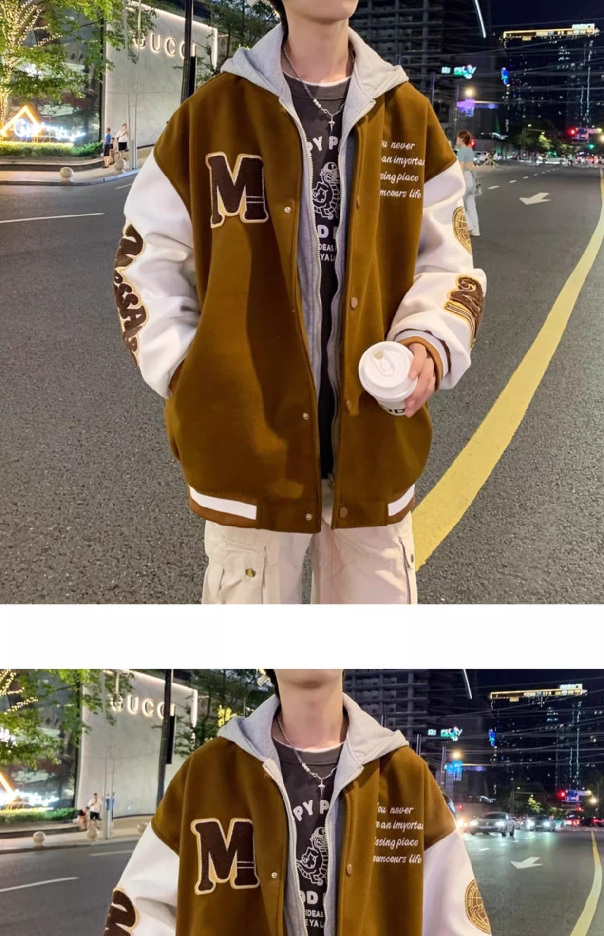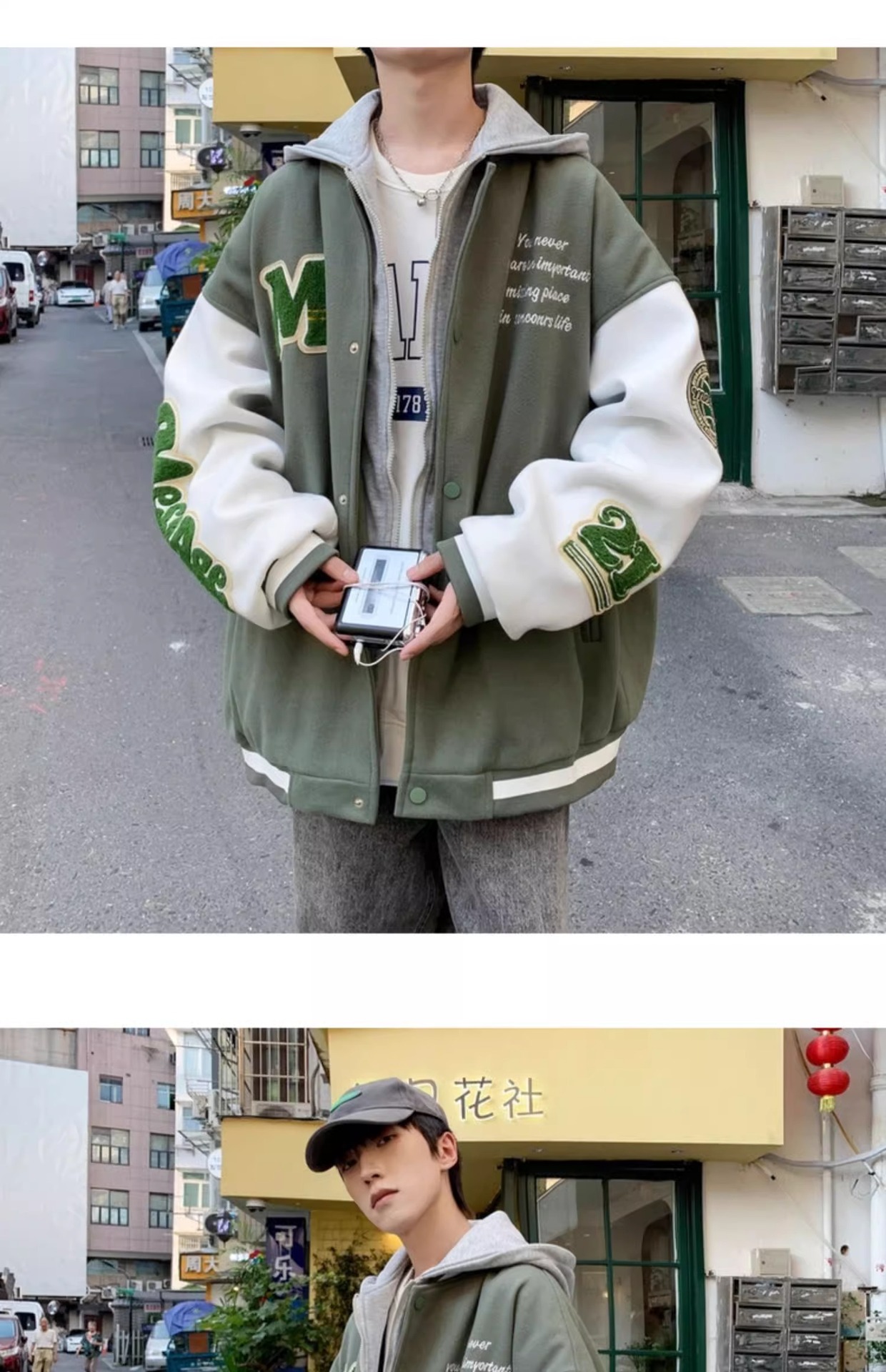 가짜 투피스 야구 유니폼 남자 코트 봄과 가을 2024 새로운 후드 자켓 미국 스타일 유행 브랜드 소년 커플 옷스토어 가기
