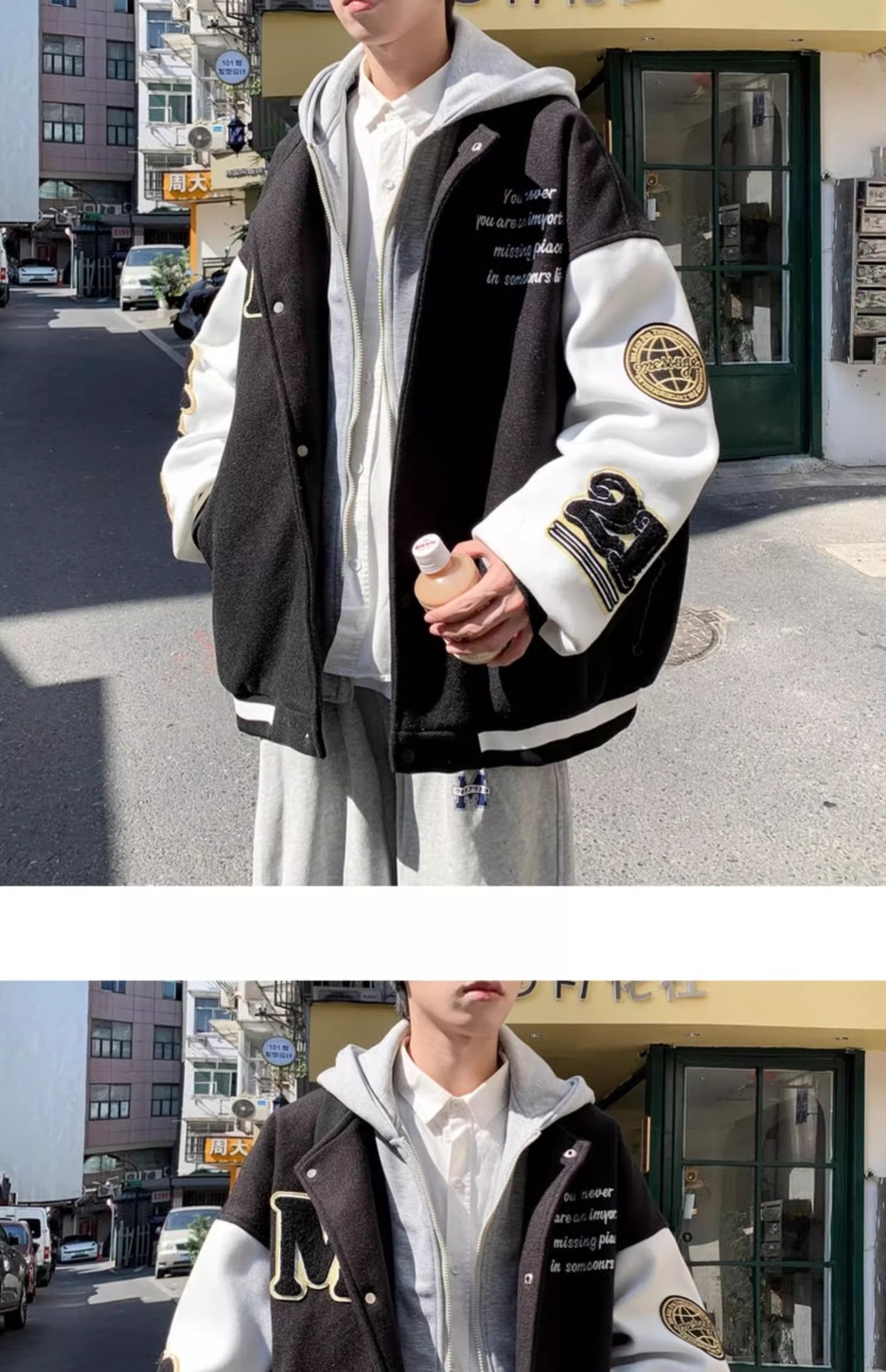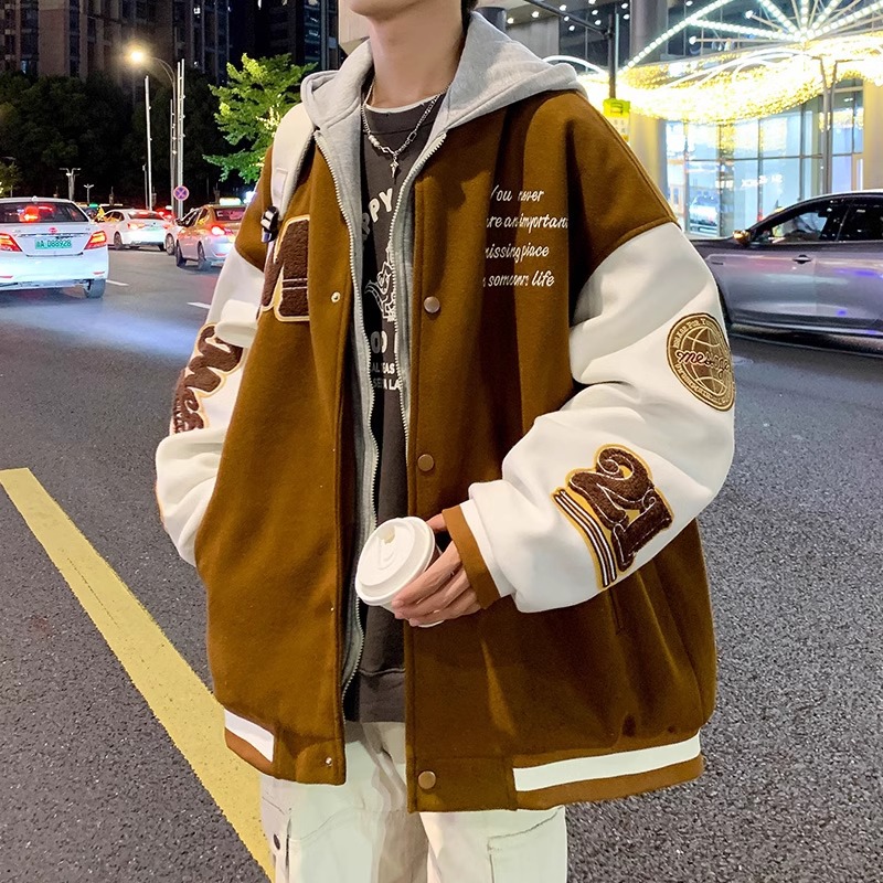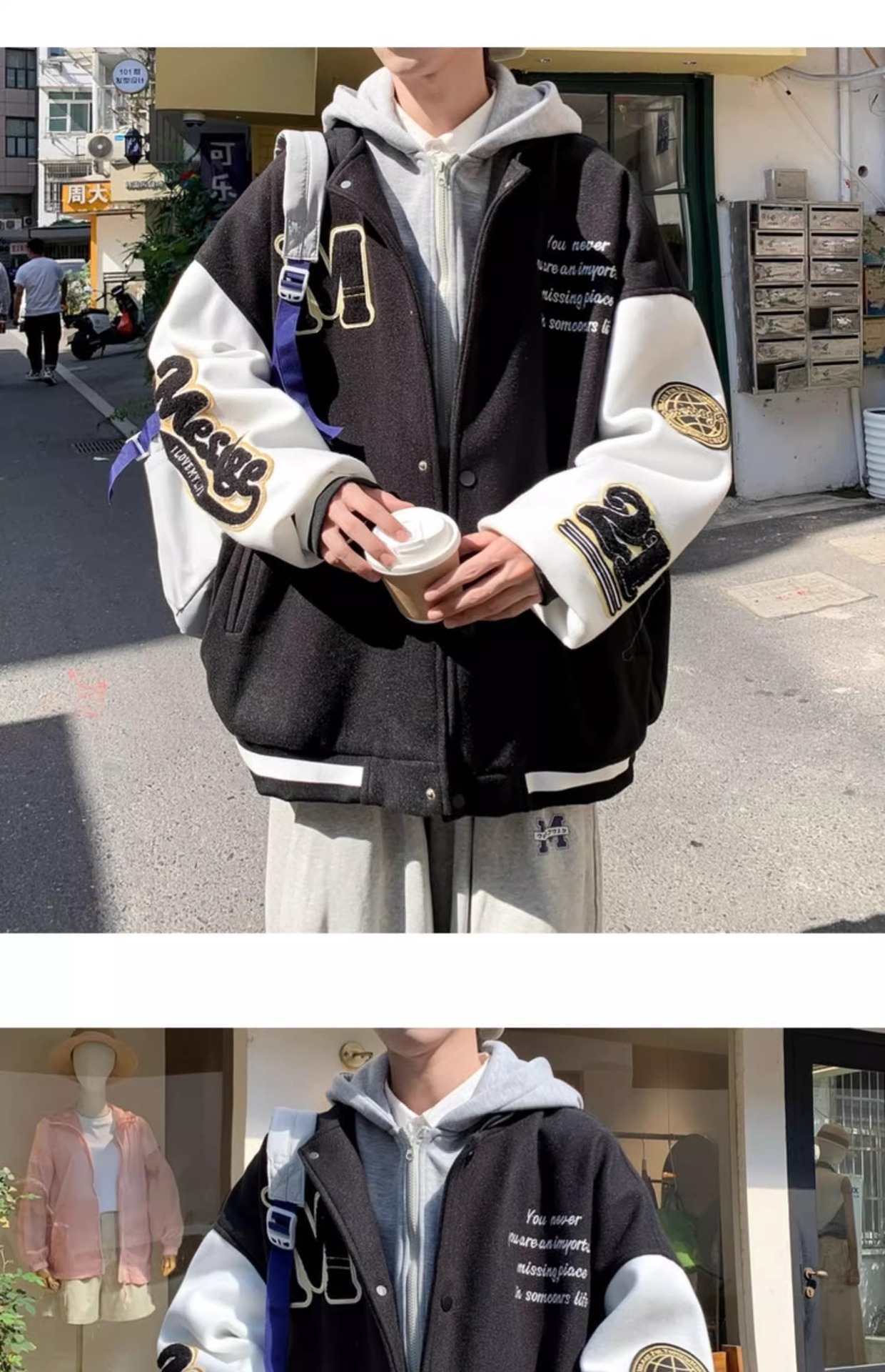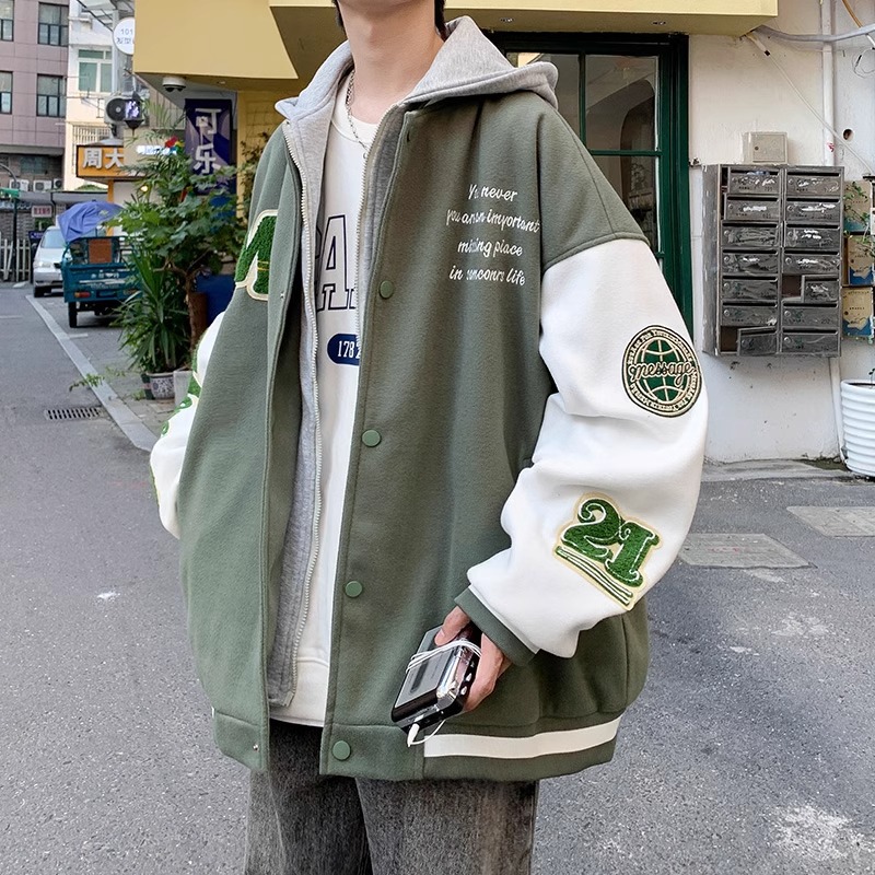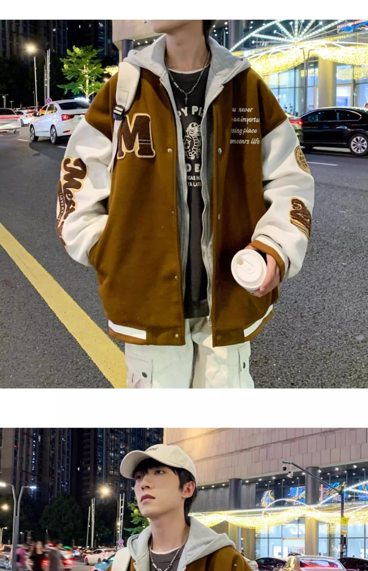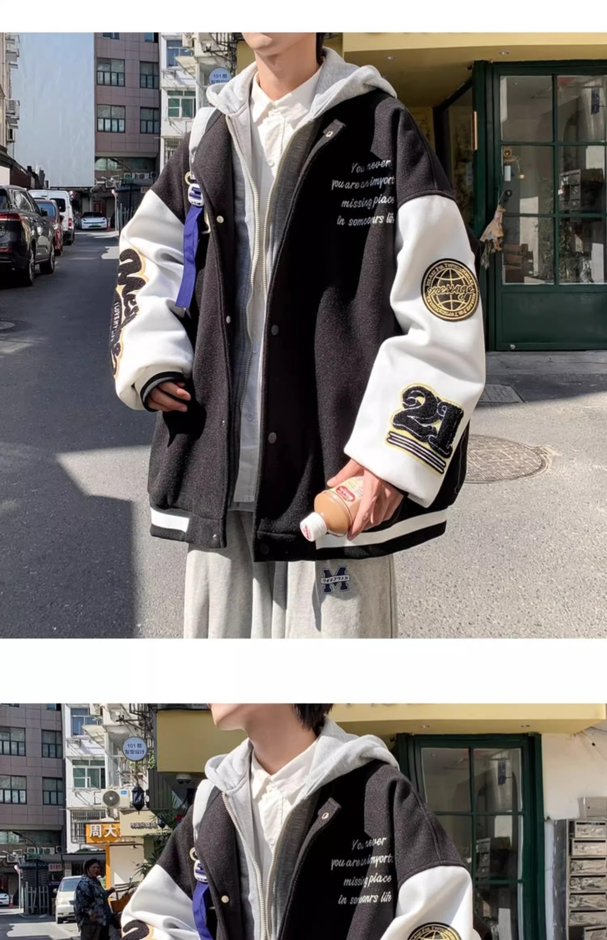 가짜 투피스 야구 유니폼 남자 코트 봄과 가을 2024 새로운 후드 자켓 미국 스타일 유행 브랜드 소년 커플 옷스토어 가기