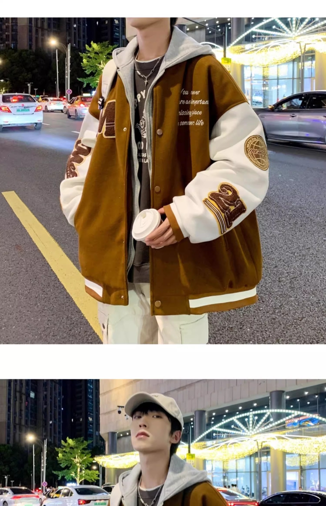 가짜 투피스 야구 유니폼 남자 코트 봄과 가을 2024 새로운 후드 자켓 미국 스타일 유행 브랜드 소년 커플 옷