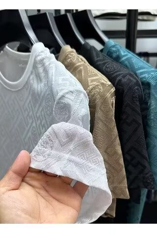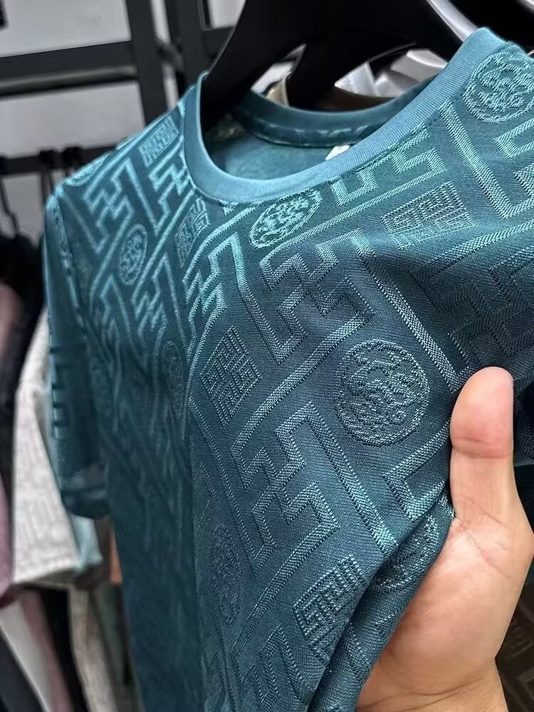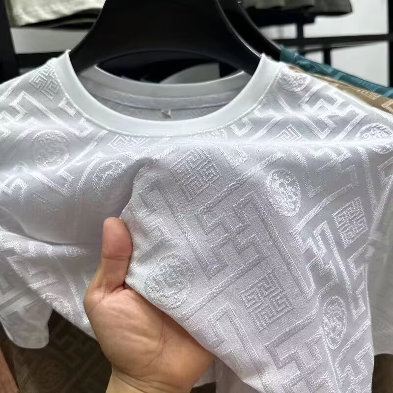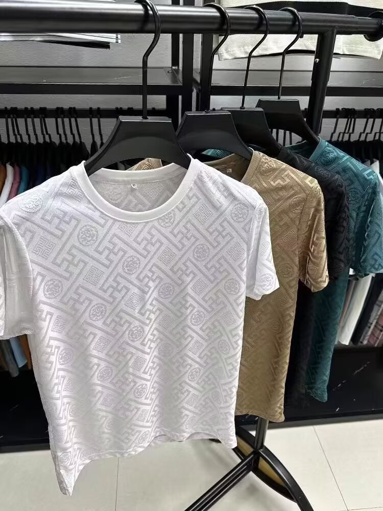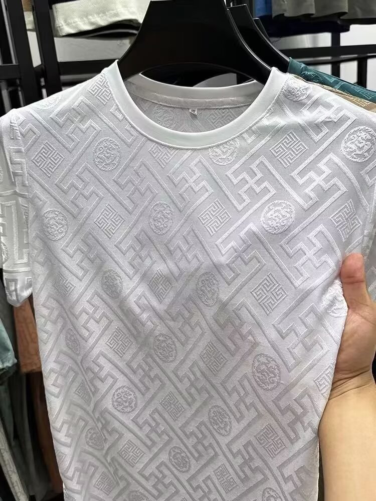 2025 남자 여름 새로운 아이스 실크 짧은 소매 프린트 티셔츠 크루 넥 멋진 느낌 남성 탑베이스 셔츠 대외 무역 T 얇은