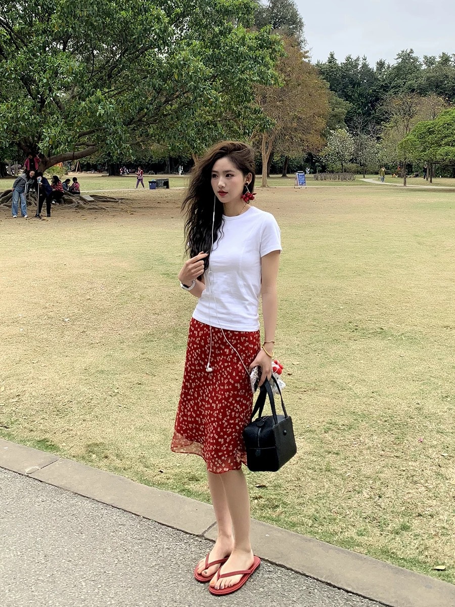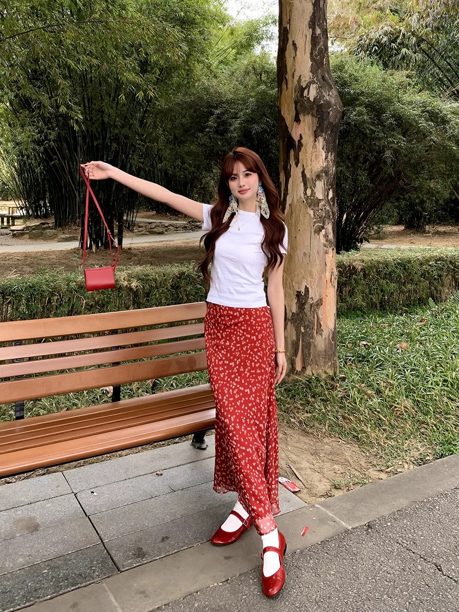 얇은 빈티지 꽃 쉬폰 스커트 여자 2025 년 여름 새로운 높은 허리 슬리밍 올 매치 A 라인 피쉬 테일 스커트스토어 가기
