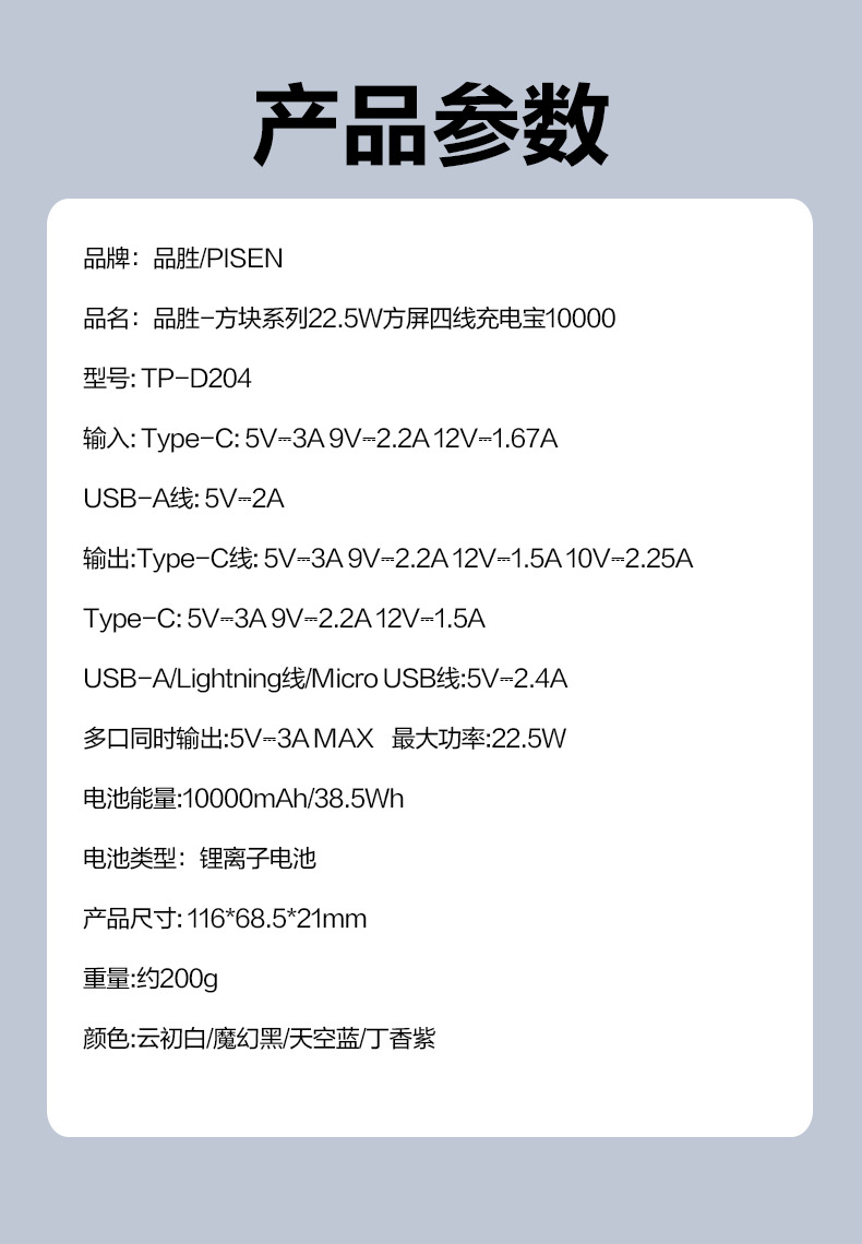 • 10,000mAh [큐브 시리즈 22.5W 사각 스크린 4선 보조배터리 TP-D204]