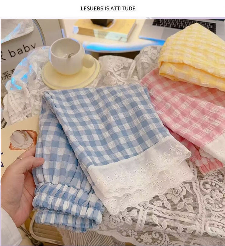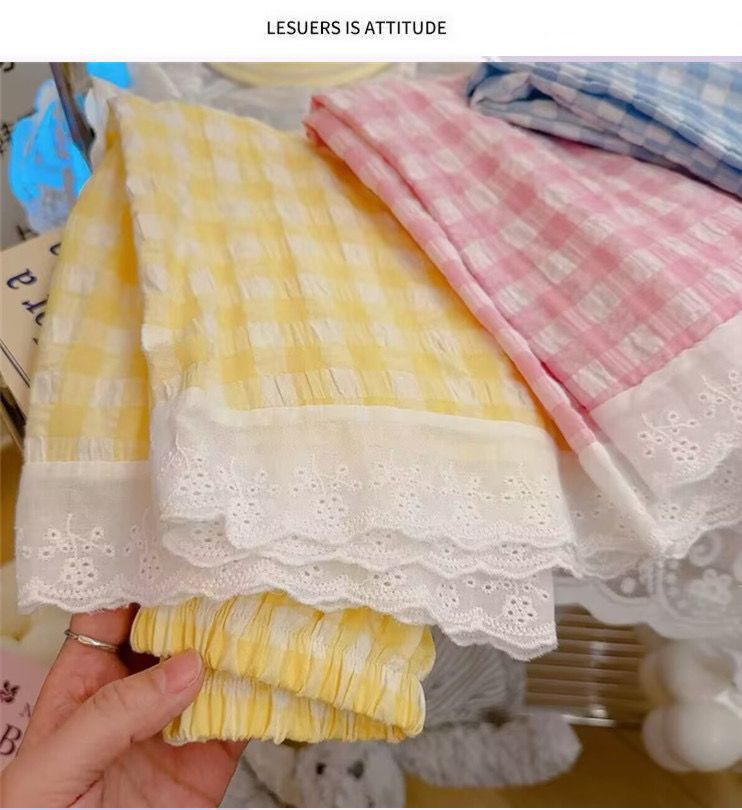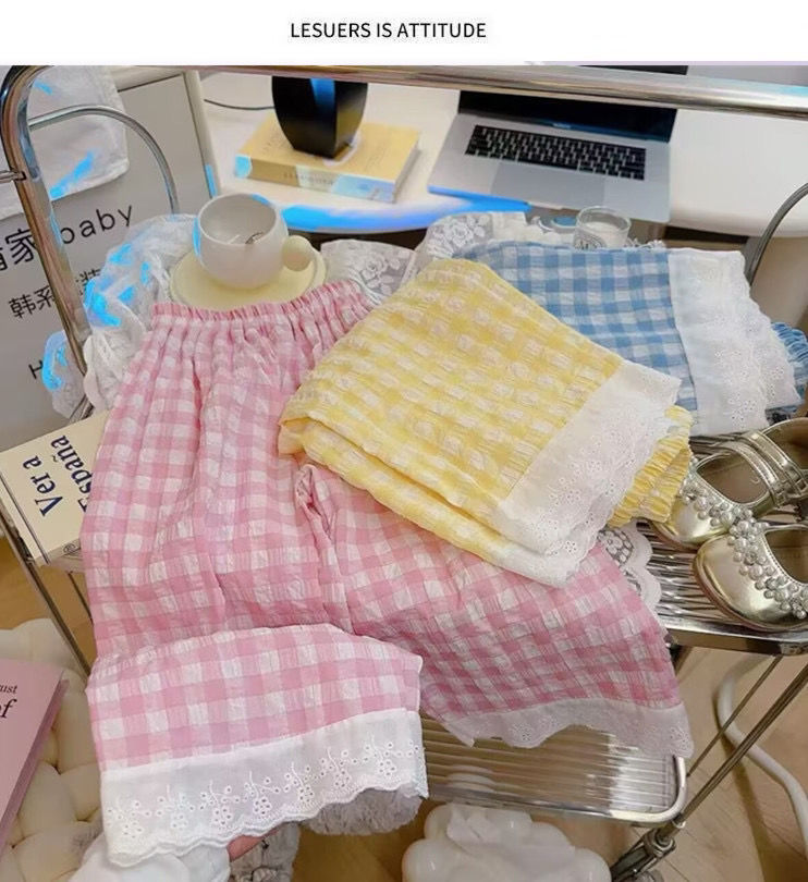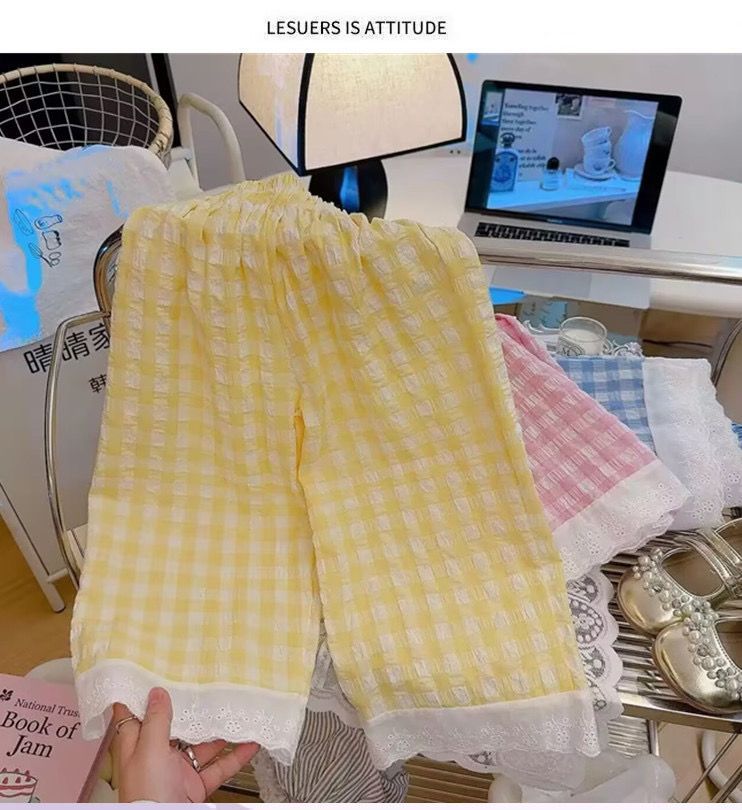 여자 여름 격자 무늬 레이스 가장자리 캐주얼 바지 아기의 도파민 넓은 다리 바지 새로운 한국 스타일 어린이 안티 모기 바지스토어 가기