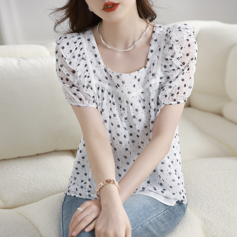 스퀘어 칼라 버블 슬리브 반팔 쉬폰 셔츠 여성의 2023 년 여름 새로운 꽃 Ruffled 디자인 센스 셔츠 탑