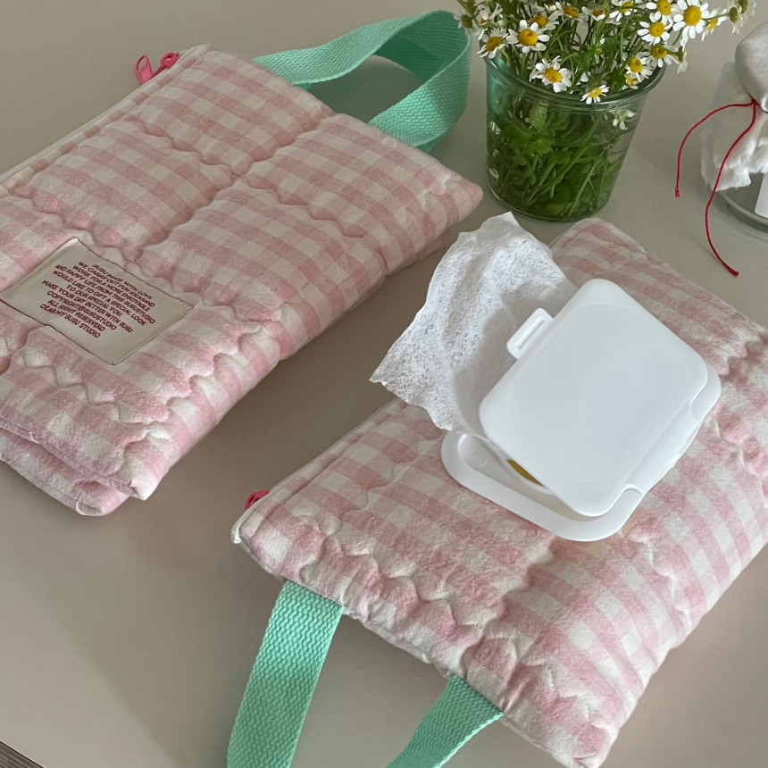• 핑크 체크 무늬 물티슈 가방