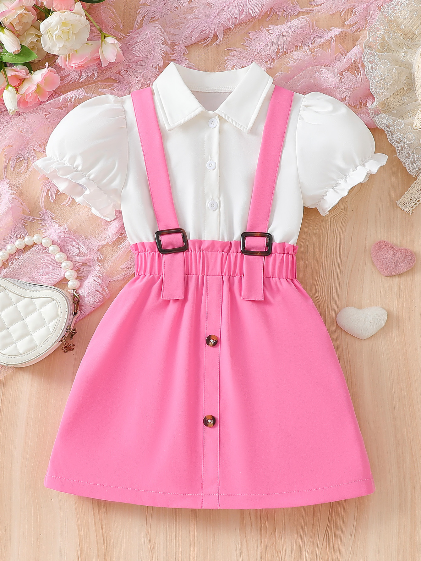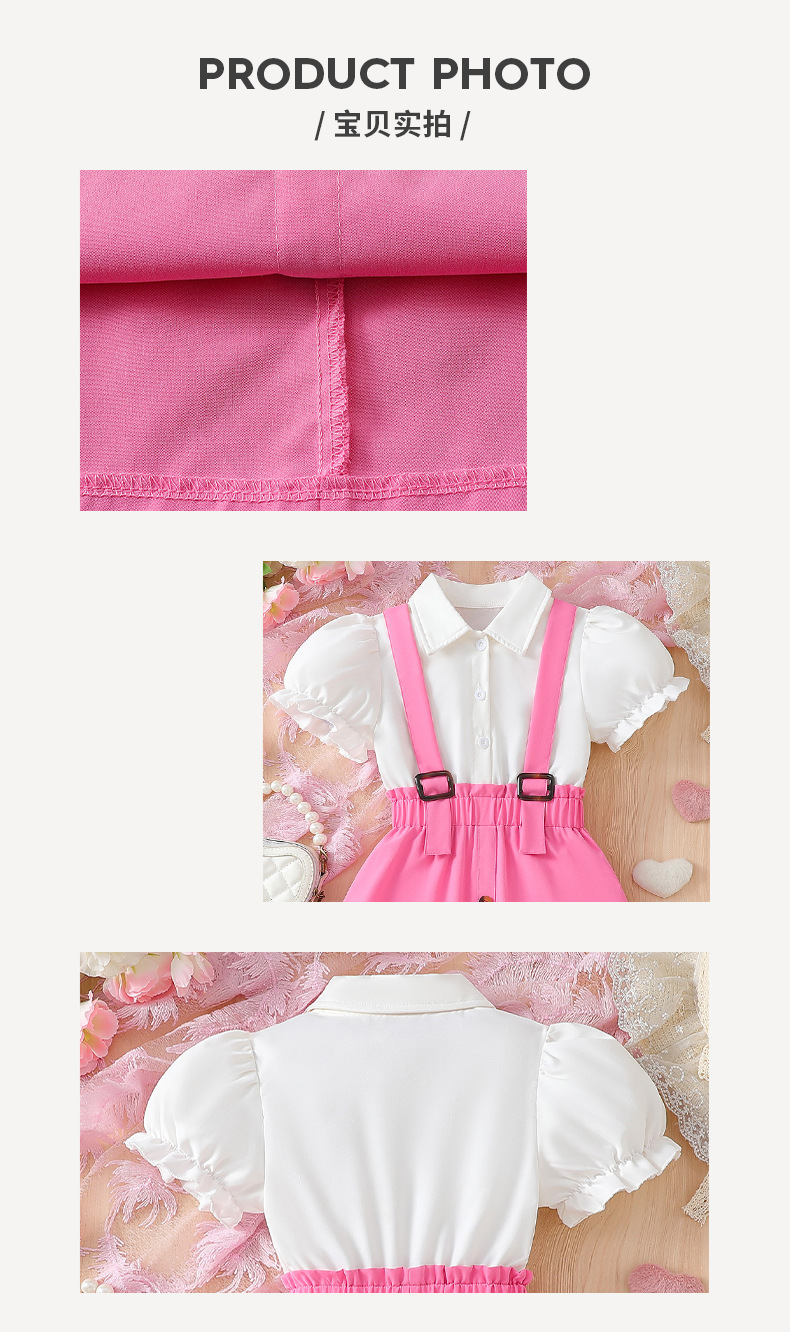 국경 간 소녀 가짜 투피스 원피스 핑크 스트랩 스티칭 랜턴 슬리브 화이트 셔츠 탑 귀여운 어린이 스커트
