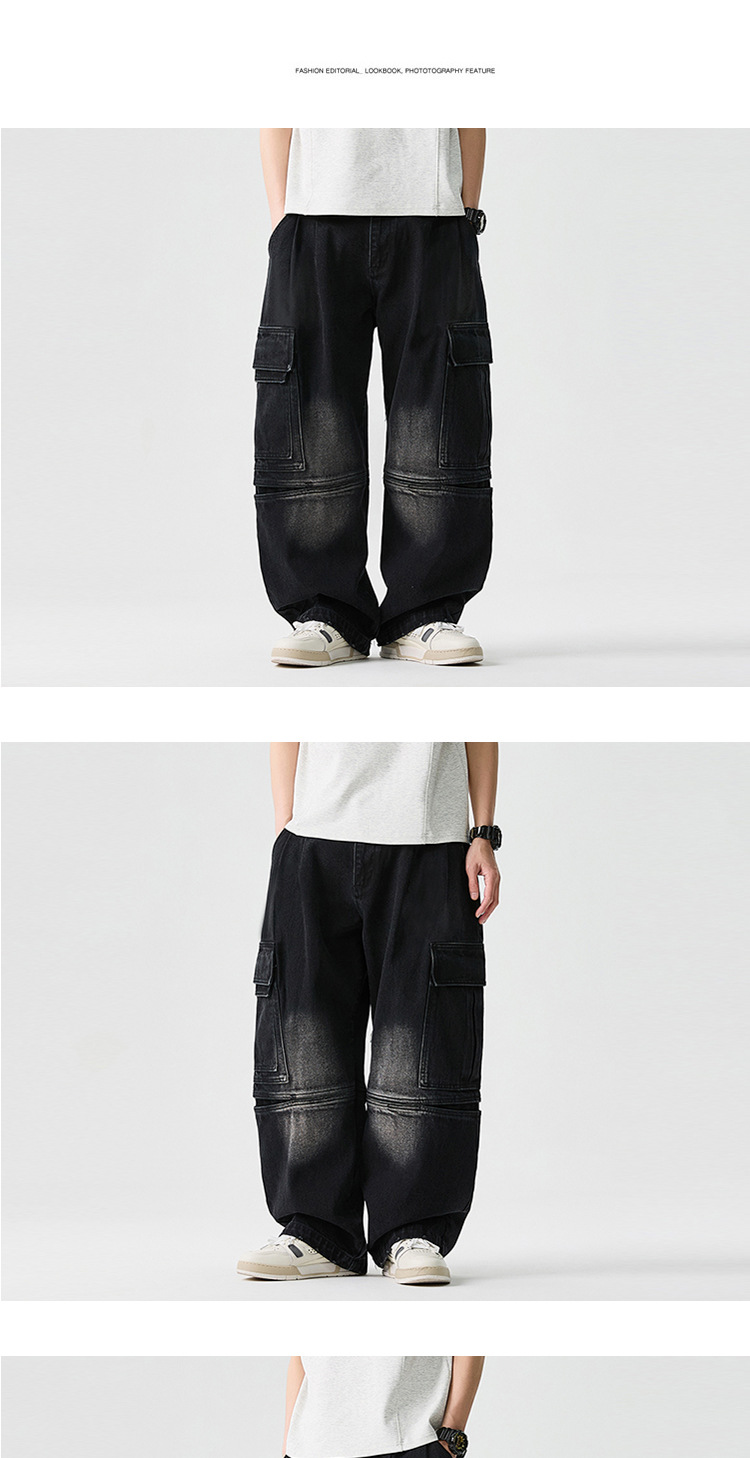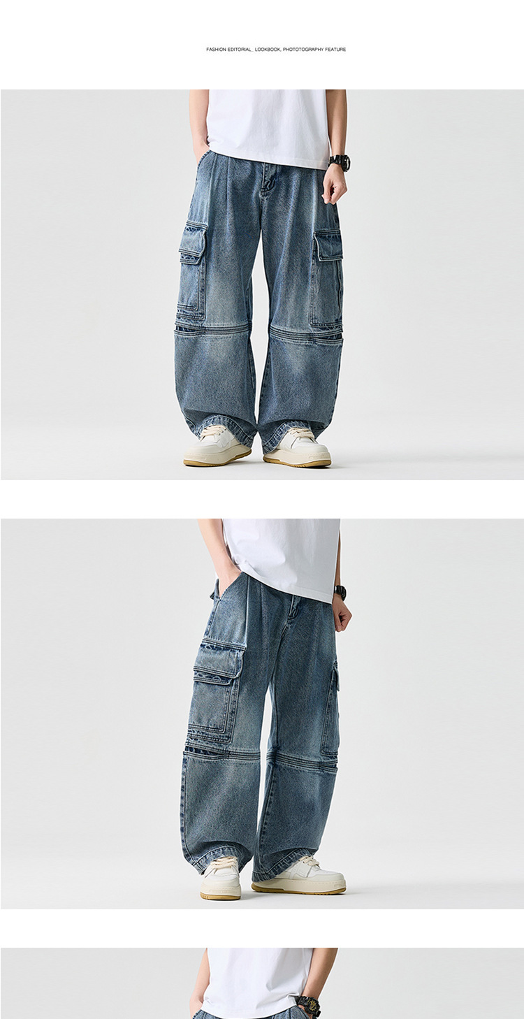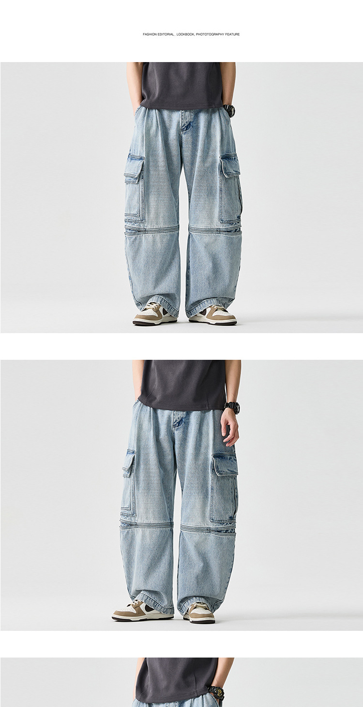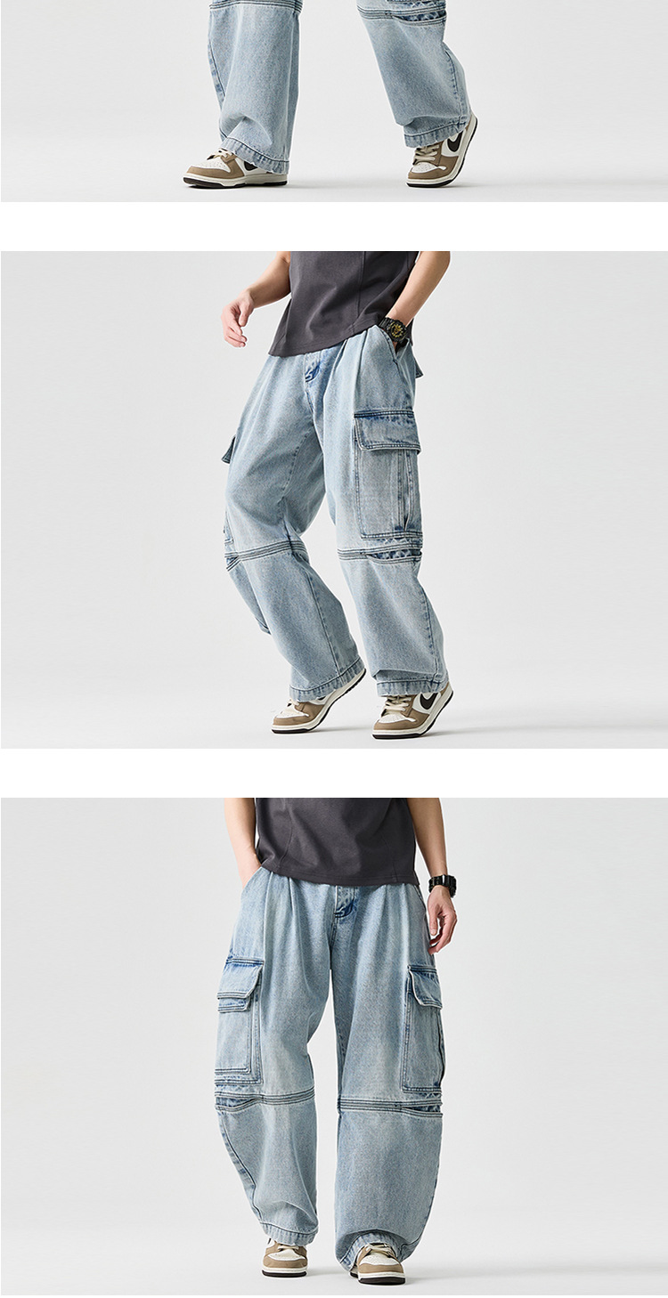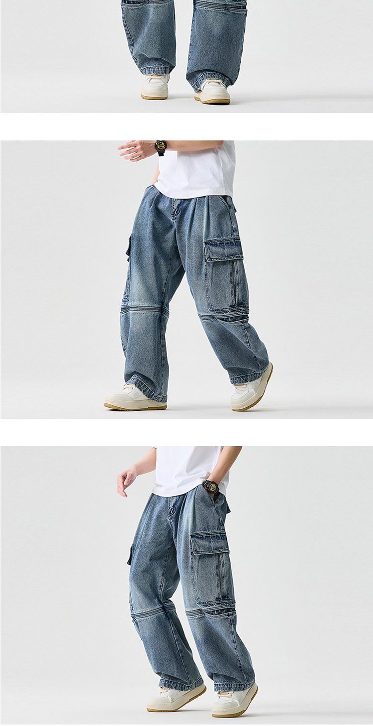 2025 여름 플러스 사이즈 일본식 미국 복고풍 하이 스트리트 작업복 청바지 캐주얼 바지 스플 라이스 멀티 포켓 남성 바지스토어 가기