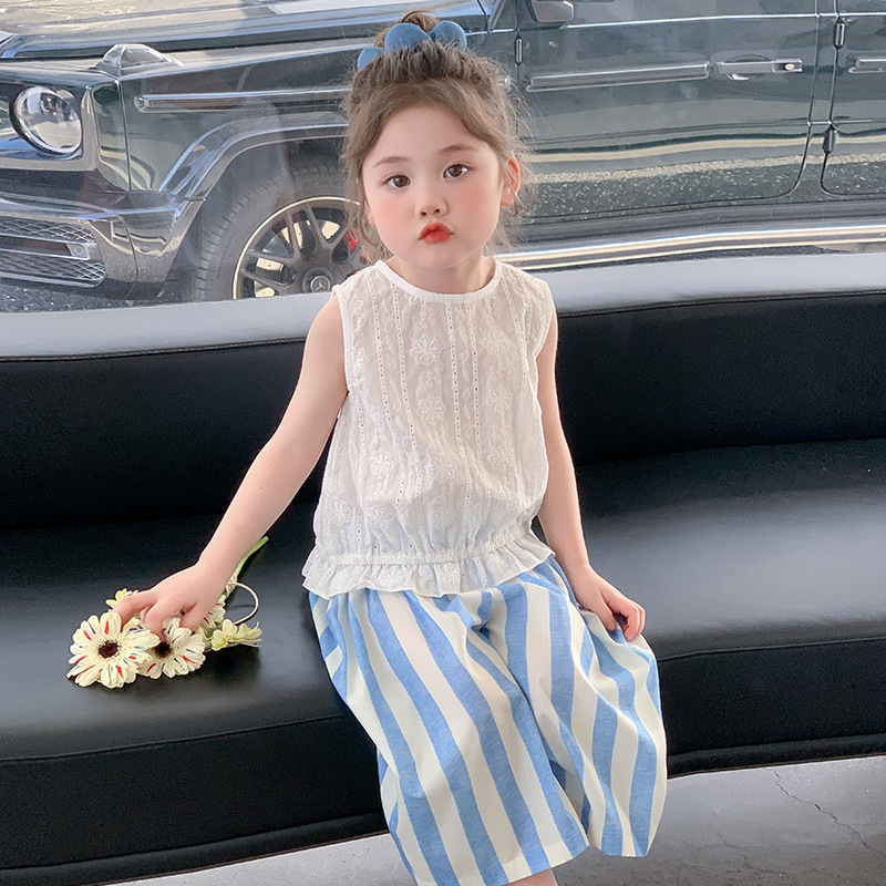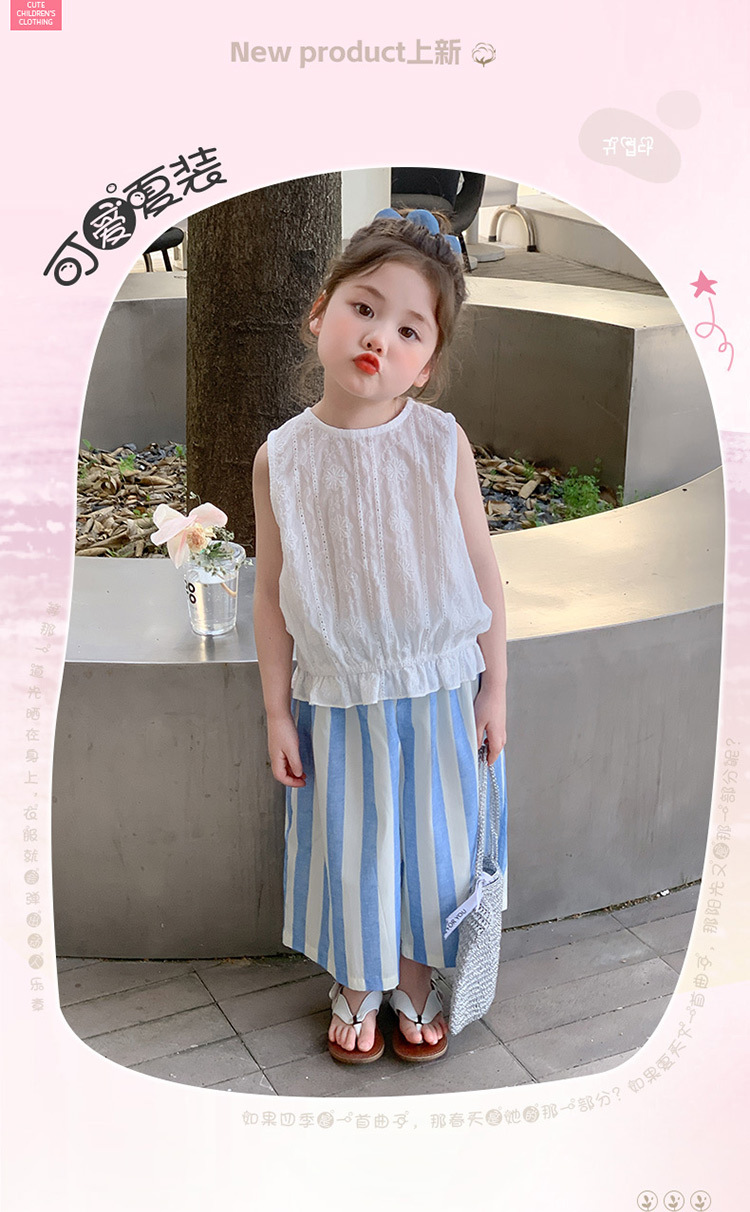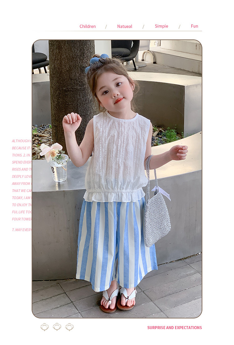 소녀 블루 수직 줄무늬 바지 세트 2025 여름 새로운 패션 소녀 세련된 투피스 어린이 여름 원피스