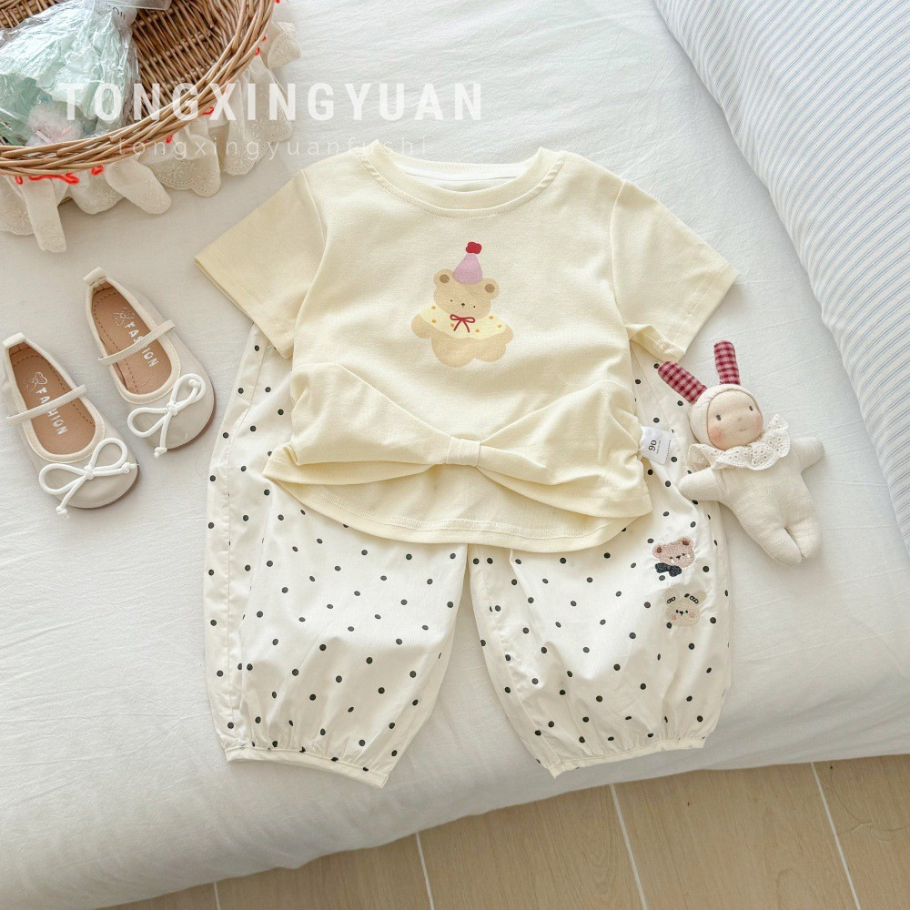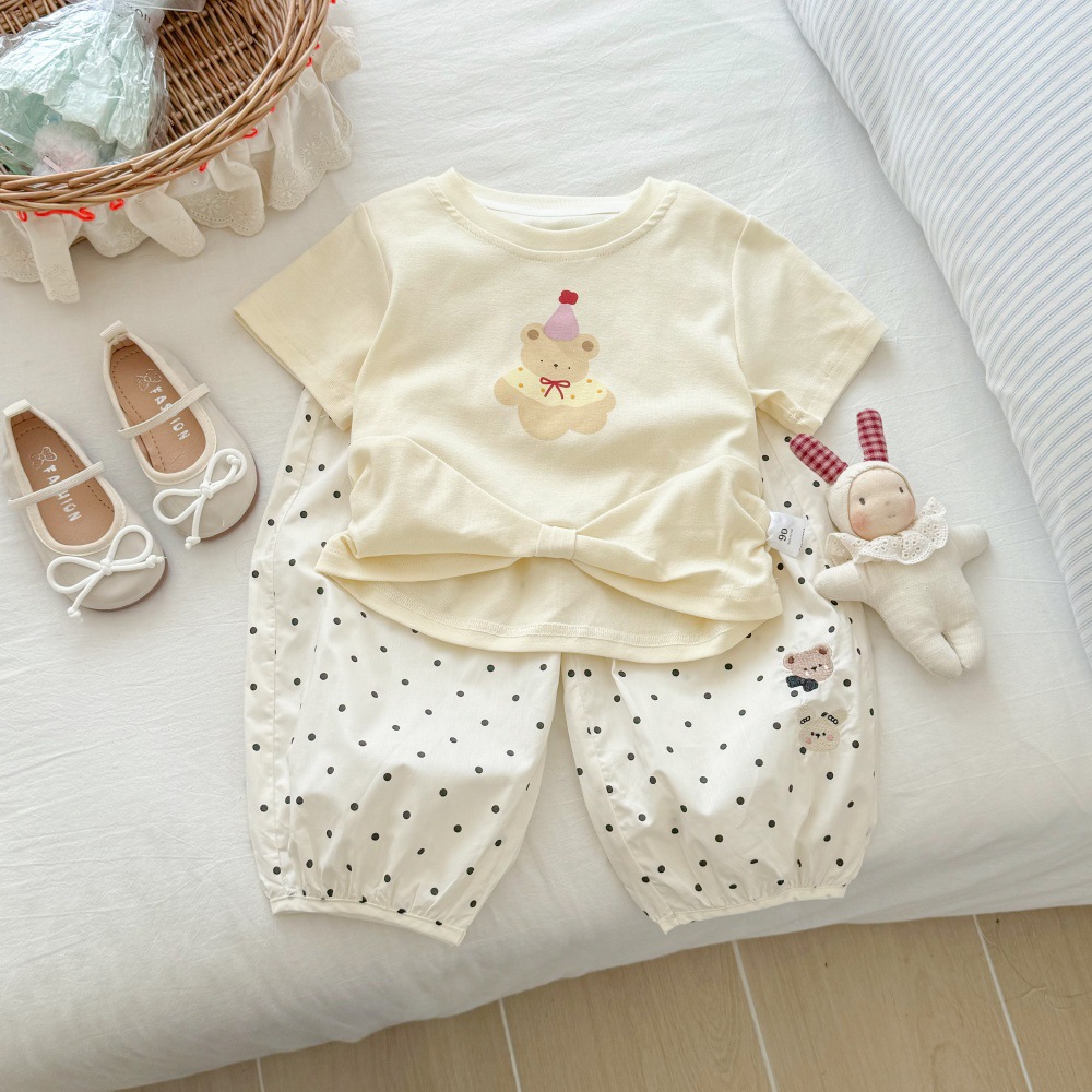 [두 조각] 심황 쿠키! 여성 아기 곰 반팔 티셔츠 폴로 도트 랜턴 바지 귀여운 세트 트렌디스토어 가기