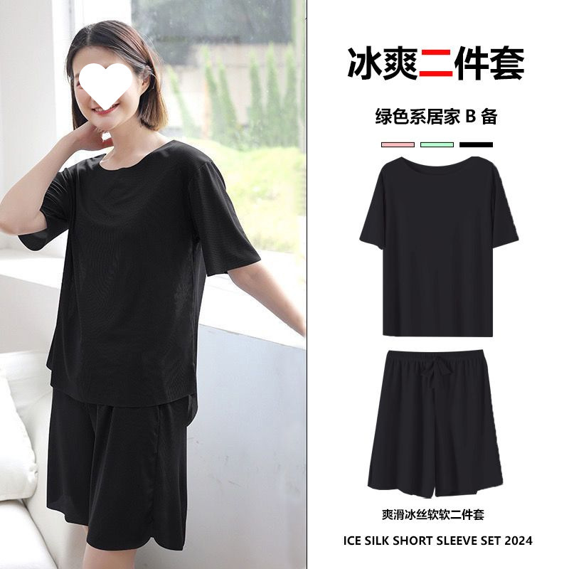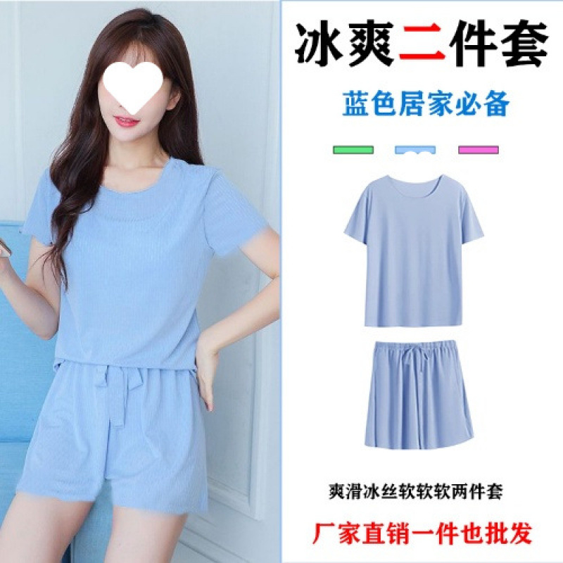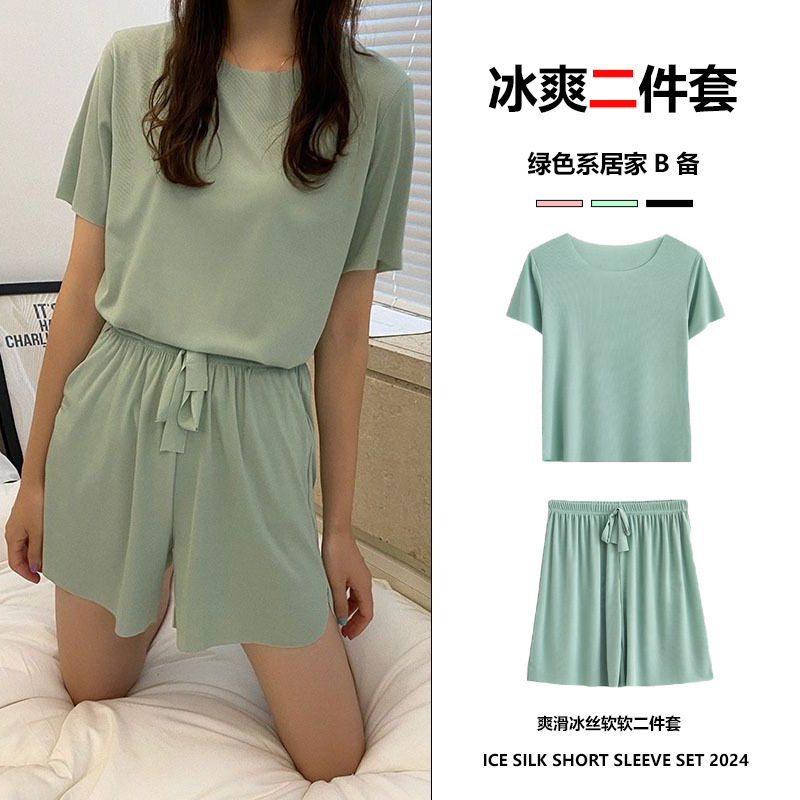 2025 년 여름 폭발 아이스 실크 잠옷 여성용 둥근 목 세트 얇은 느슨한 짧은 소매 반바지 투피스 여름 세트스토어 가기