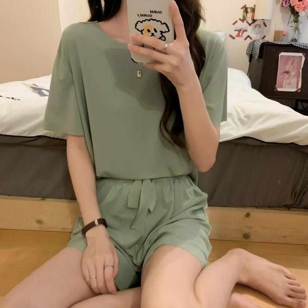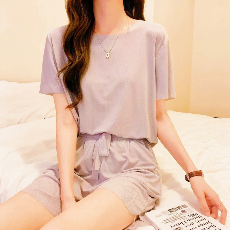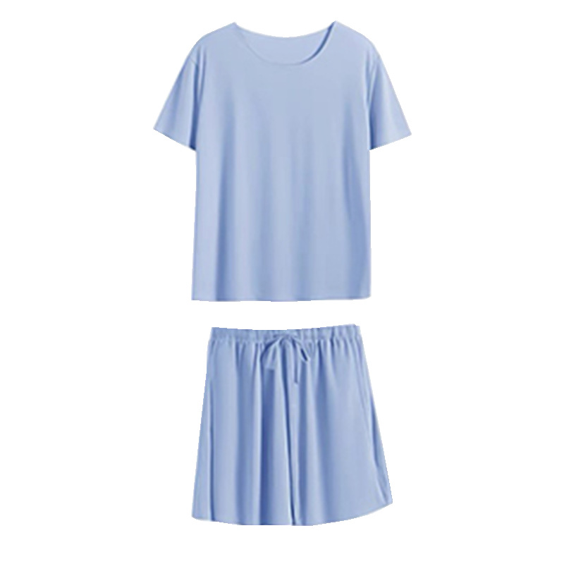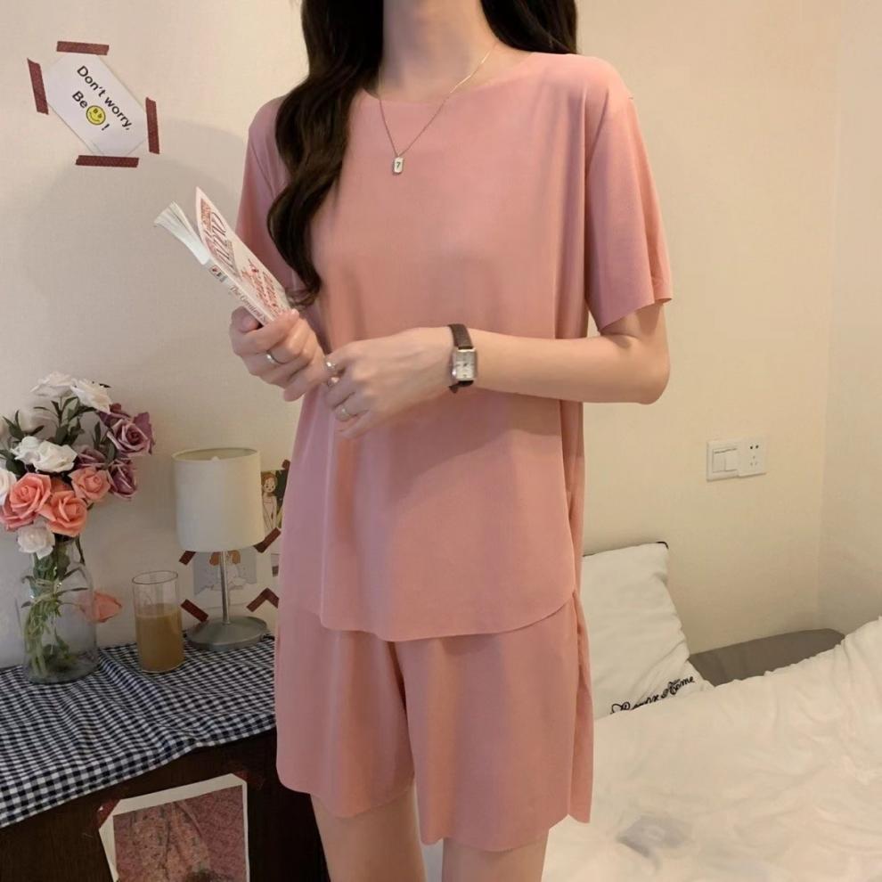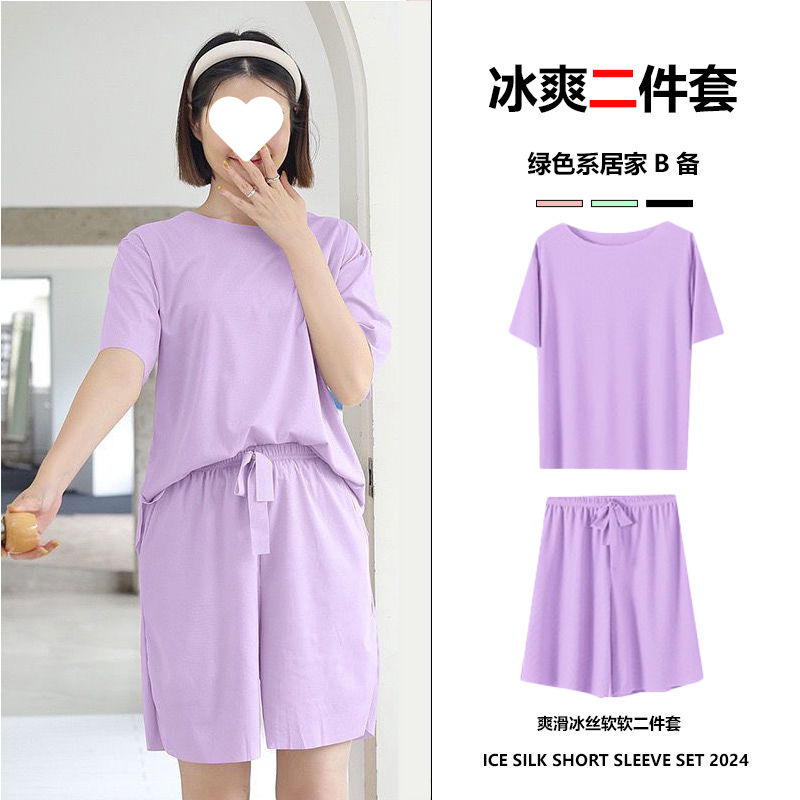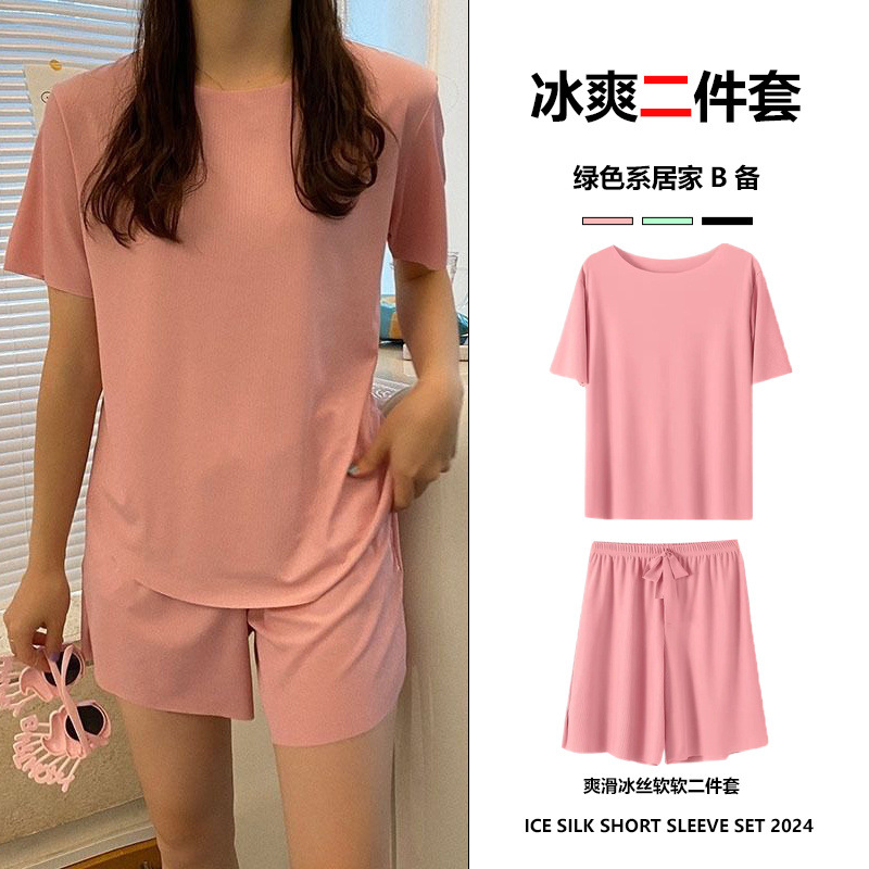 2025 년 여름 폭발 아이스 실크 잠옷 여성용 둥근 목 세트 얇은 느슨한 짧은 소매 반바지 투피스 여름 세트