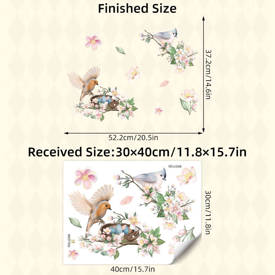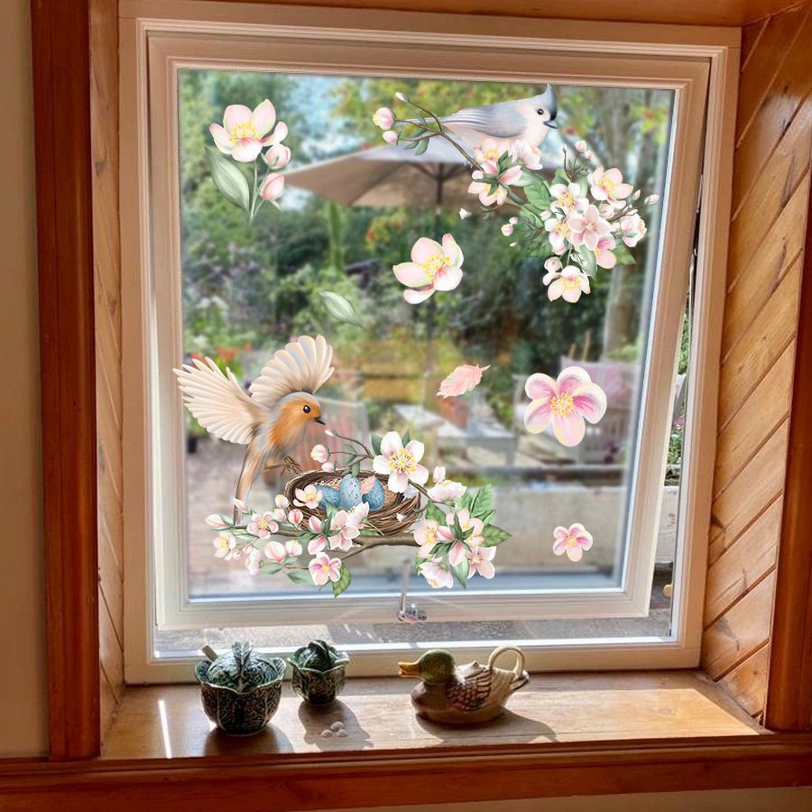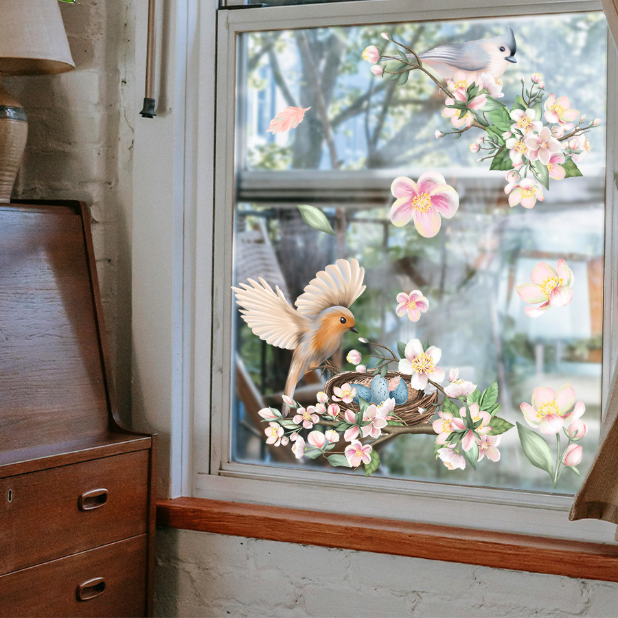 BR3715Q 그린 나뭇가지 새 식물 꽃 새 둥지 자체 접착 창 스티커 욕실 침실 장식 벽 스티커스토어 가기