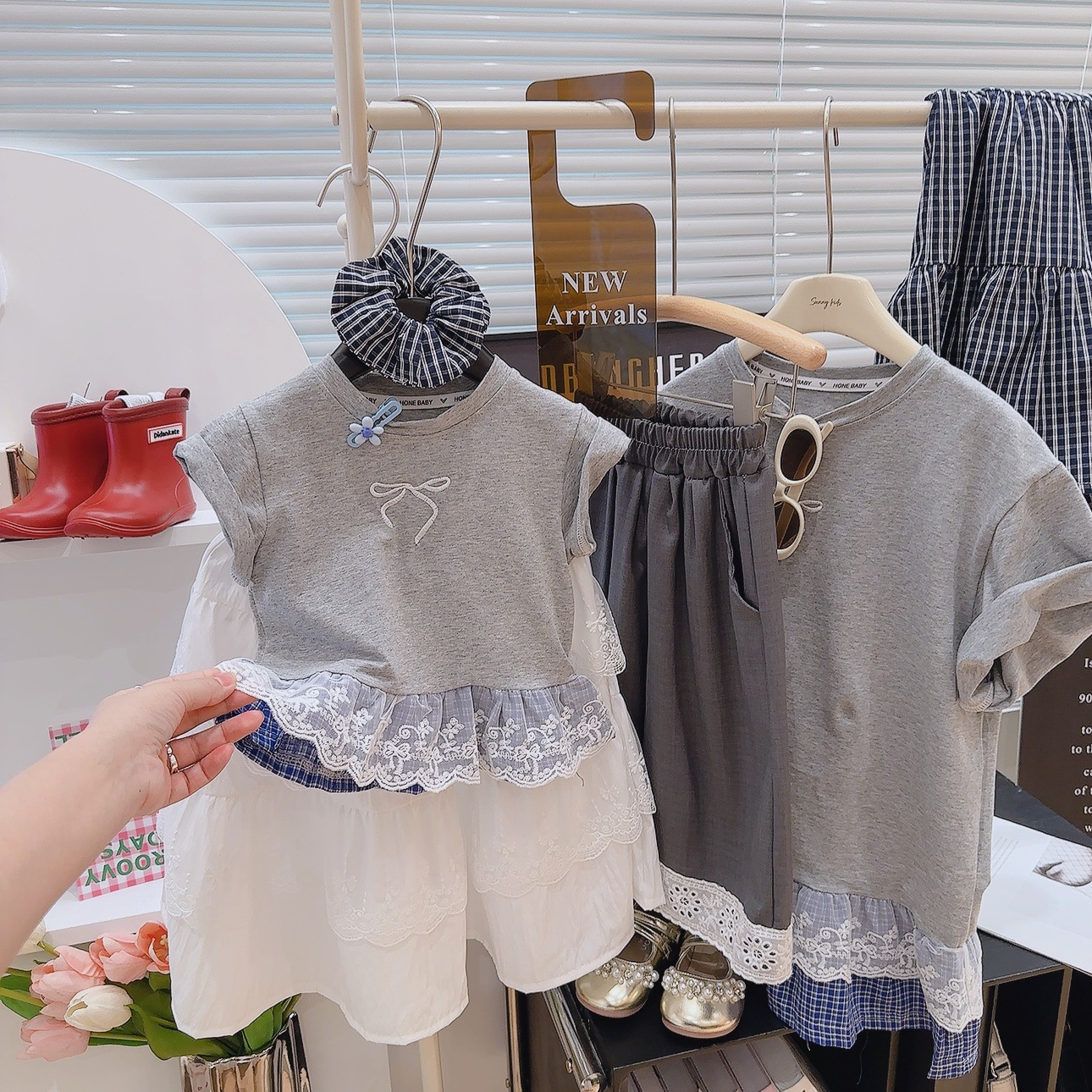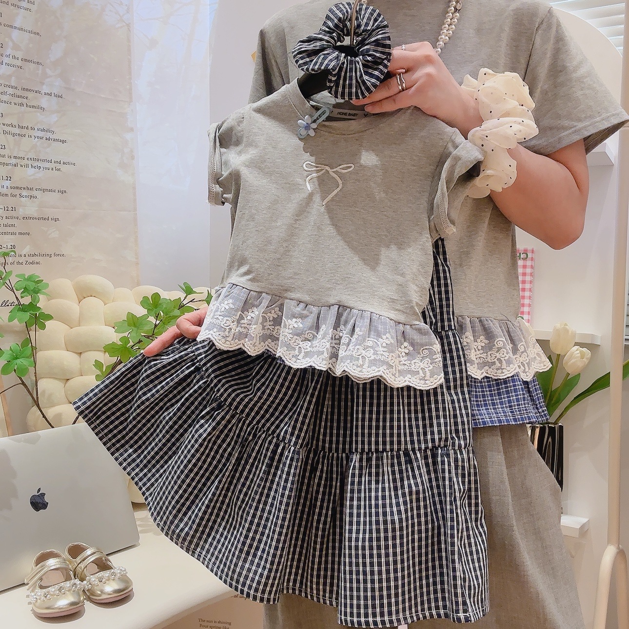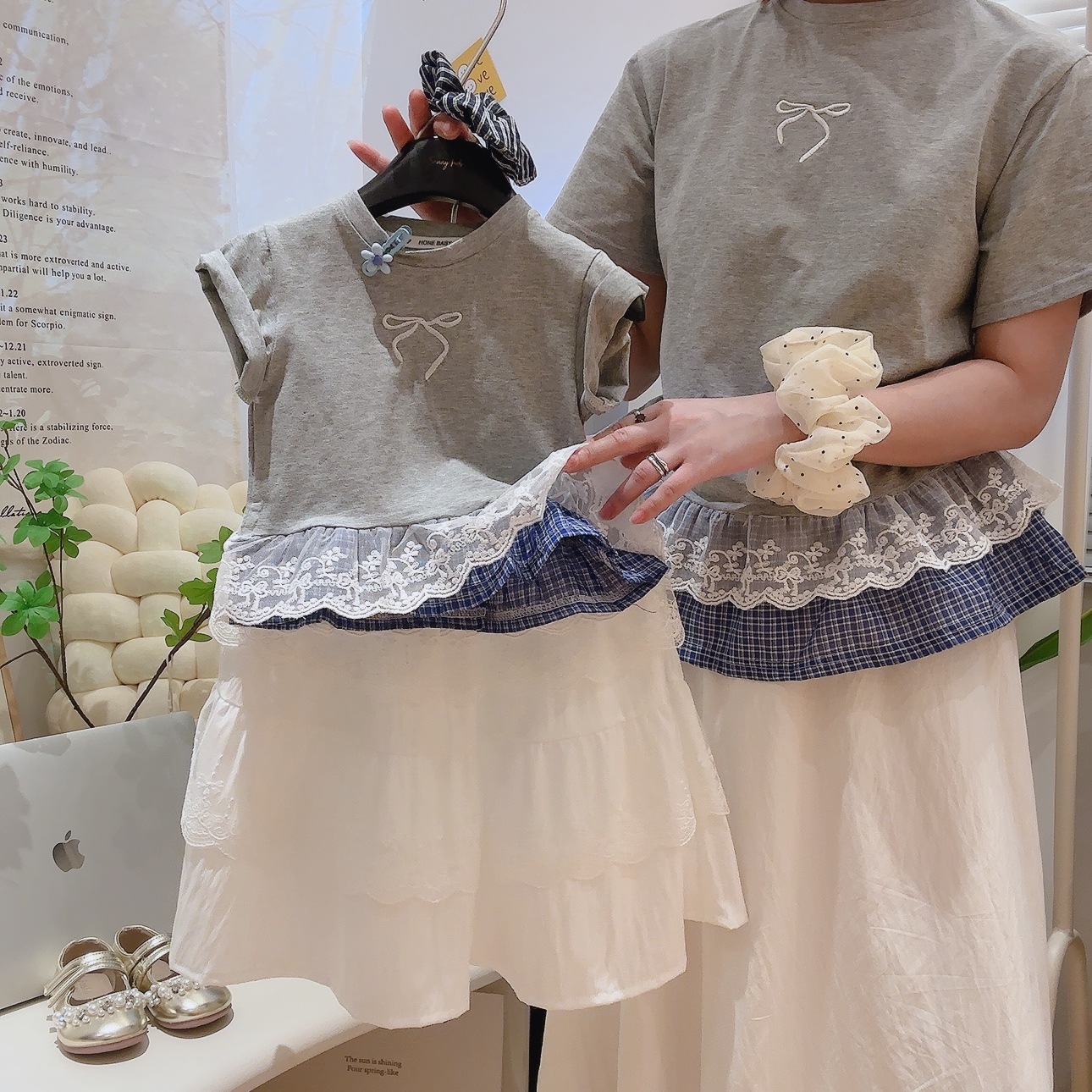 부모-자식 의류 여름 새로운 한국 스타일 아동 패션 자수 접합 레이스 반팔 티셔츠 조끼 가짜 투피스 서양식스토어 가기