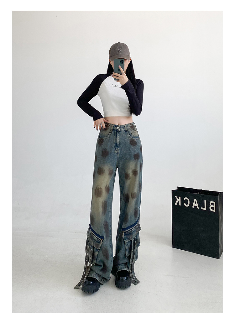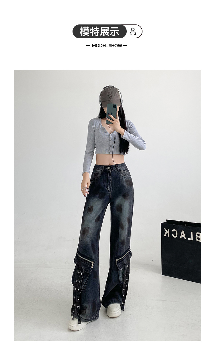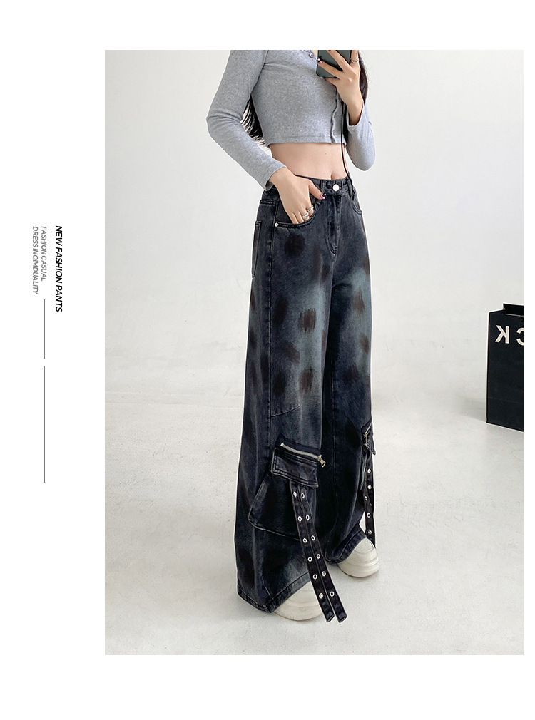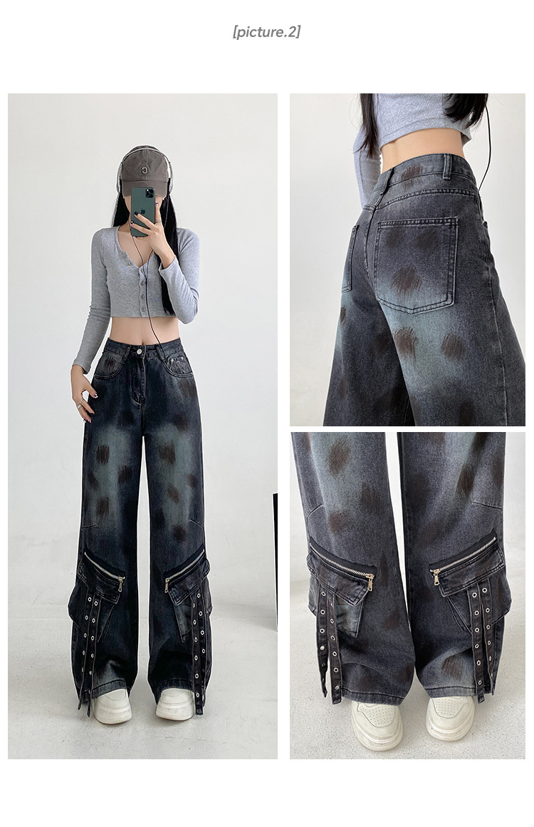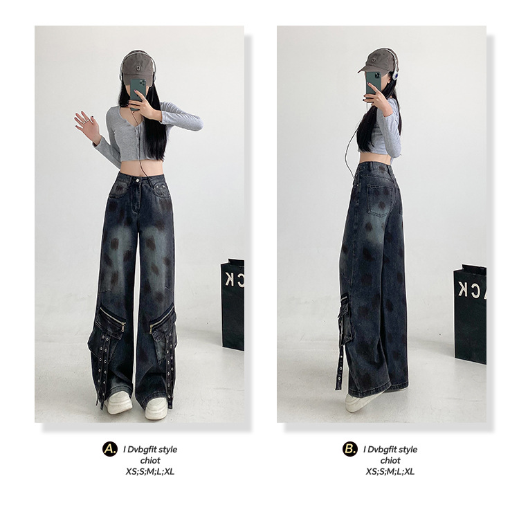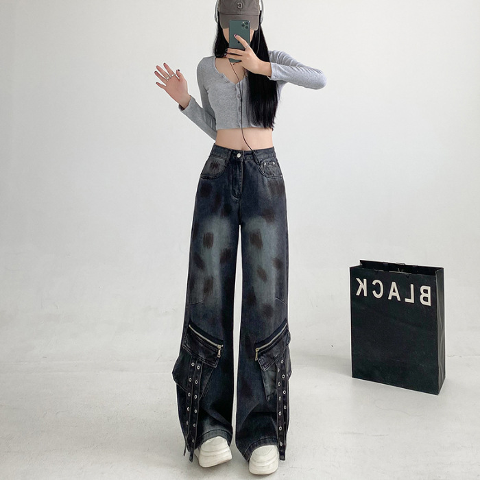 아메리칸 스타일 하이 스트리트 그래피티 멀티 포켓 블랙 툴링 청바지 여성의 2024 가을 새로운 느슨한 넓은 다리 바지스토어 가기
