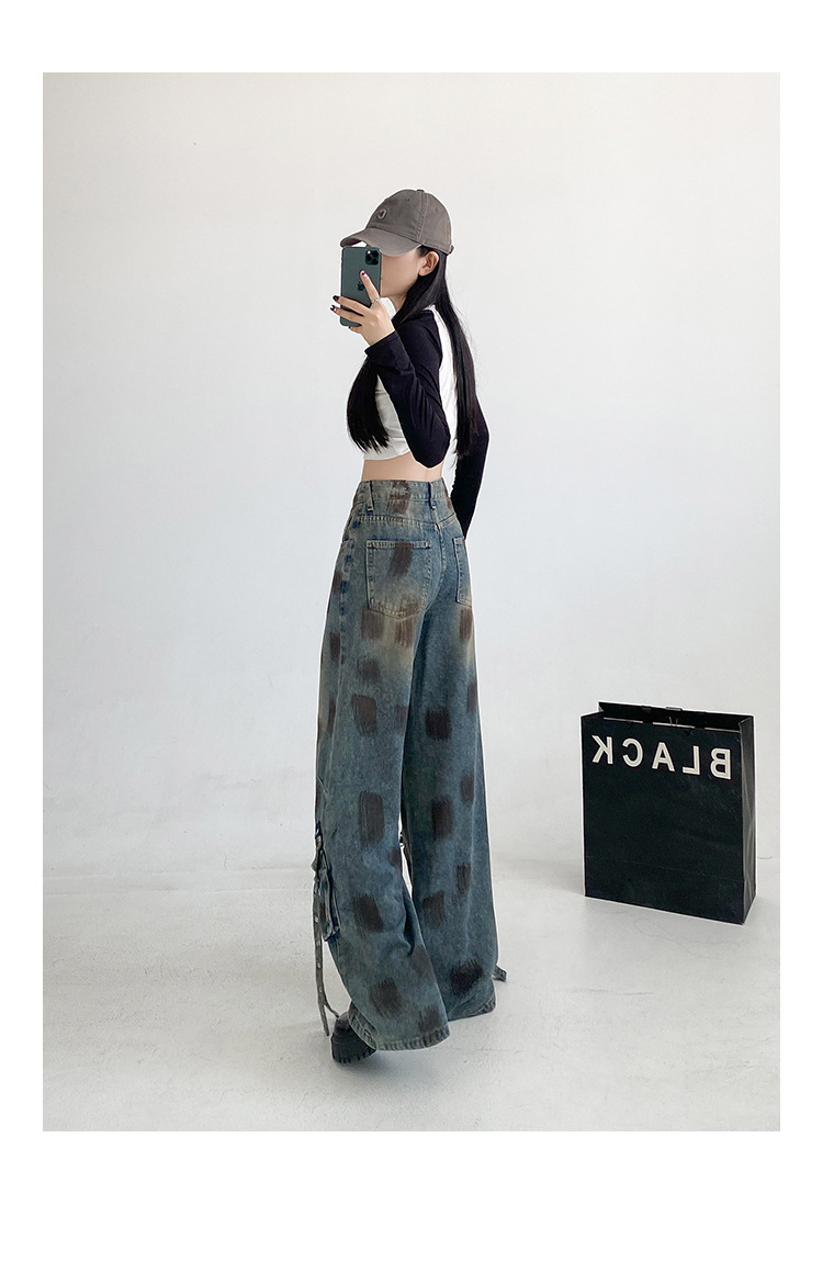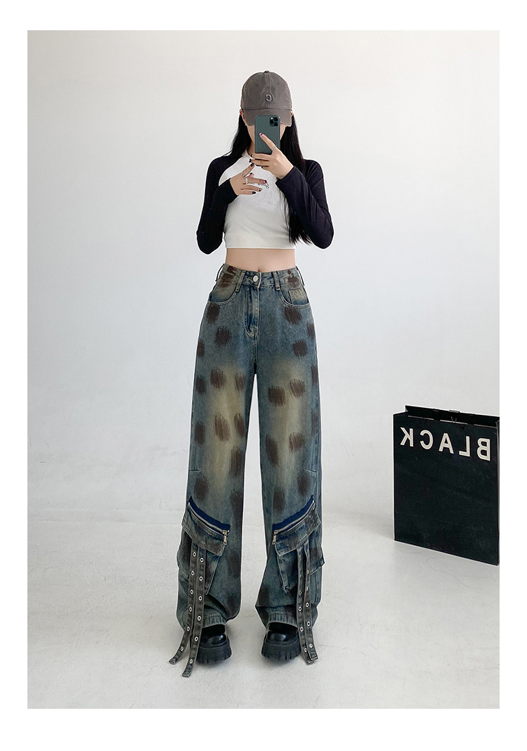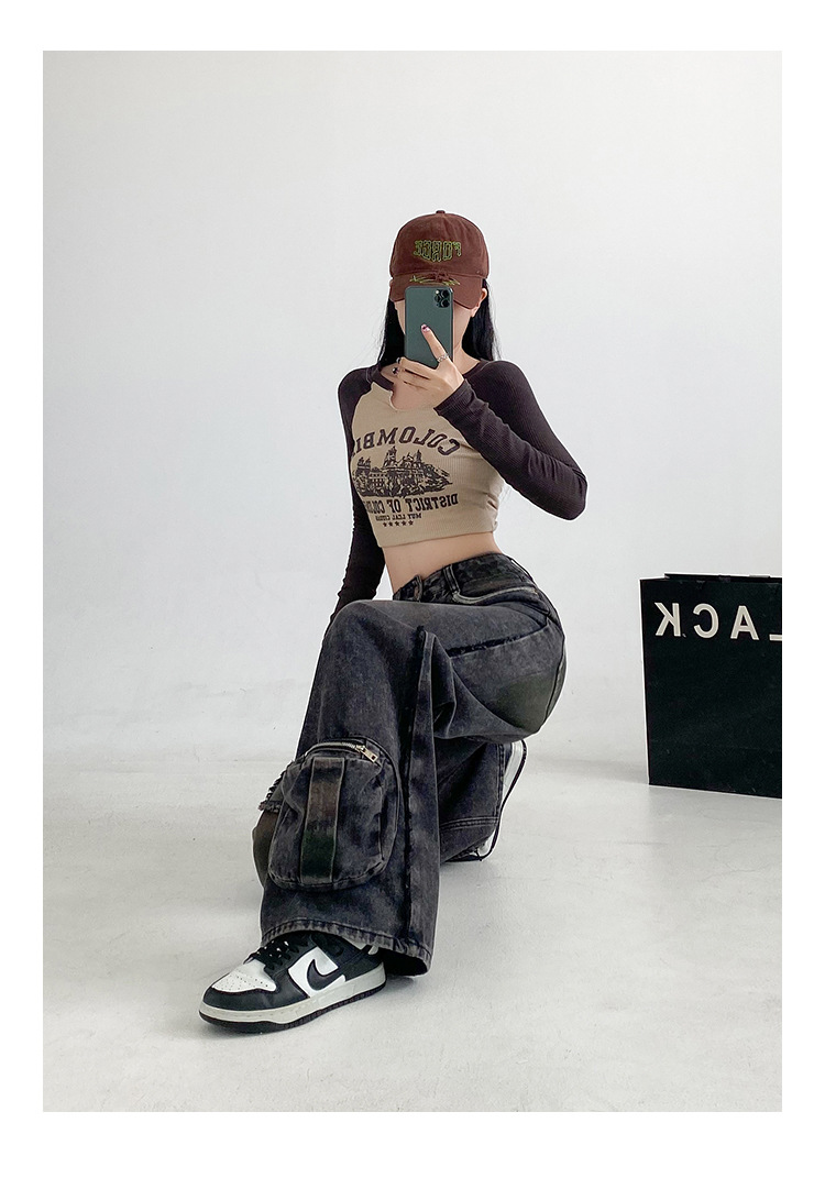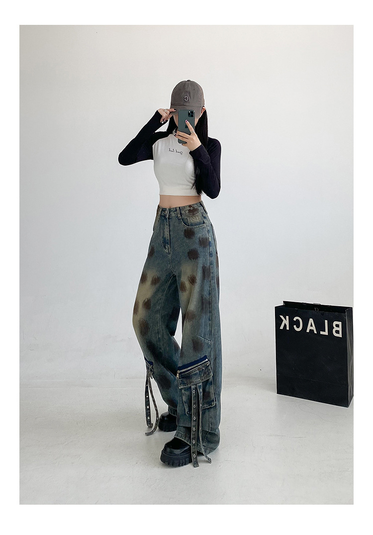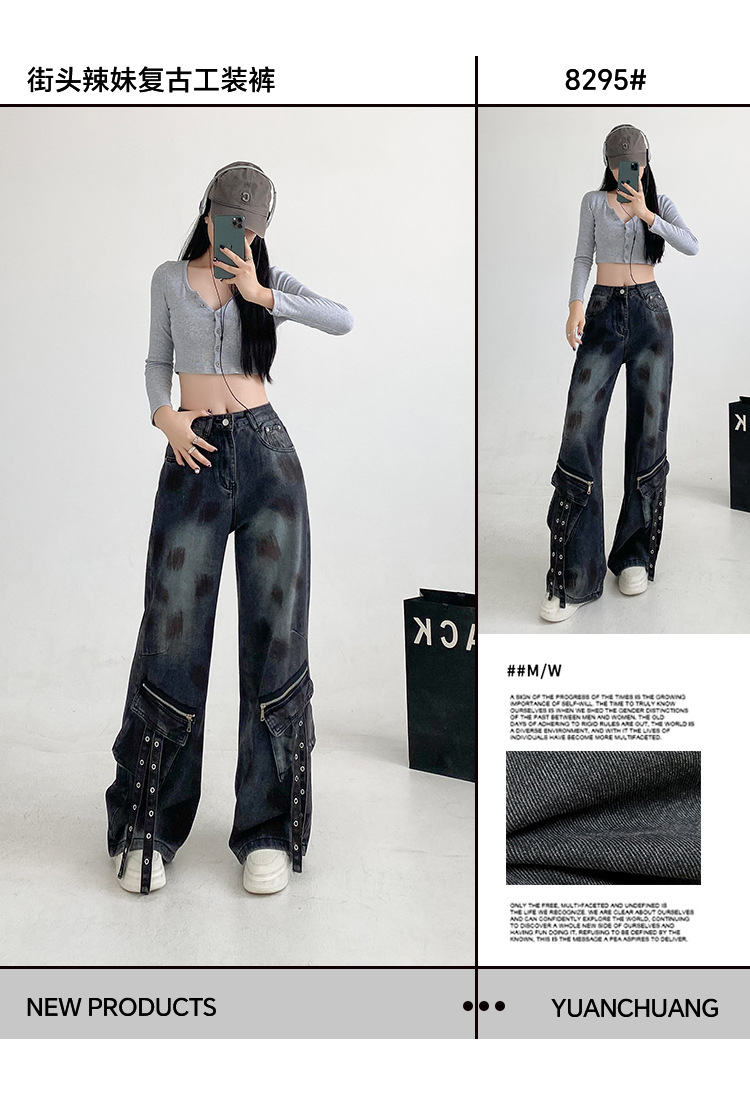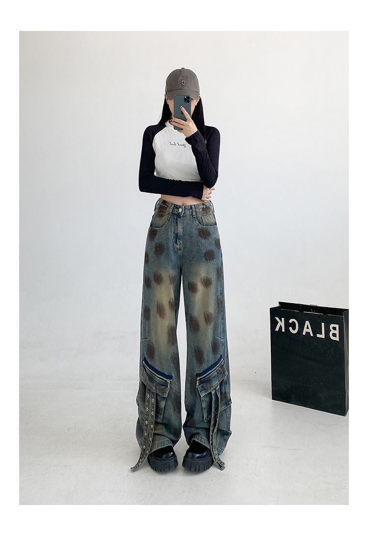 아메리칸 스타일 하이 스트리트 그래피티 멀티 포켓 블랙 툴링 청바지 여성의 2024 가을 새로운 느슨한 넓은 다리 바지스토어 가기