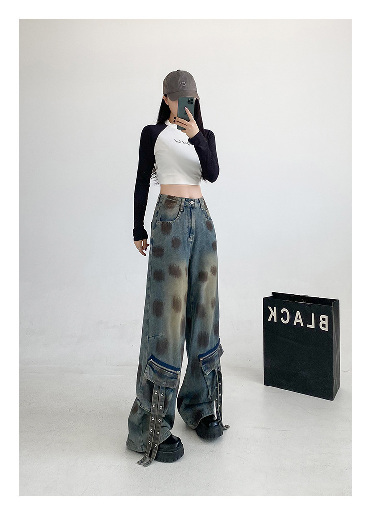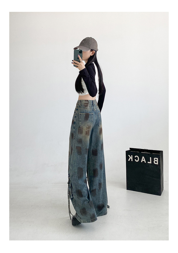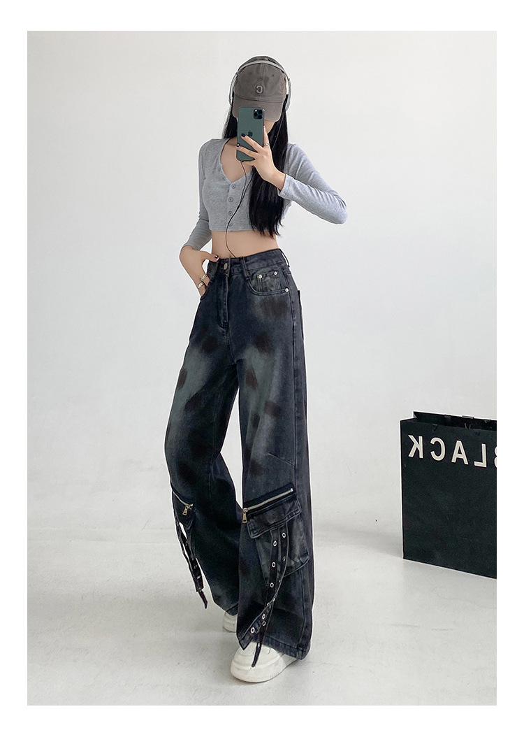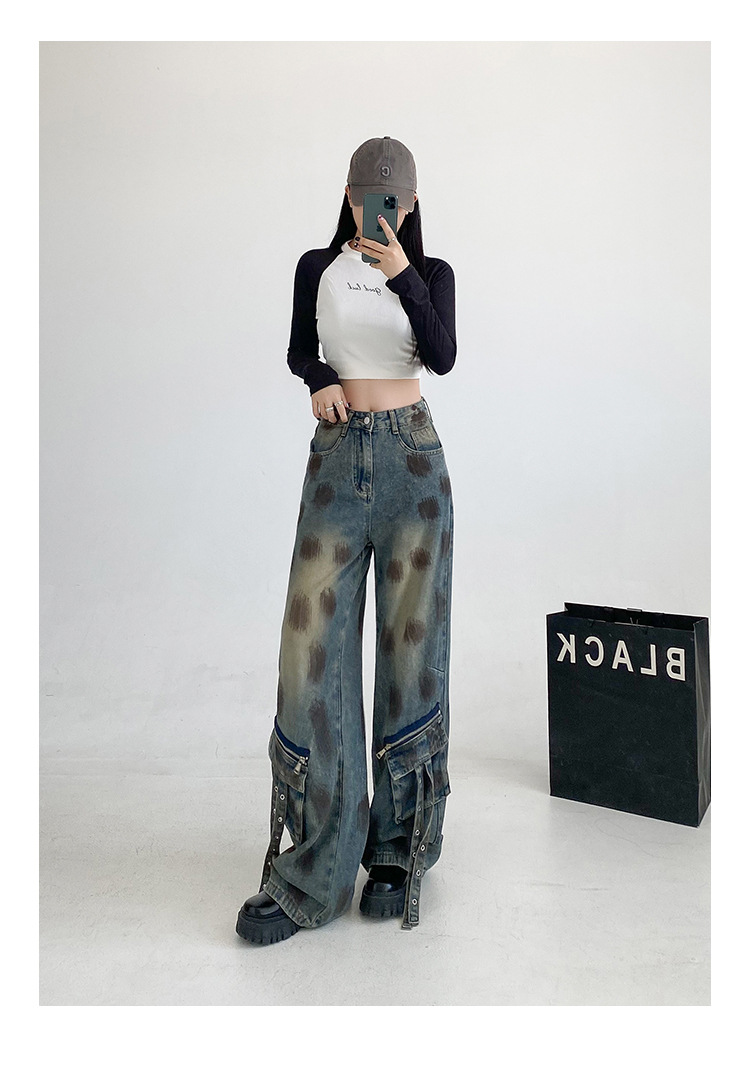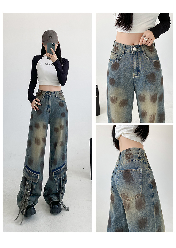 아메리칸 스타일 하이 스트리트 그래피티 멀티 포켓 블랙 툴링 청바지 여성의 2024 가을 새로운 느슨한 넓은 다리 바지스토어 가기