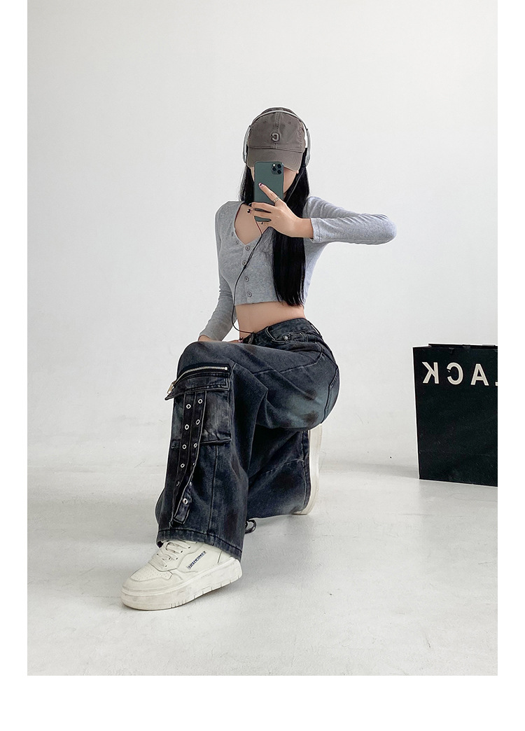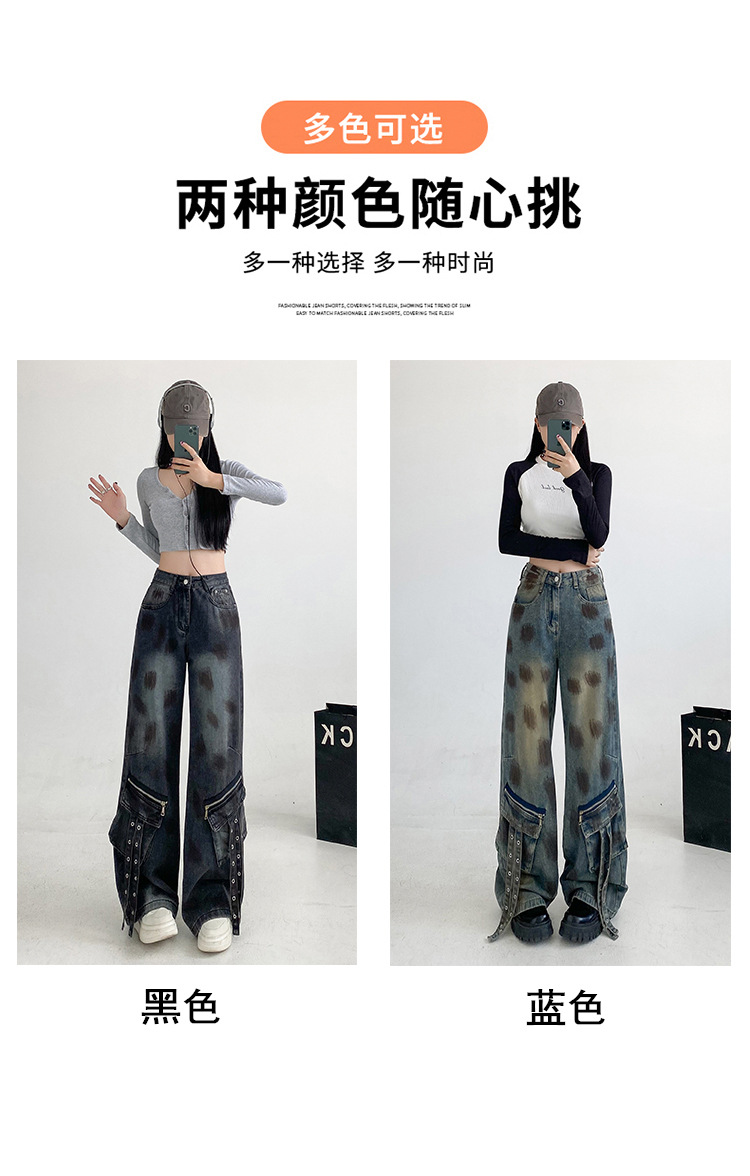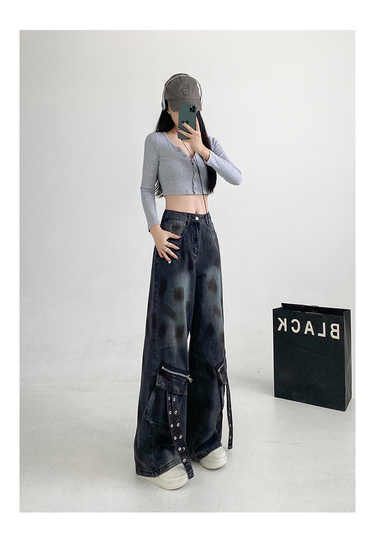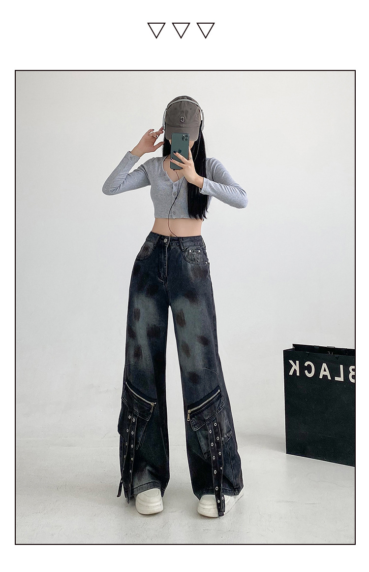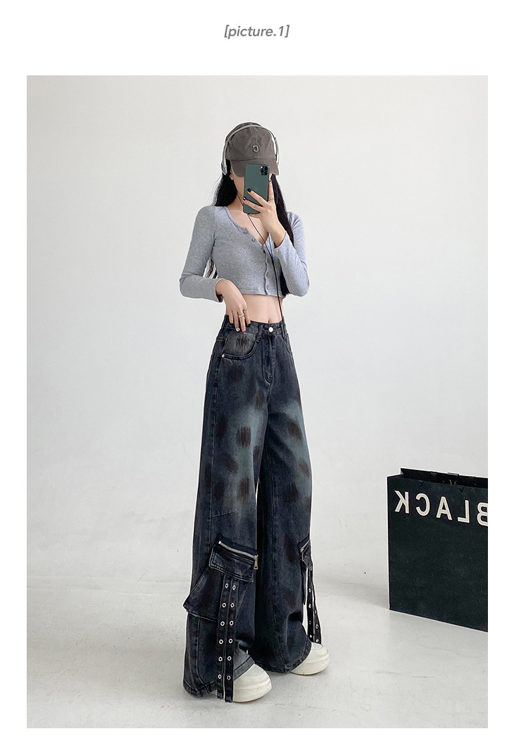 아메리칸 스타일 하이 스트리트 그래피티 멀티 포켓 블랙 툴링 청바지 여성의 2024 가을 새로운 느슨한 넓은 다리 바지