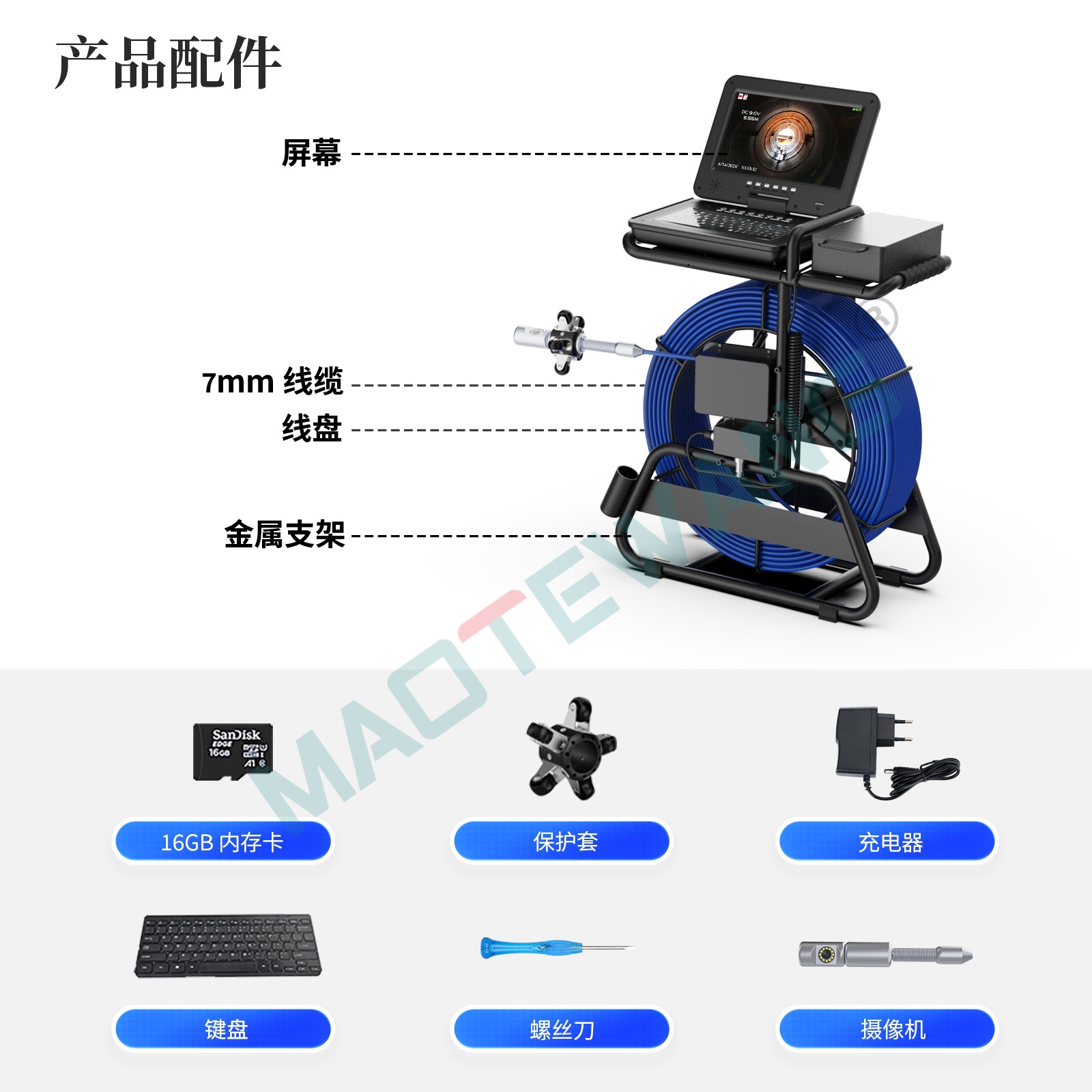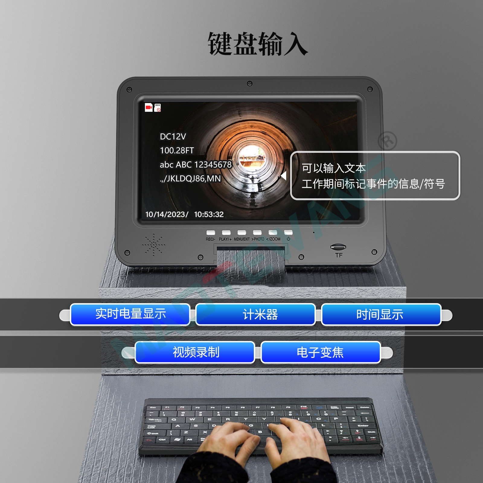 IPS 10.1寸带录像录音拍照,5倍电子变焦,键盘输入,直径32mm 旋转双探头,蓝宝石镜片,高清1080P,镜头角度145度,内置自平衡512HZ发射功能,80米管道内窥镜,4500MA内置电池,带电量显示,电子计米器,12个白光灯亮度可调,带1个摄像头保护套。