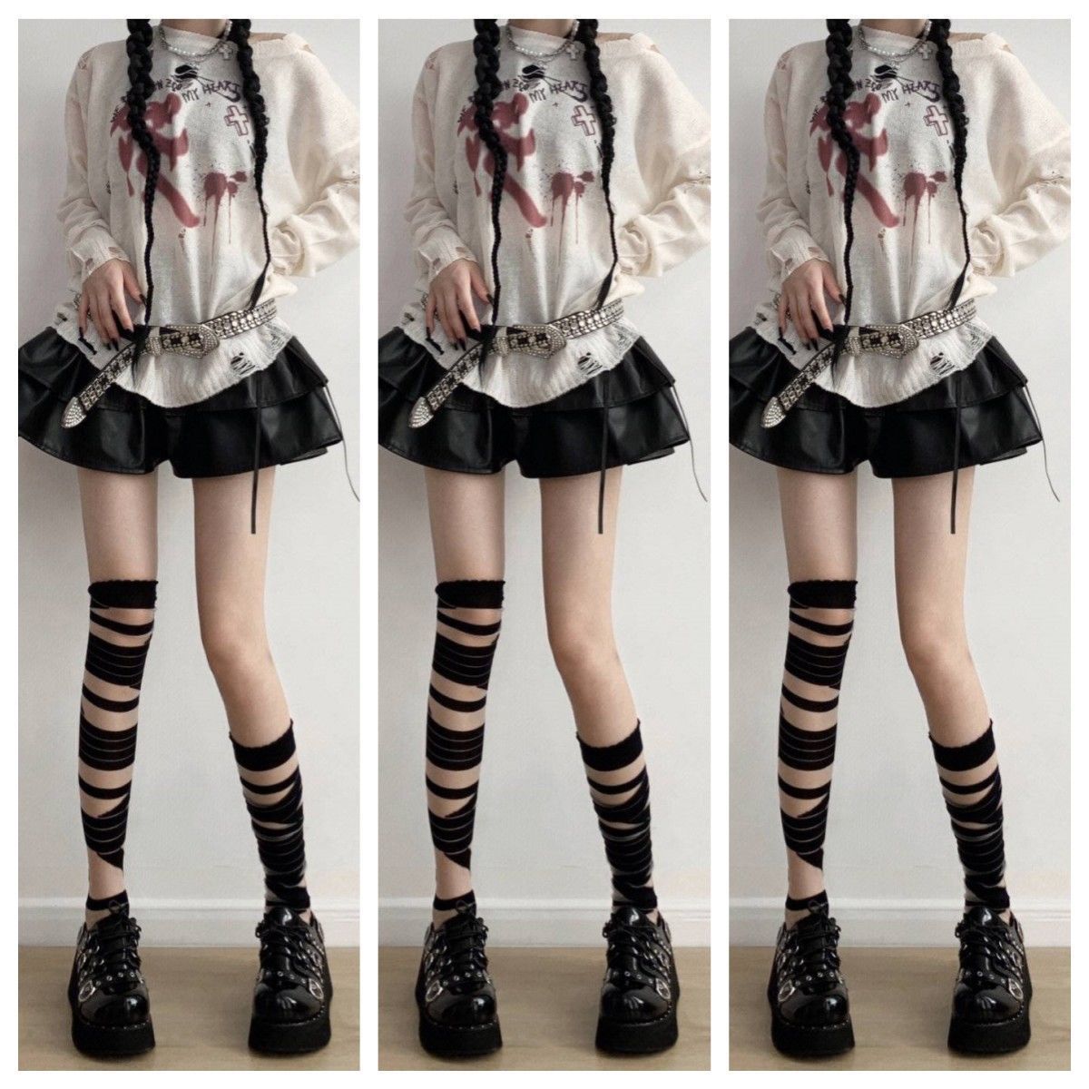 스트랩 양말 y2k 하위 문화 핫 소녀 흑백 붕대 긴 무릎 위 스타킹 여성 로리타 양말 얇은 스타일