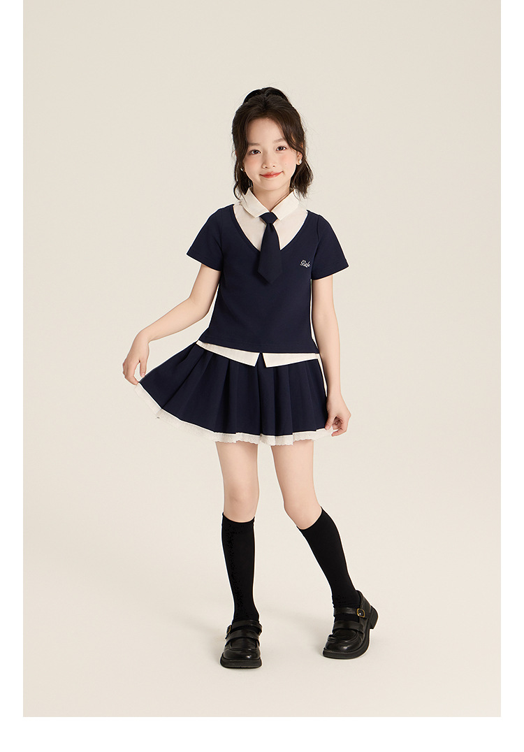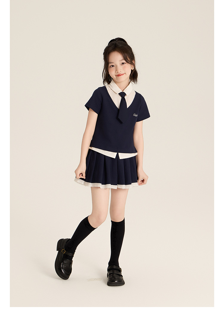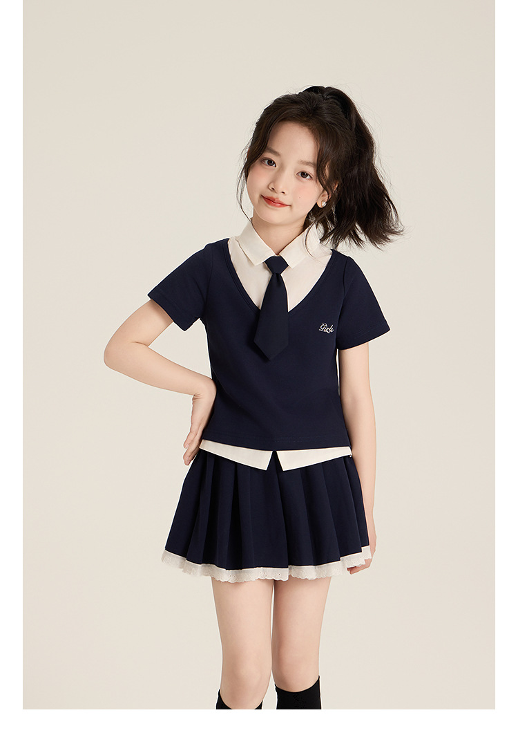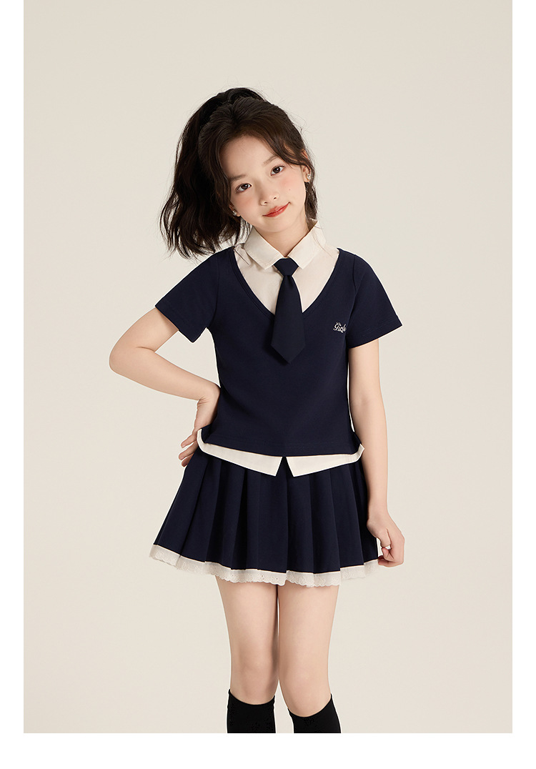 Amybaby Girls 세트 2025 년 여름 새로운 한국식 대학 가짜 투피스 탑 스커트 자수 세트