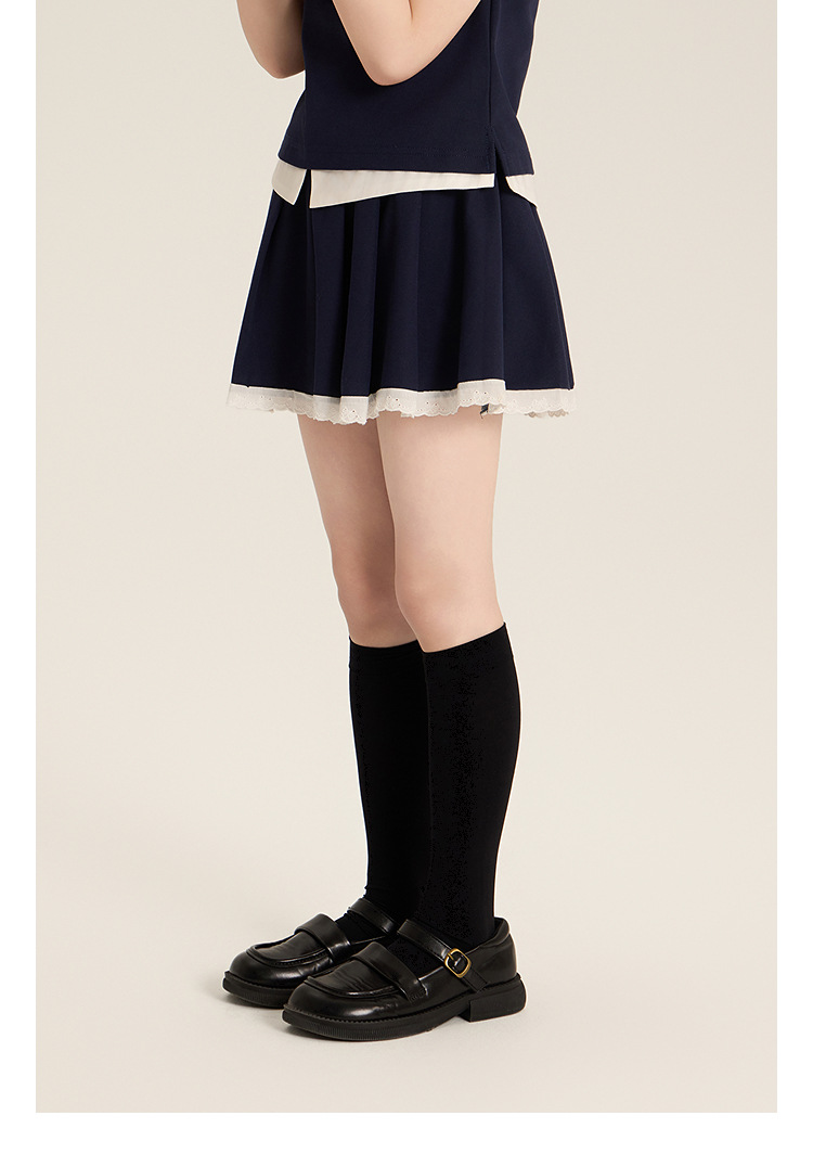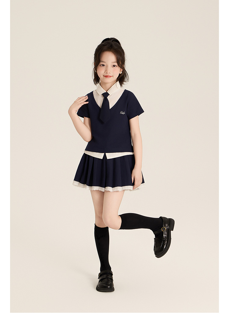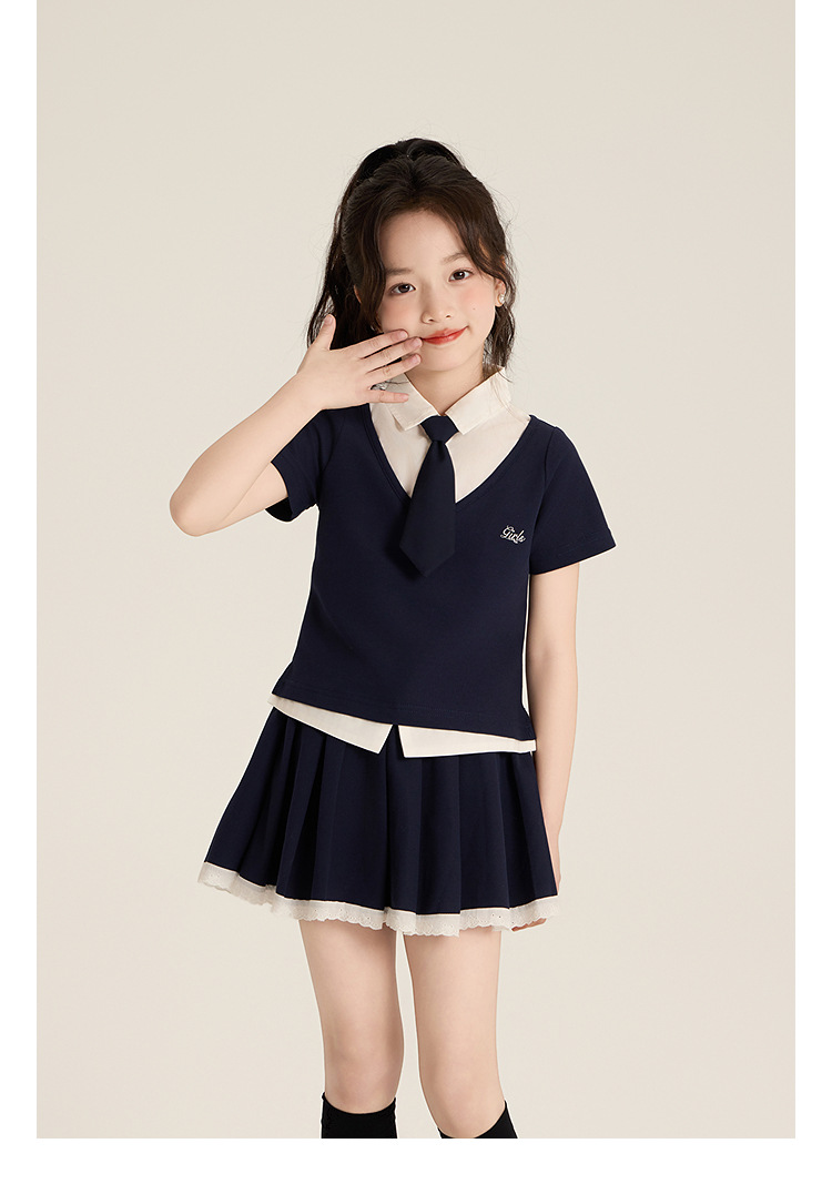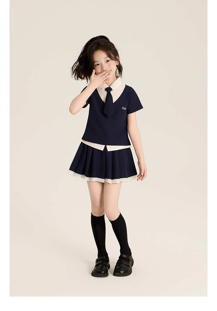 Amybaby Girls 세트 2025 년 여름 새로운 한국식 대학 가짜 투피스 탑 스커트 자수 세트