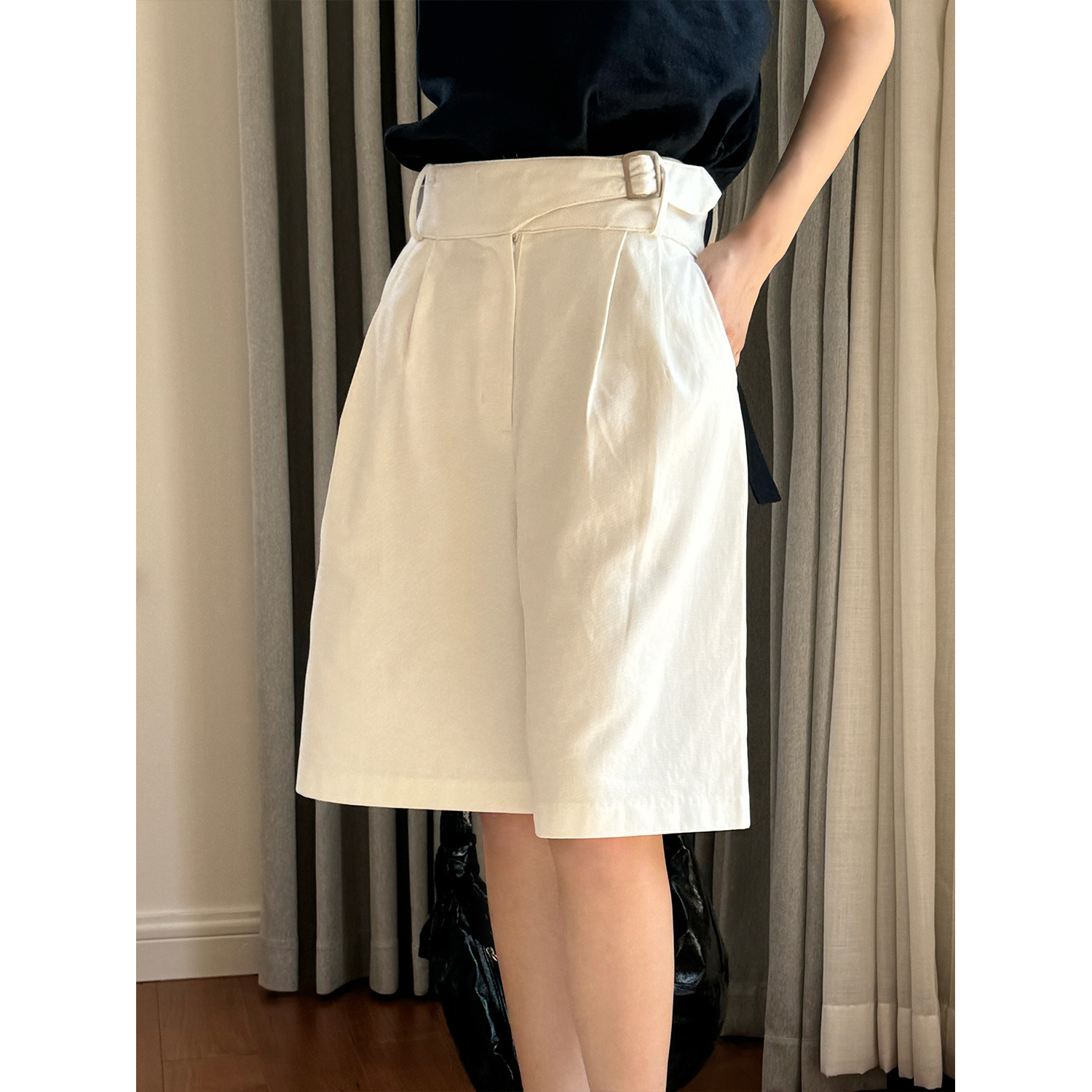 루브르 여름 신작 한국식 통근 더블 플리츠 대각선 버튼 하이웨이스트 스트레이트 팬츠 루즈 슬리밍 캐주얼 여성용 5부 팬츠